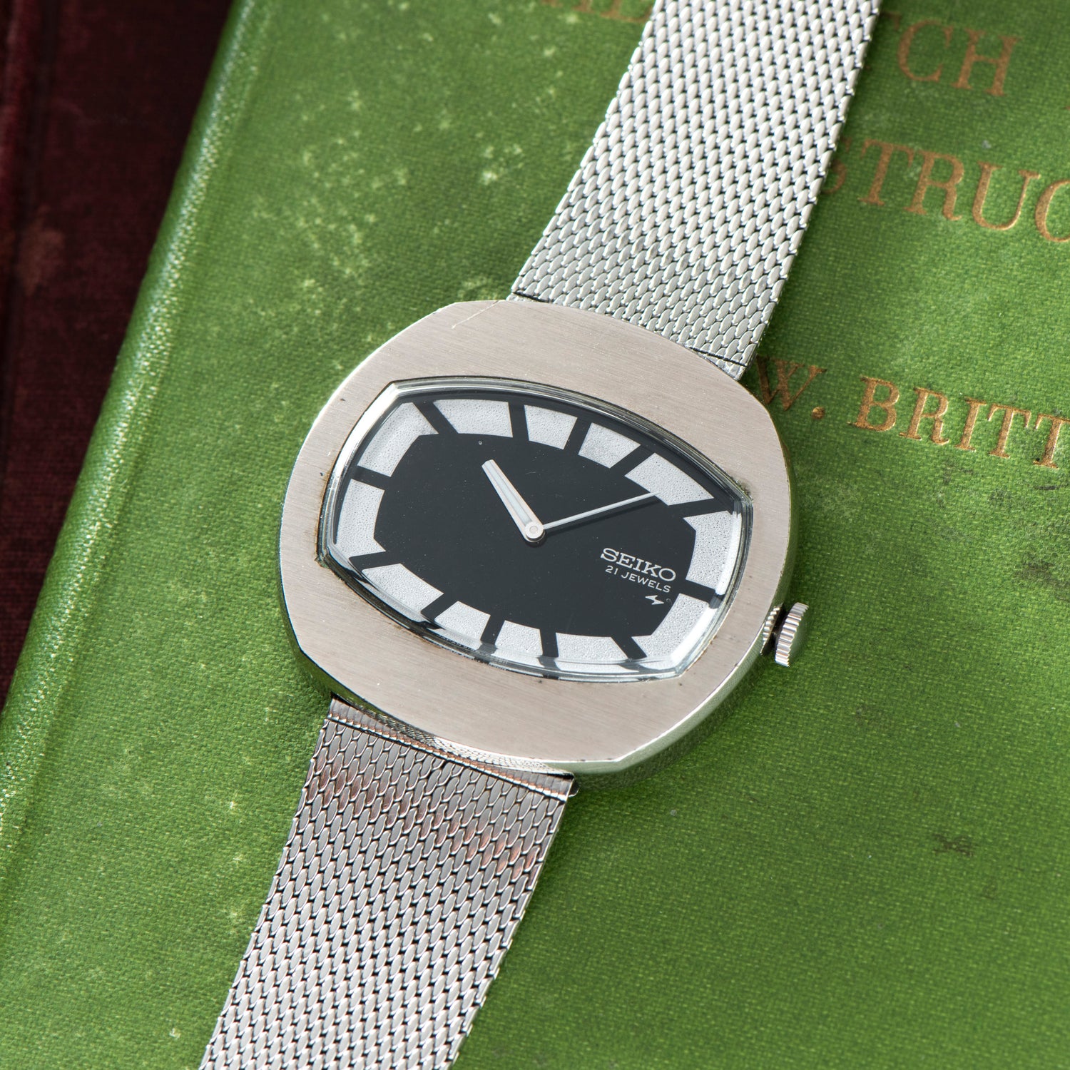 Powered by a hand-wound Seiko movement and paired to a cool stainless steel mesh bracelet with a signed buckle, this unconventional TV-shaped watch — or, to our minds, 'Daft Punk' helmet-shaped watch! — is ready for prime time, and for a new owner. Dig those cool '70s looks? Then this is the perfect piece for you!