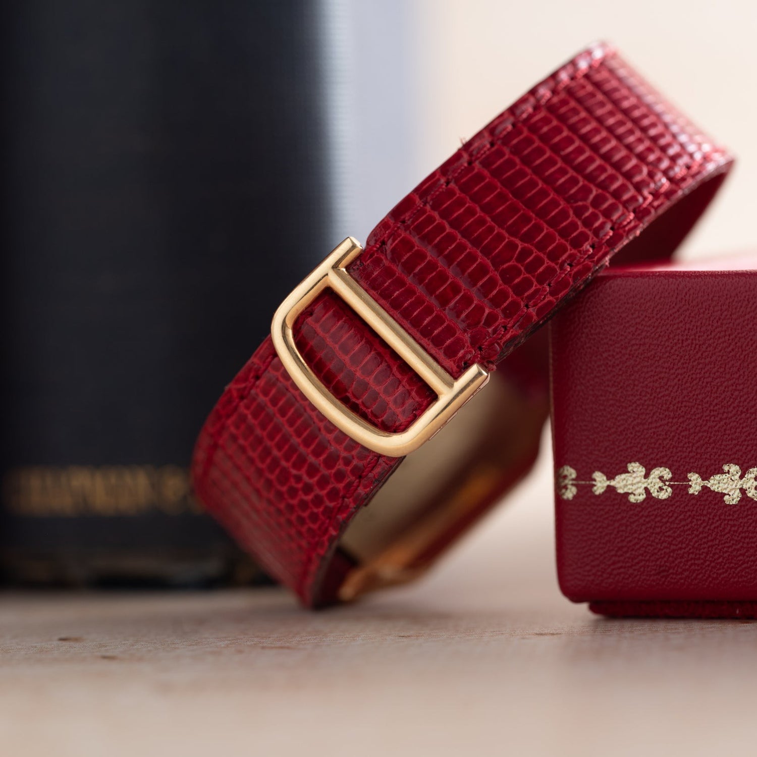 Set on a red lizard strap and finished with a mineral crystal, this Santos was born to wow!