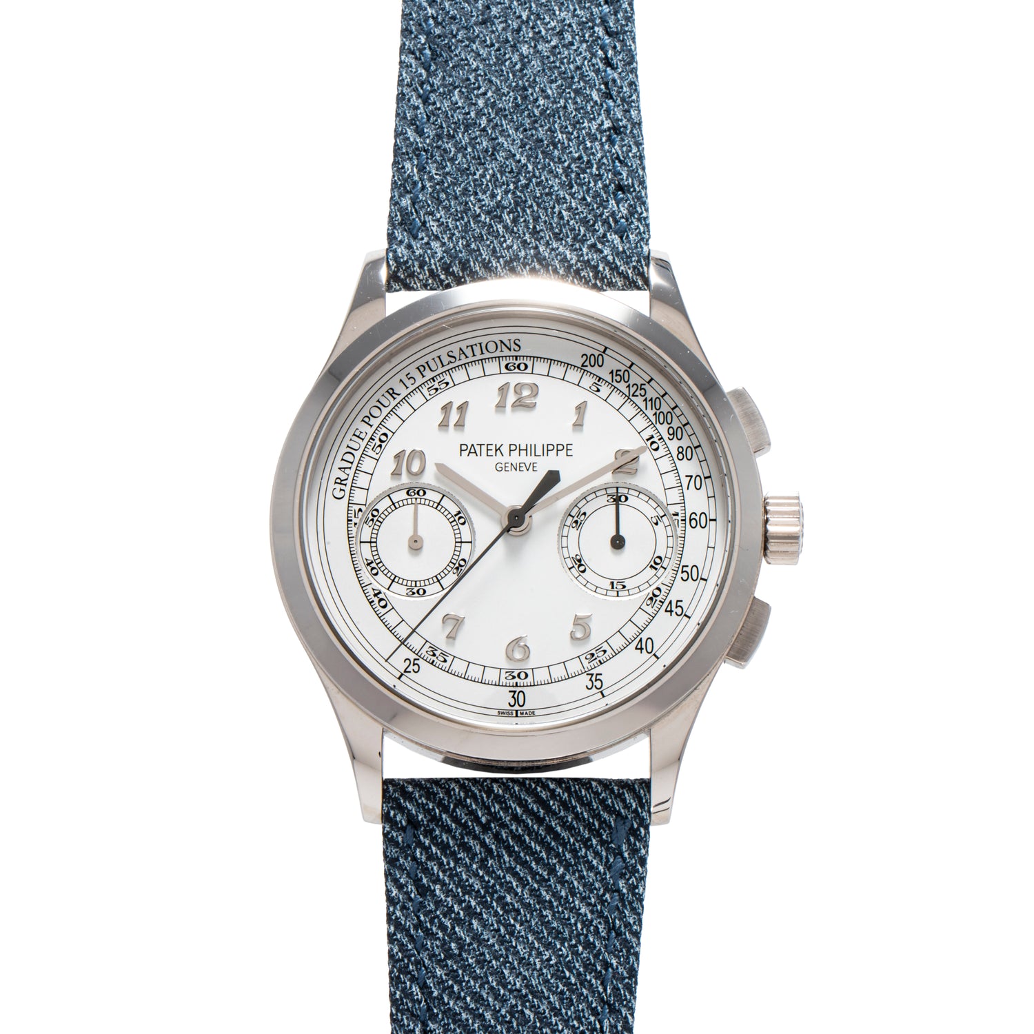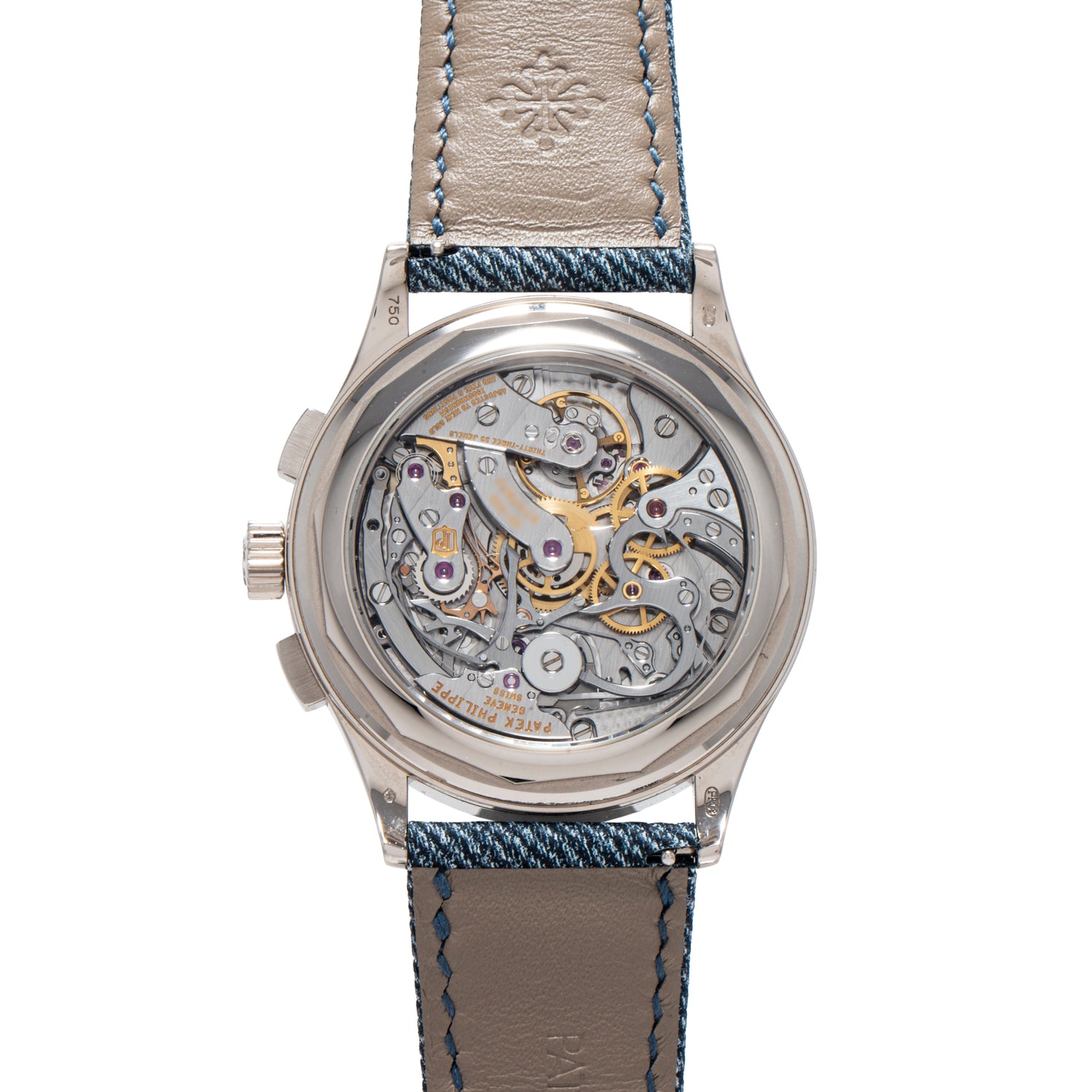 This piece, a Reference 5170G-001, features a 39mm 18K white gold case with a polished bezel, signed crown, rectangular pushers, and a sapphire exhibition caseback framing the maison's Calibre 29-535 manual-winding movement. Paired to signed grey 'denim' fabric strap with a signed white gold deployant clasp, it ships with its factory goodies, including a box set as well as a Certificate of Origin dating to November, 2017.