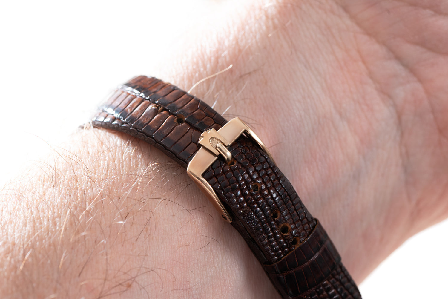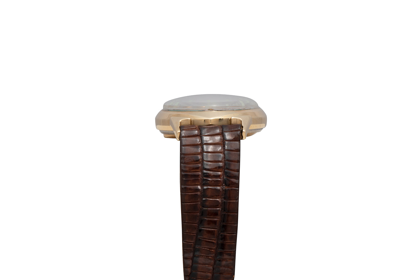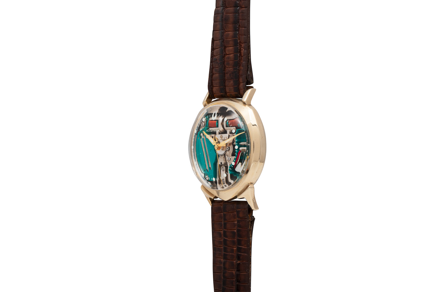 This specific example — an 'Alpha' model — dates back to the early 1960s and features a 14k solid yellow gold asymmetrical case; a distinct set of sculpted lugs; and an expansive, open dial with the Accutron Calibre 214 movement entirely in view. In outstanding condition throughout, this example is a rare find in solid gold, and comes accompanied by a signed lizard strap and matching 14k pin buckle.
