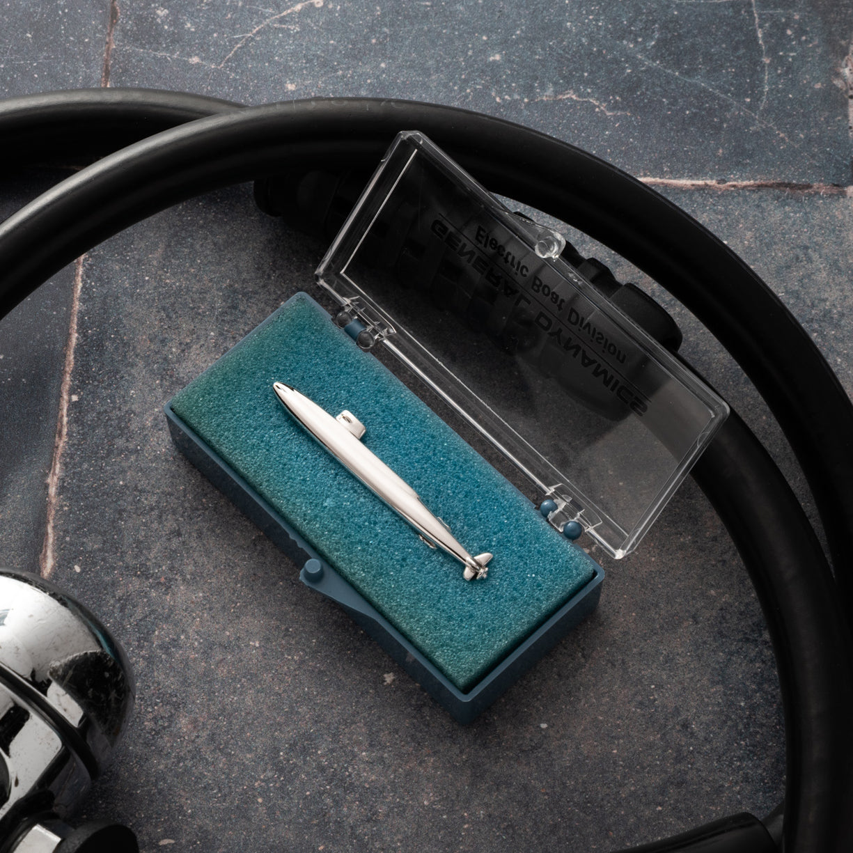 Finished in a refined silver tone, it features a streamlined 51mm submarine silhouette mounted cleanly across the bar. Even better, it comes with its original signed plastic snap-top collector box — a small but meaningful detail that ties it directly to the era of American naval engineering swagger. Think shipyard sodium lights at dusk, hulls taking shape under sparks and steel, blueprints smudged with graphite, and the hum of purposeful work.Â