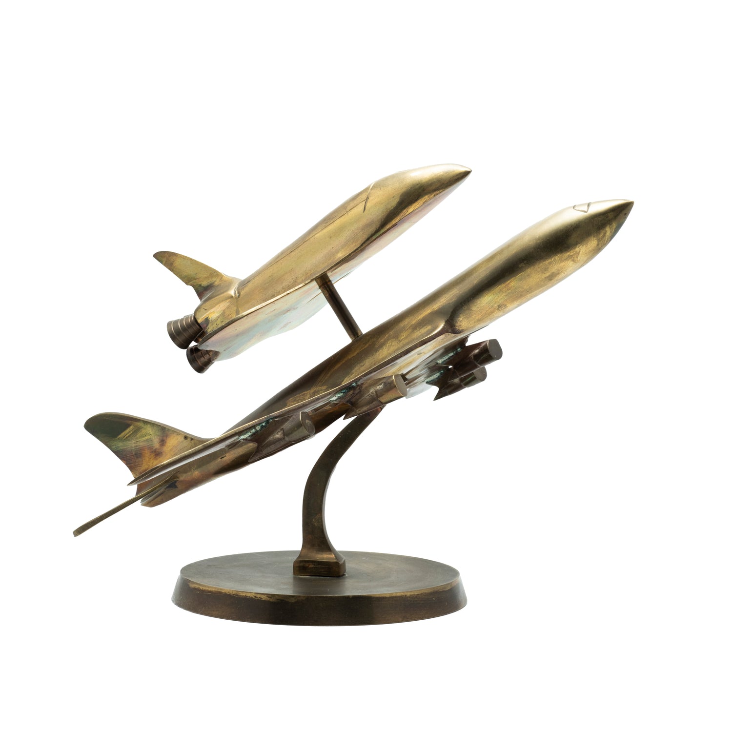 This stunning desk sculpture is modeled after the classic Shuttle Carrier Aircraft (SCA), a series of modified 747 aircraft that were used to transport the Space Shuttle. Fashioned from brass and featuring the SCA with the Space Shuttle mounted above it, this stylized beauty has some weight to it, and is an excellent accent piece for your desk or bookshelf.