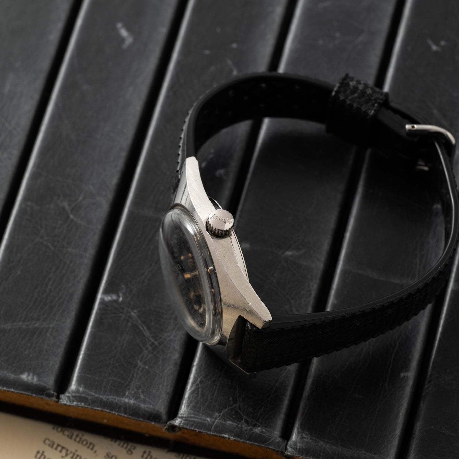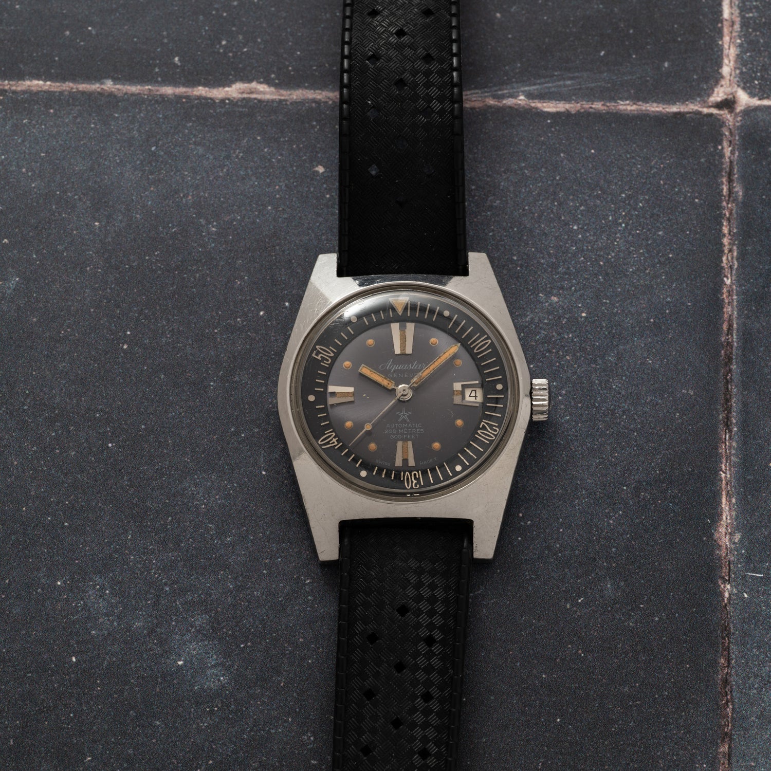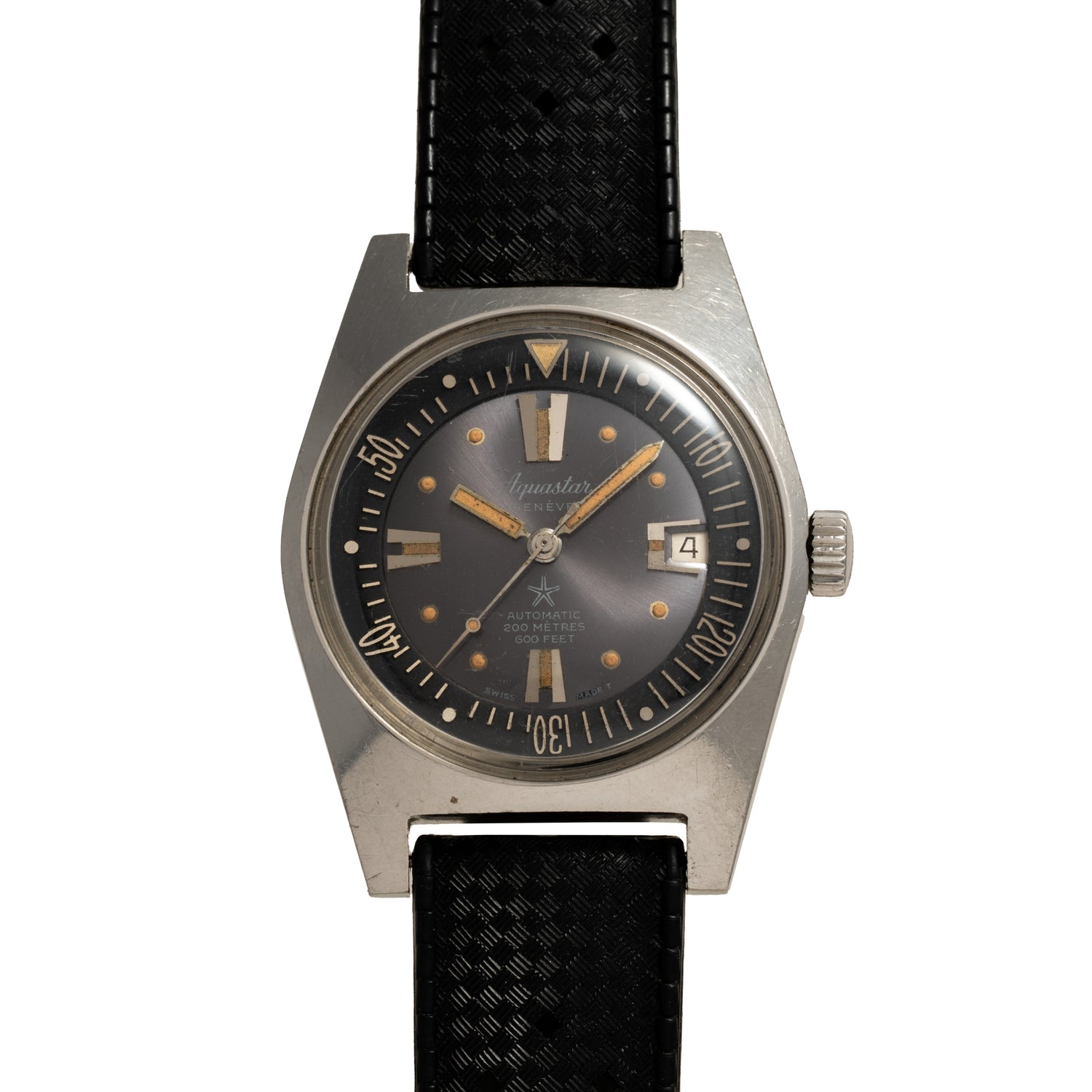 Featuring a standard 37mm waterproof stainless case that saw use in countless contract diving watches of the era, this lovely Aquastar is fitted with a two piece sunburst Tritium dial with an rotating inner timing bezel, oversized applied indices at 6:00, 9:00, and 12:00, with an asymmetrical date window at 3 o'clock, a matching handset, a signed crown, a beautiful domed acrylic crystal, and black rubber strap rounding out the package.