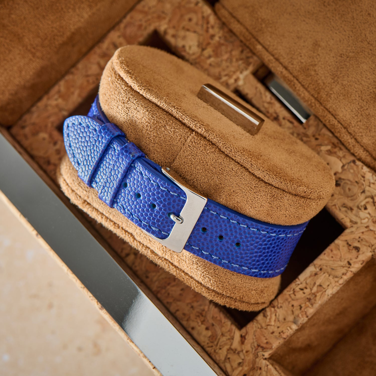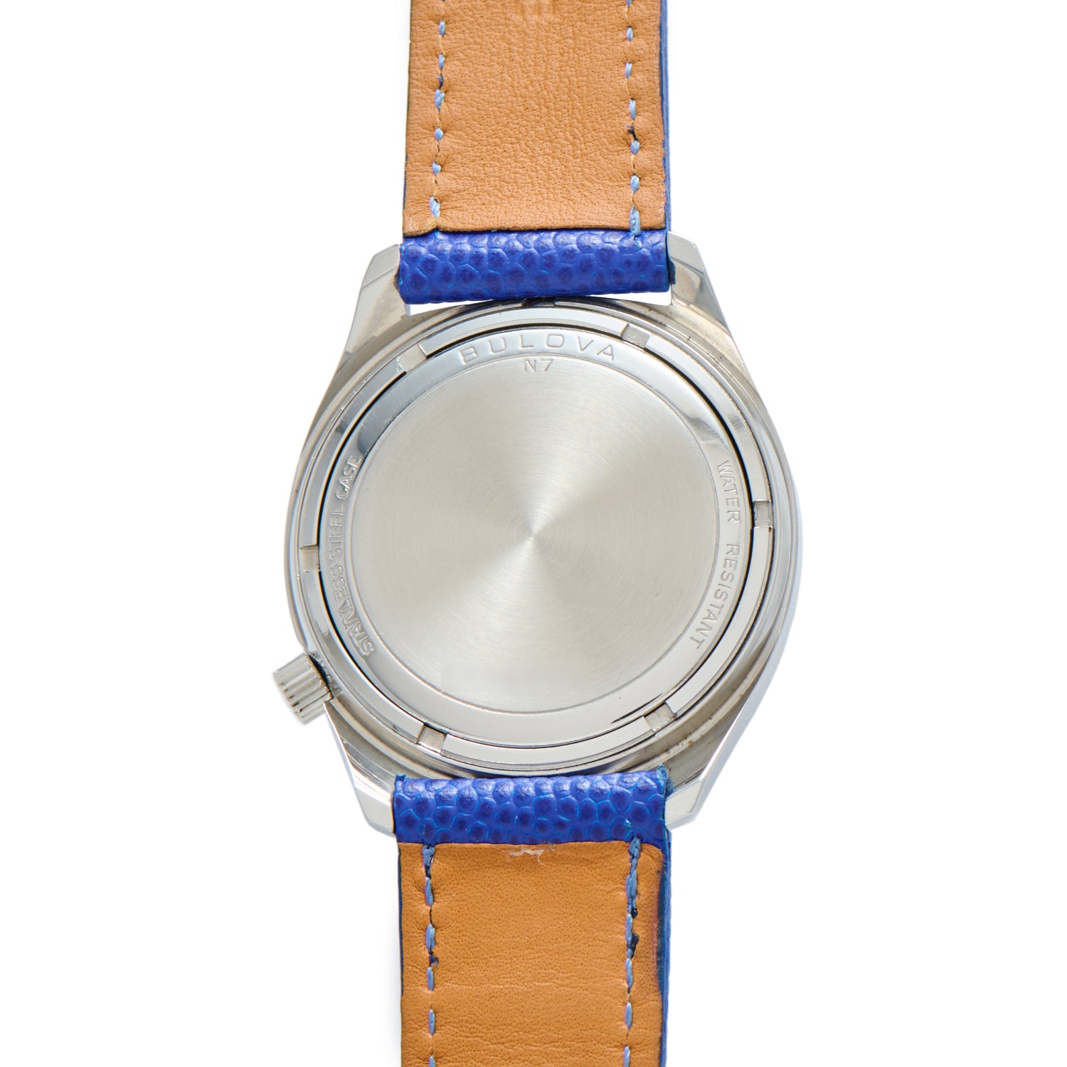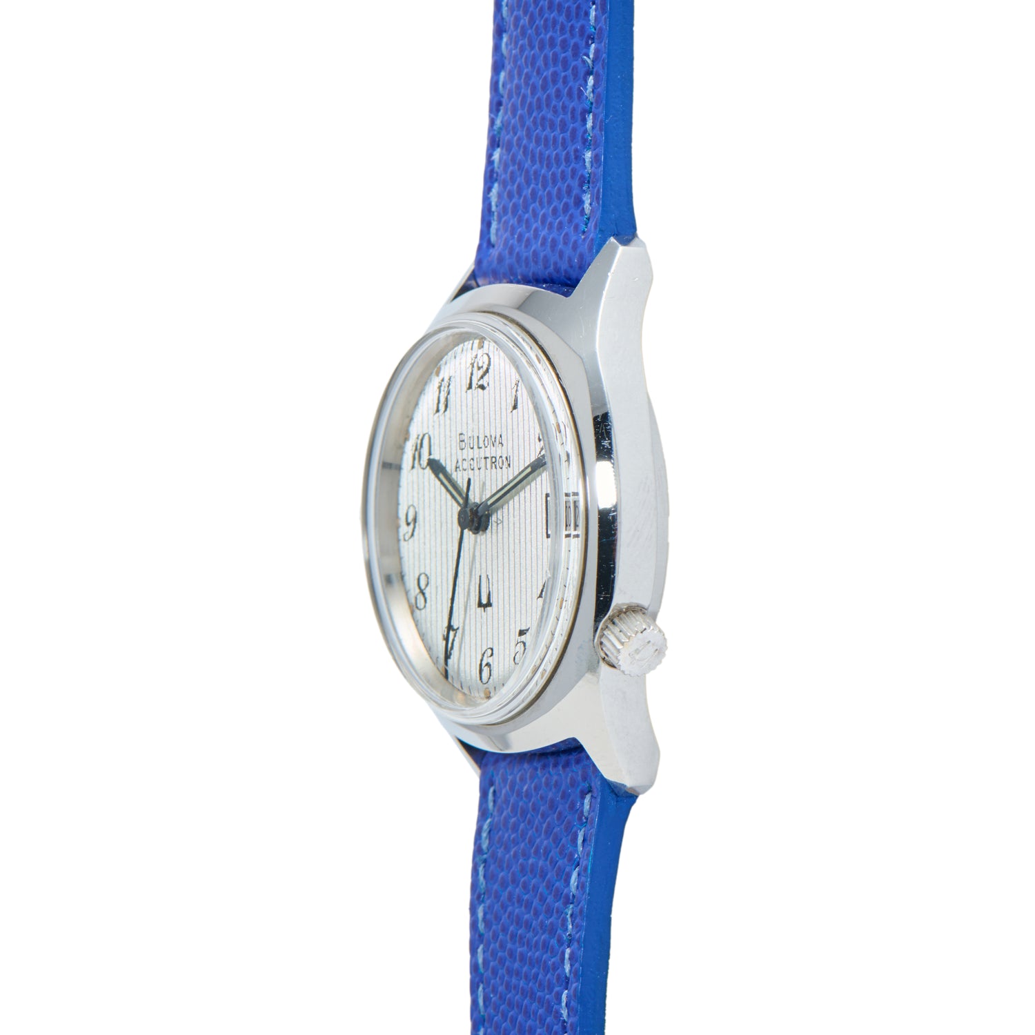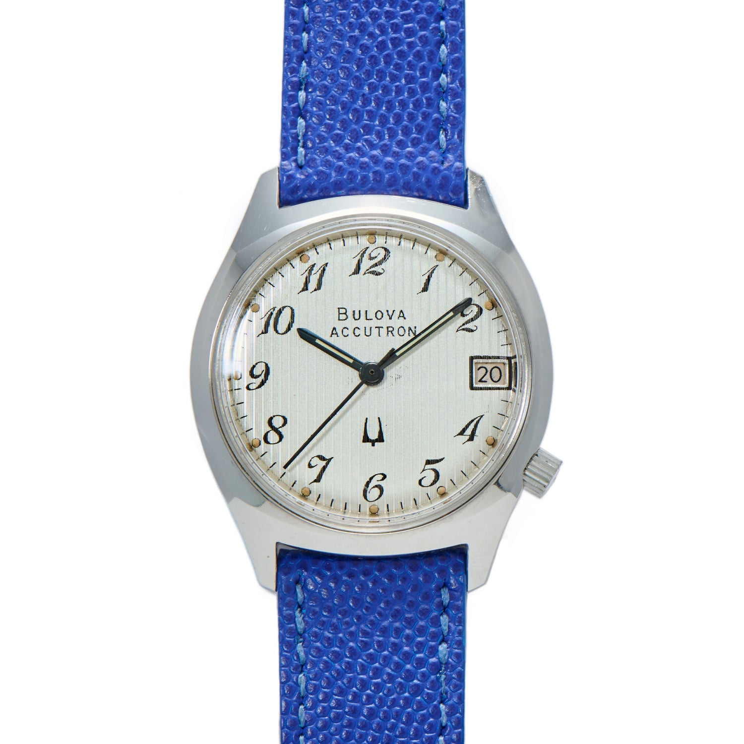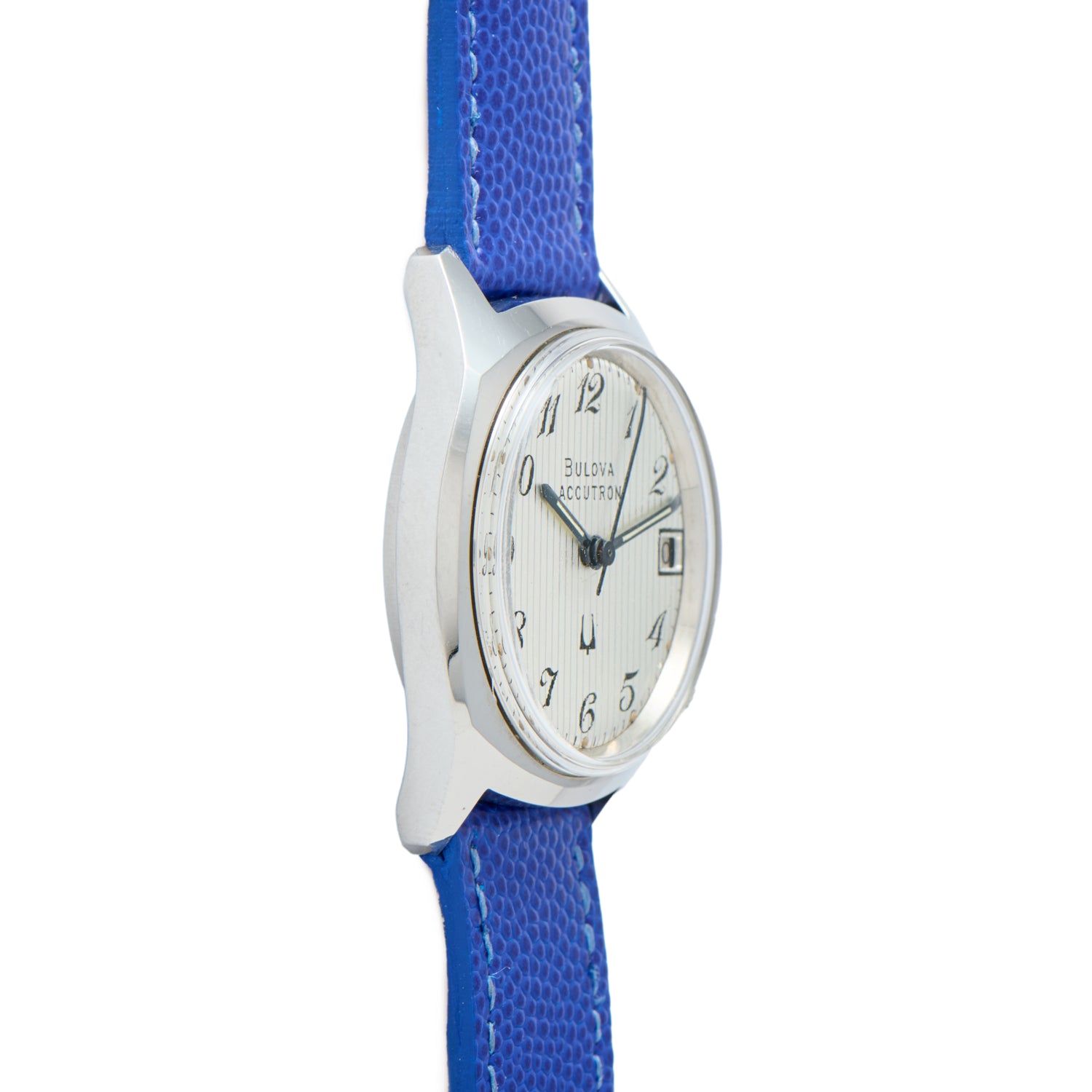 Powered by a period-correct Accutron tuning fork movement, it comes paired to a blue pebbled leather strap with a stainless steel pin buckle.