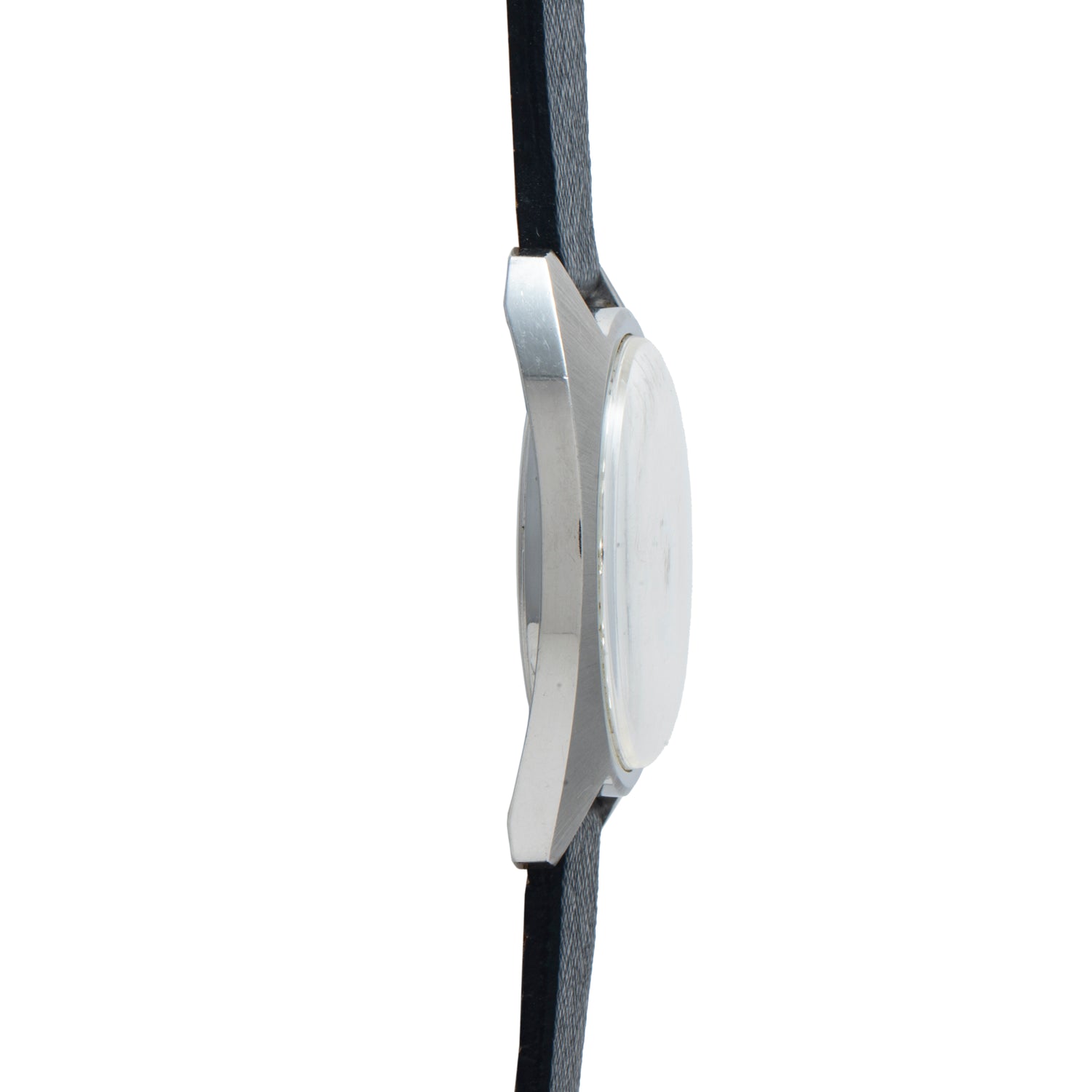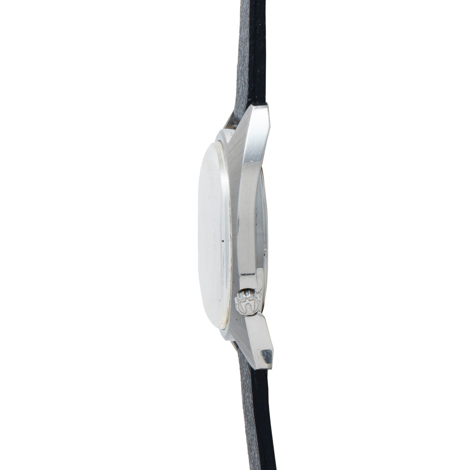 This particular Accutron, dating to the 1970s, mixes its futuristic tech with vintage-inspired cues: Measuring 37mm in a brushed stainless steel 'C'-shaped case, it features a 4:30 crown, a polished bezel, an acrylic crystal, a screw-down caseback, and a silver dial with applied 'Breguet' indices, an outer 'dot' minute track, and a matching 'baton' handset.