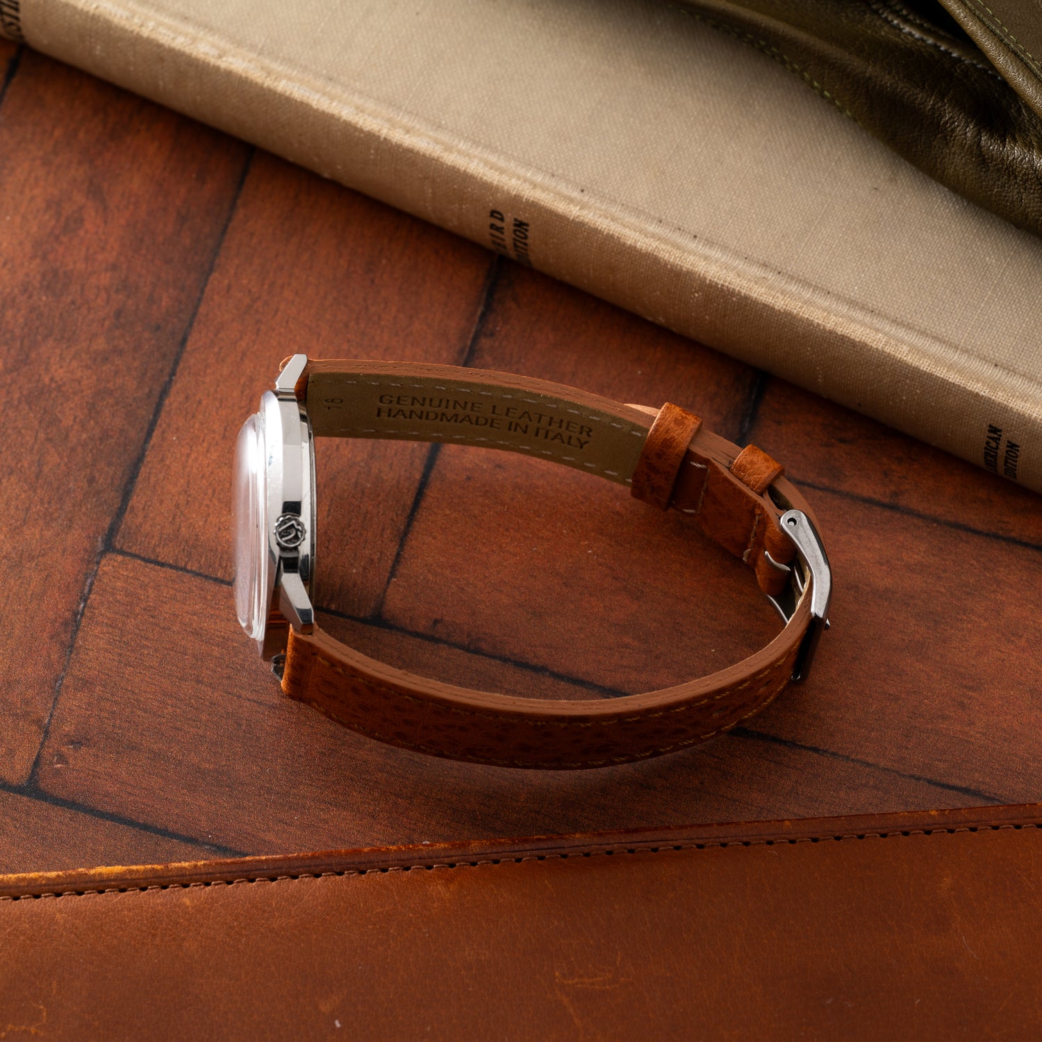 The present watch features a sharp white crosshair dial—long favored by medical professionals for quick, quadrant-based time reading—along with applied indices, a baton handset, crown at four, and the tuning-fork emblem at 12 o'clock. Paired with a brown leather strap and stainless steel pin buckle, it even carries a personal touch: a 25-years of service engraving on the caseback, dating the watch to 1973.