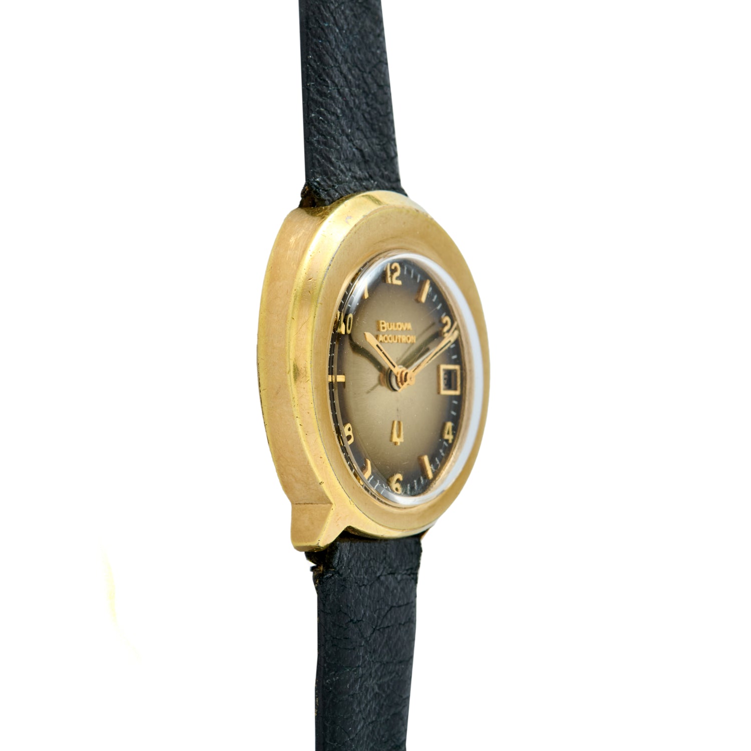 This specific watch, although not a Spaceview, uses the same tuning fork technology. It dates to 1973, given its N3 caseback engraving. "N" representing production in the 1970s, and "3" being the specific year within that decade. Housed in a swollen filled gold case, it features a dark sunburst dial with an outer minute track, applique Arabic numerals, and a pencil handset. This piece also includes a GMT hand and date window for added functionality. With the ability to jump the hour hand both forwards and backward via the two o'clock crown, this piece is an ideal travel companion!