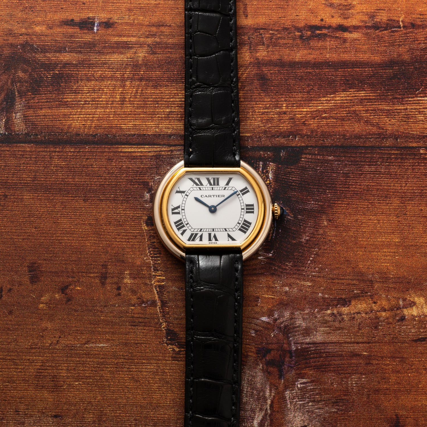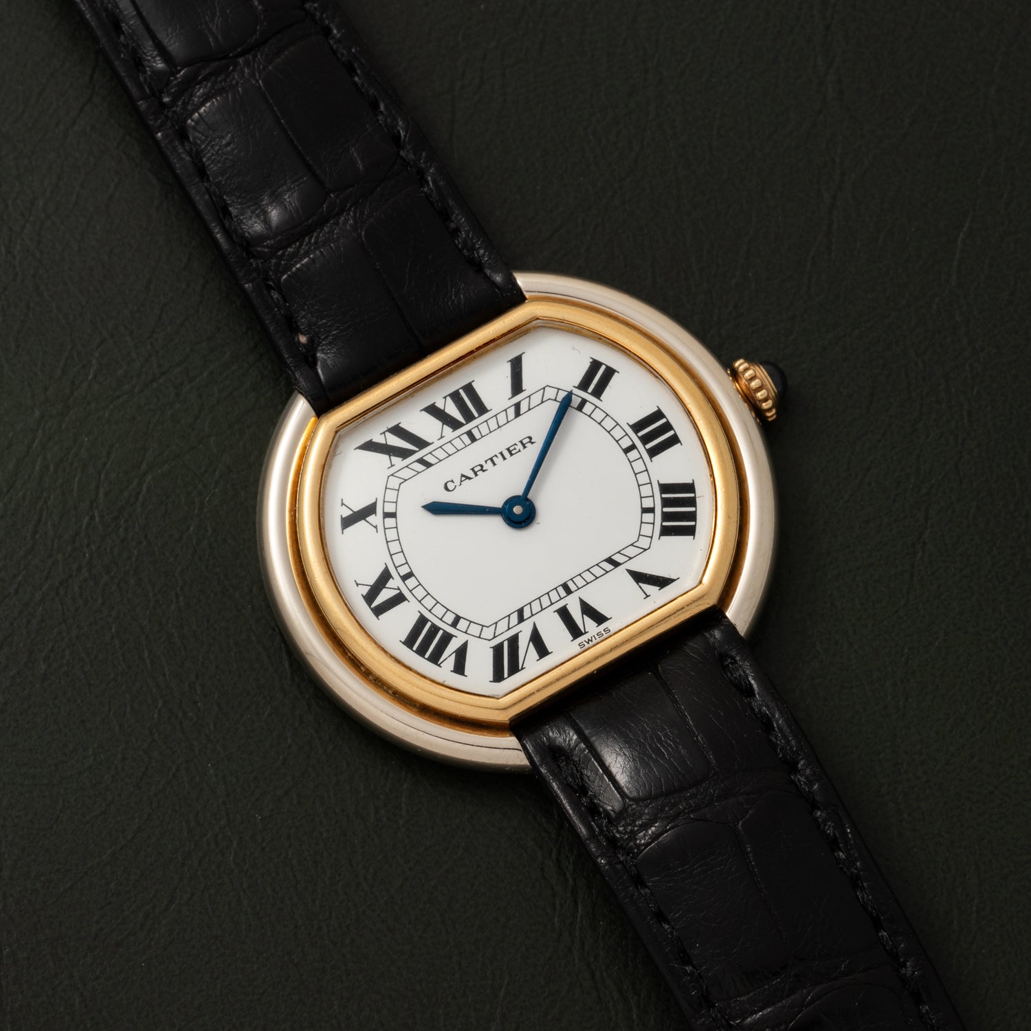 This particular Ellipse is housed in a 33mm yellow and white gold case in good condition that shows normal signs of wear throughout. Featuring a sapphire crystal and the signature Cartier cabochon crown, its centerpiece is a white enamel “Roman” dial with blued steel sword hands. Paired to a black leather strap with a hidden deployant clasp and powered by a manually wound Cartier movement, it makes for a beautiful dress watch, subtle and classic.