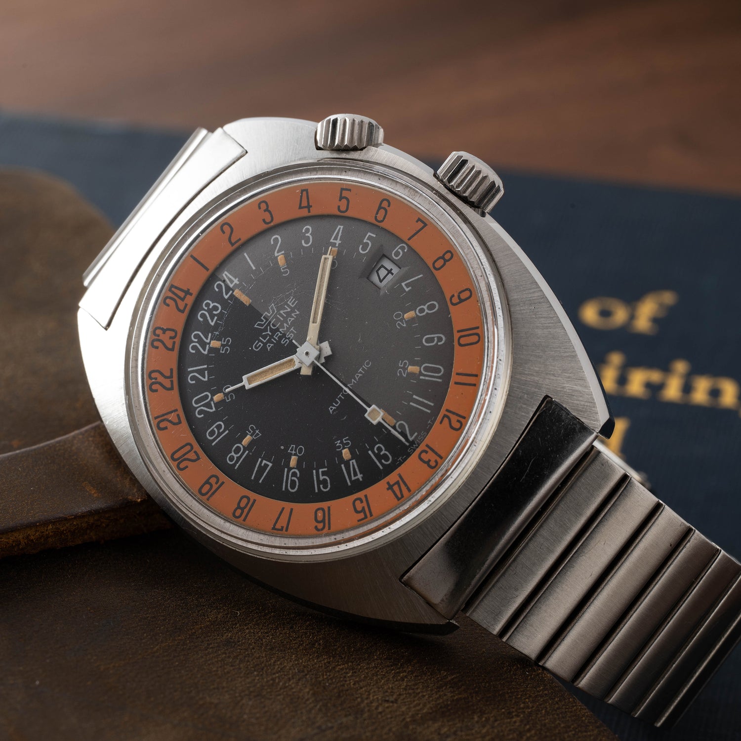 Hertig embraced the challenge, and designers at Glycine sketched a watch to Glur’s exact specifications. The 24-hour dial and bezel were housed in a case with gently sloping lugs. A thoughtful touch, a locking mechanism for the bezel, drove home the fact that here was a watch for pilots.
