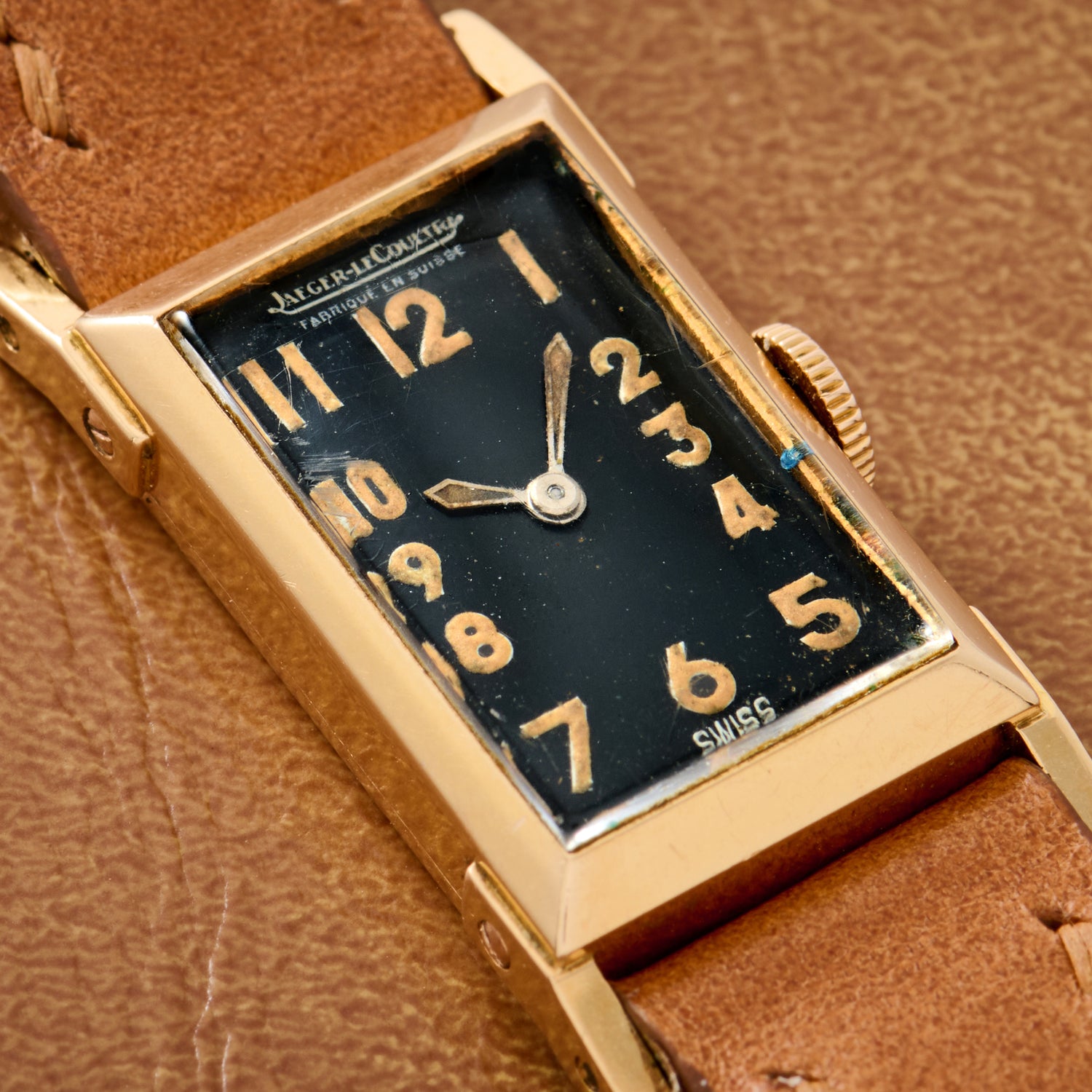 This piece has a lot of the detail we'd hope to see on a midcentury Tank-style piece: a rare black dial on rosy yellow gold case, lovely patinaed Arabic numerals, and manually wound movement within.