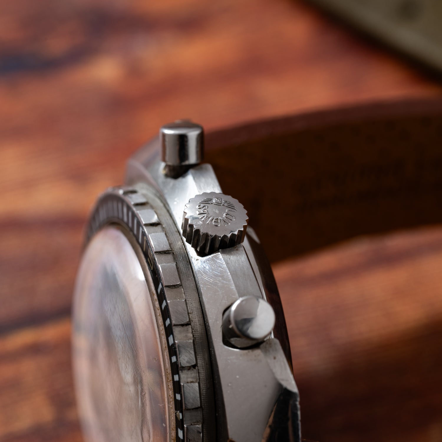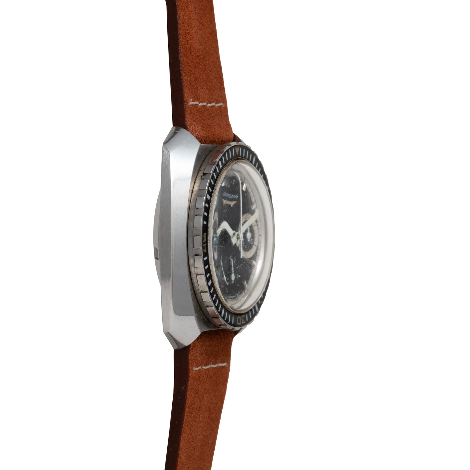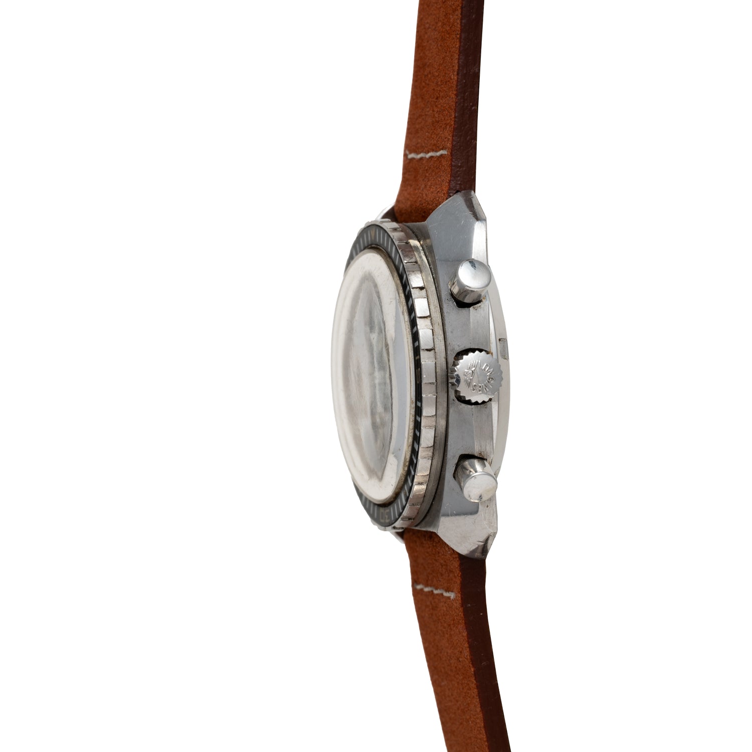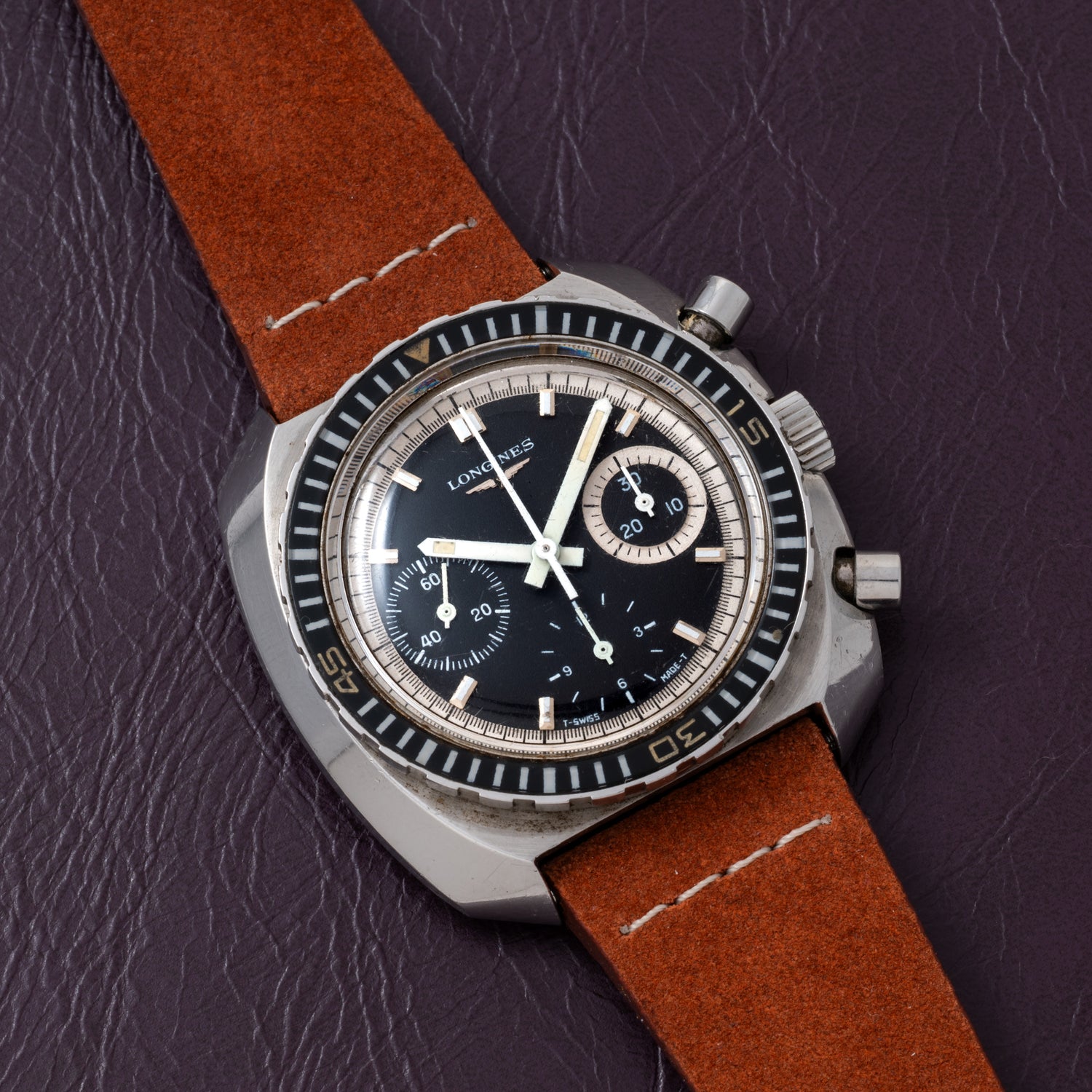 Powered by a hand-wound Longines Cal. 330 movement, this incredibly diver's chronograph from the late 1960s combines 'Paul Newman' Daytona aesthetics with the functionality of a tank-like dive watch housing.