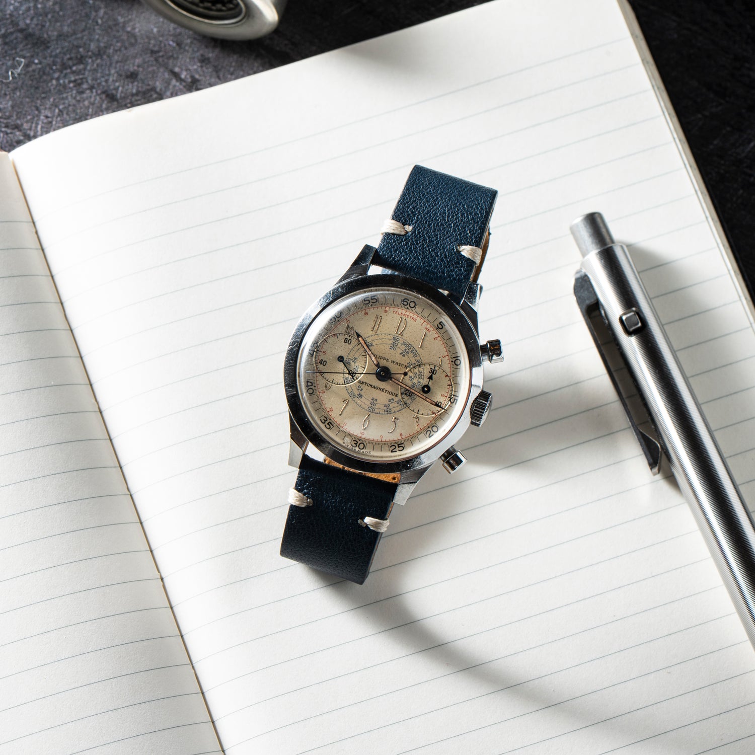 Powered by a hand-wound movement from Valjoux and paired to a Analog:Shift Grayson Blue Montone leather strap, this tremendously cool time capsule from the time of the Second World War is oozing with vintage vibes and effortless cool. Want to be the most interesting guy in the room? Strap this Philippe watch on and...no contest!