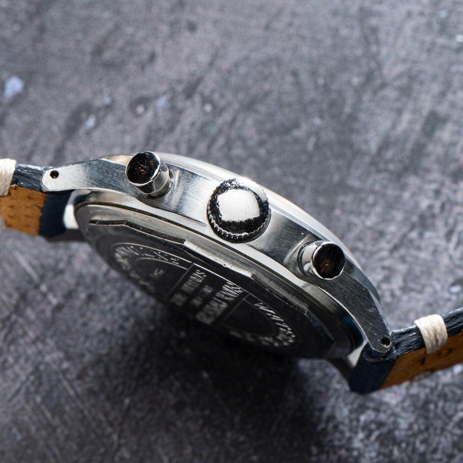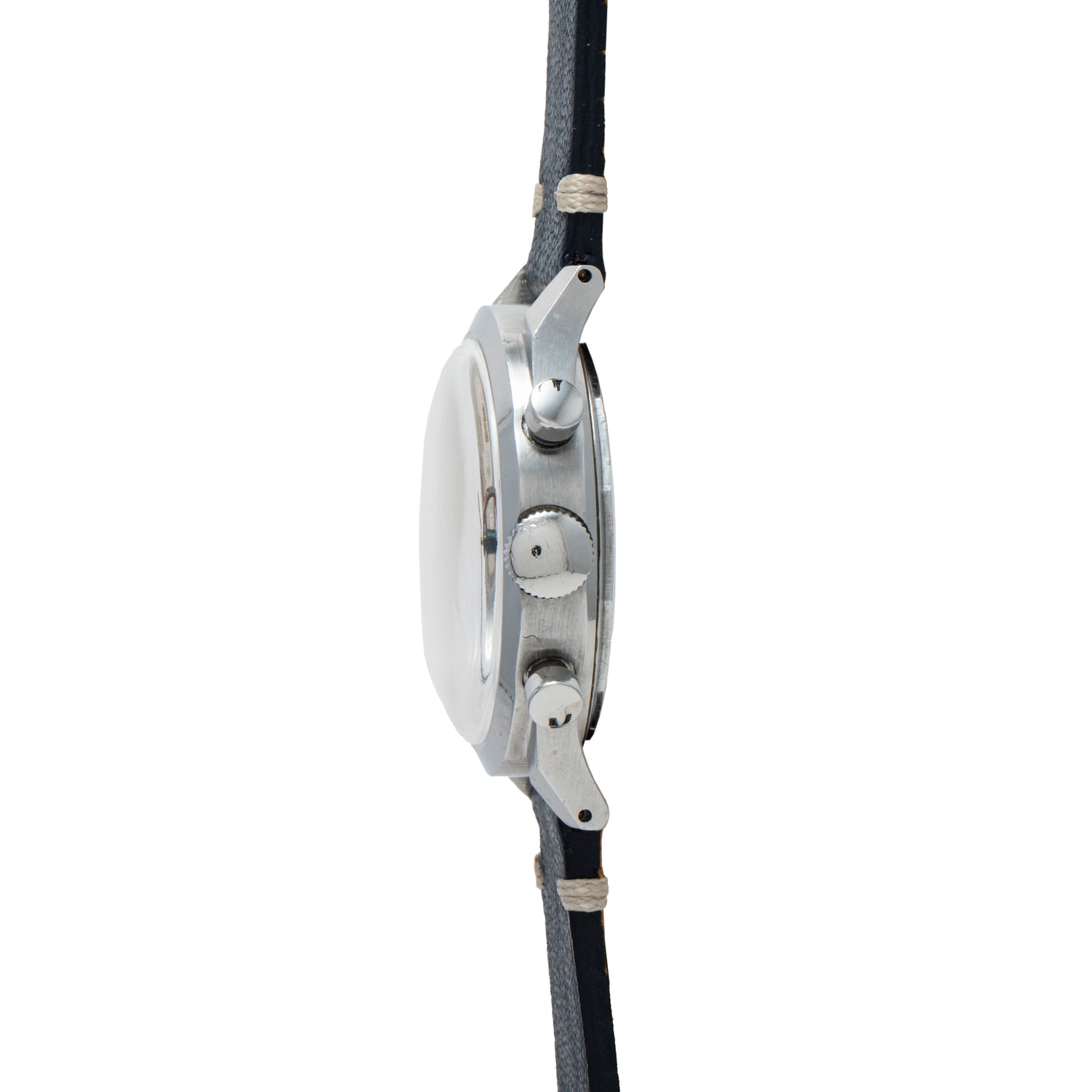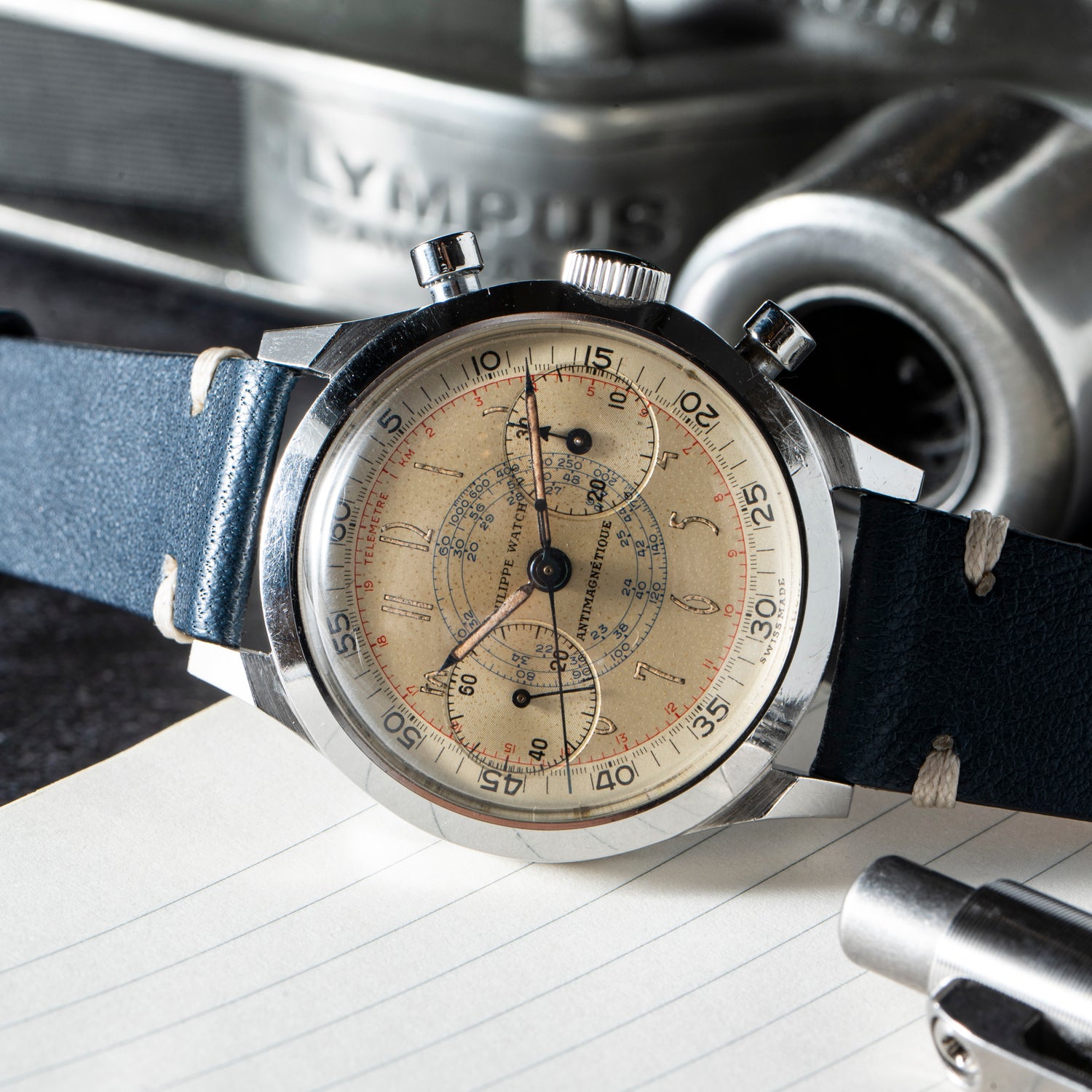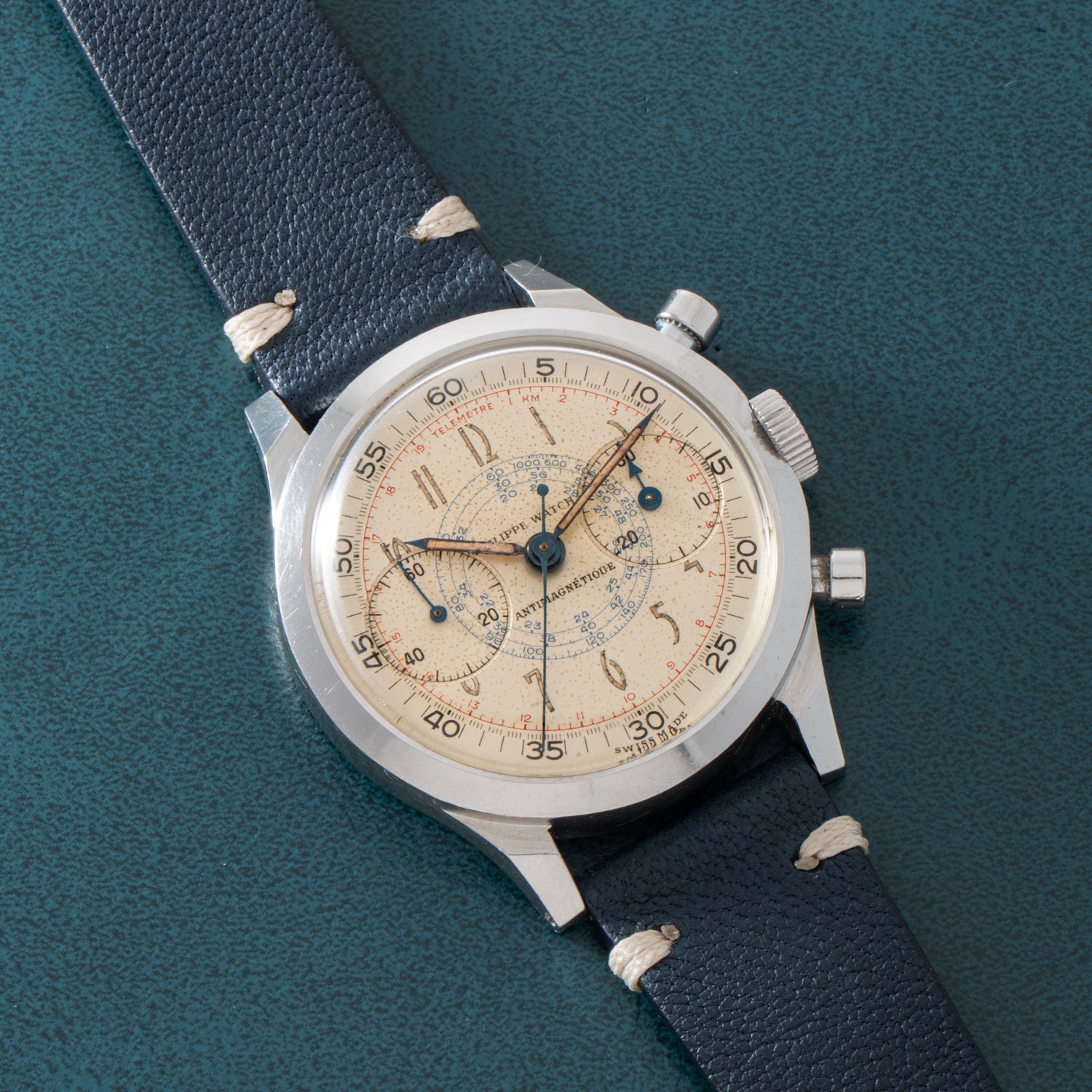 Philippe Watch is one such firm. Not to be confused with Patek Philippe, this Swiss marque produced a series of incredible chronographs in the 1940s that fly well under the radar, yet deserve your undivided attention. Take this lovely Ref. 2501, for example: Measuring 38mm and housed in a stainless steel screw-back case from famous maker Spillman, it features prominent pump pushers, a smooth bezel, strong lugs, and an acrylic crystal.