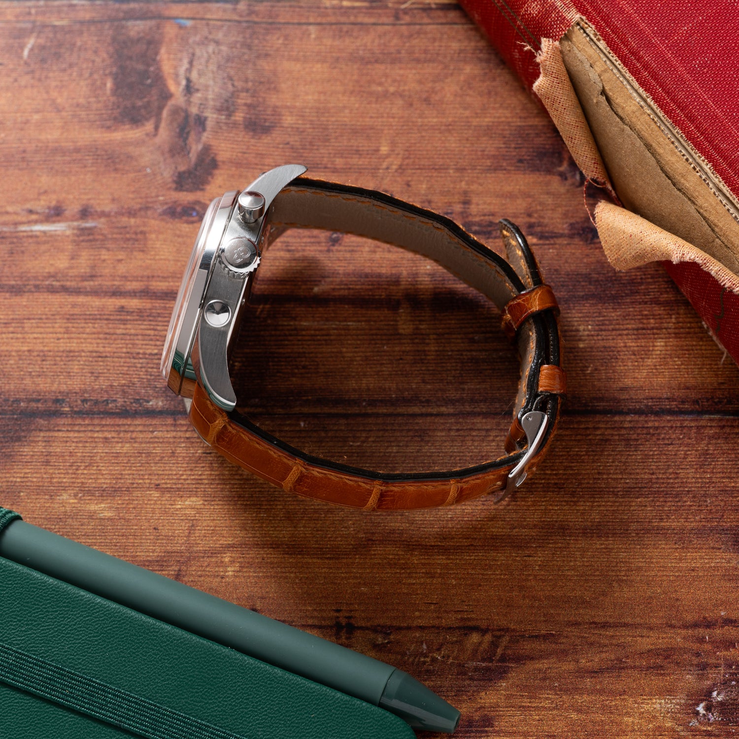 Powered by the Girard-Perregaux Calibre 3370 movement — an ETA base movement with a Dubois-Dépraz chronograph module — it comes paired to a brown leather strap with tone-on-tone stop stitching and a signed stainless steel pin buckle. Limited to 100 pieces, it also features its inner and outer box, pamphlets, and an extra strap.
