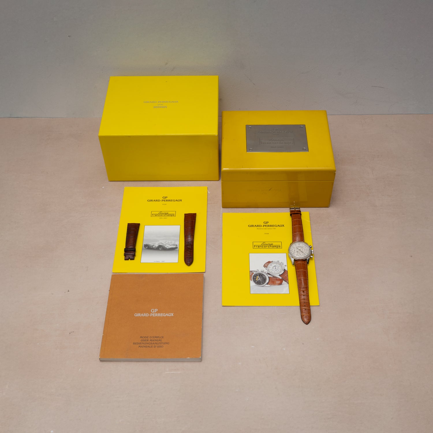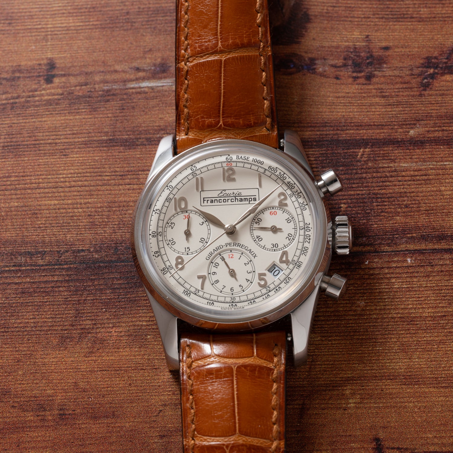 As is such with the Girard-Perregaux Chronograph 'Ecurie Francorchamps.' A limited edition from the early 2000s, it celebrates the 50th anniversary of Écurie Francorchamps, the Belgian racing team founded by Jacques Swaters that competed multiple times in the 24 Hours of Le Mans. Housed in a 38mm stainless steel case with pump pushers, a fluted signed crown, a stepped bezel, and an engraved commemorative caseback, it features a decidedly 1940s-influenced white dial with an outer tachymeter scale, applied 'Arabic' indices, a triple-register chronograph, a 4:30 date window, and a silver 'feuille' handset.