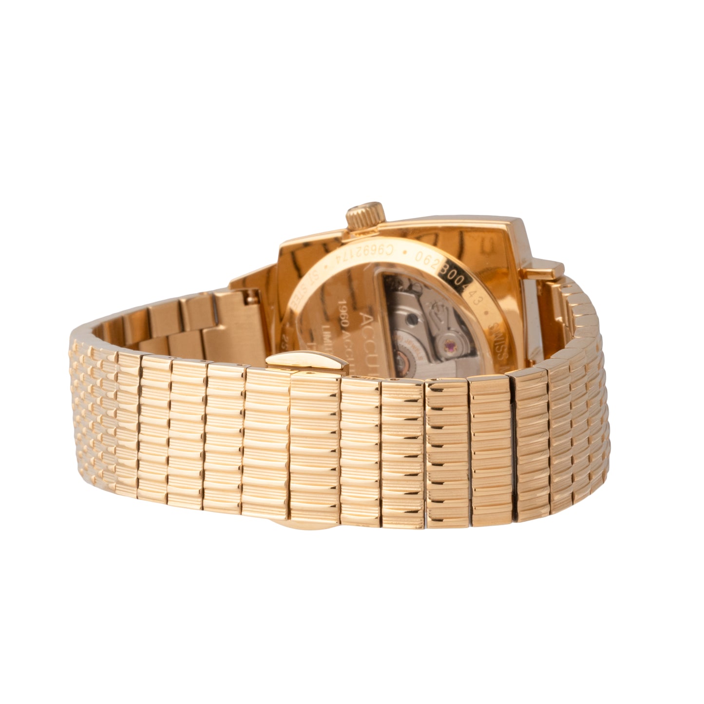 Aptly nicknamed 'The King,' the 521 Legacy Edition features a 32.5mm polished, gold-tone stainless steel 'TV' case with stylized lugs; a domed sapphire crystal; a signed crown engraved with Accutron's tuning fork logo. All Legacy Collection models were produced as a limited edition and come with an individually numbered caseback with a sapphire display aperture providing a glimpse of their mechanical underpinnings.