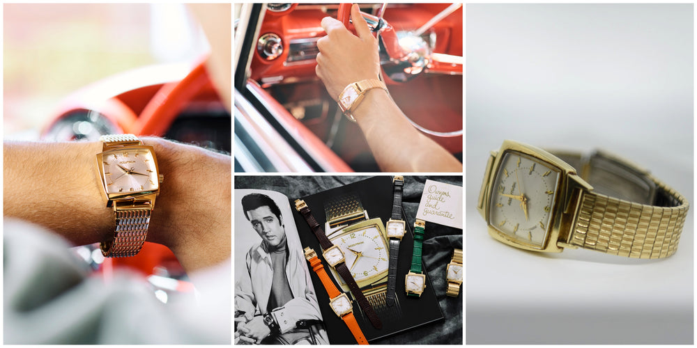 Unveiled in 1960, the 521 was the first and arguably the most desirable offset asymmetrical Accutron design.Known as one of the popular “TV watches” from the brand at the time, it is no surprise that the King, whose careerwas launched on the iconic television series, The Ed Sullivan Show, took a liking. A watch fit for a king, the Accutron521 was a unique standout and unlike any other watch at the time given its unique case shape. The original modelfeatured a 14-karat gold-filled case and was unique in that it was the only model in the series that contained a mineralglass crystal and a snap-on case back.