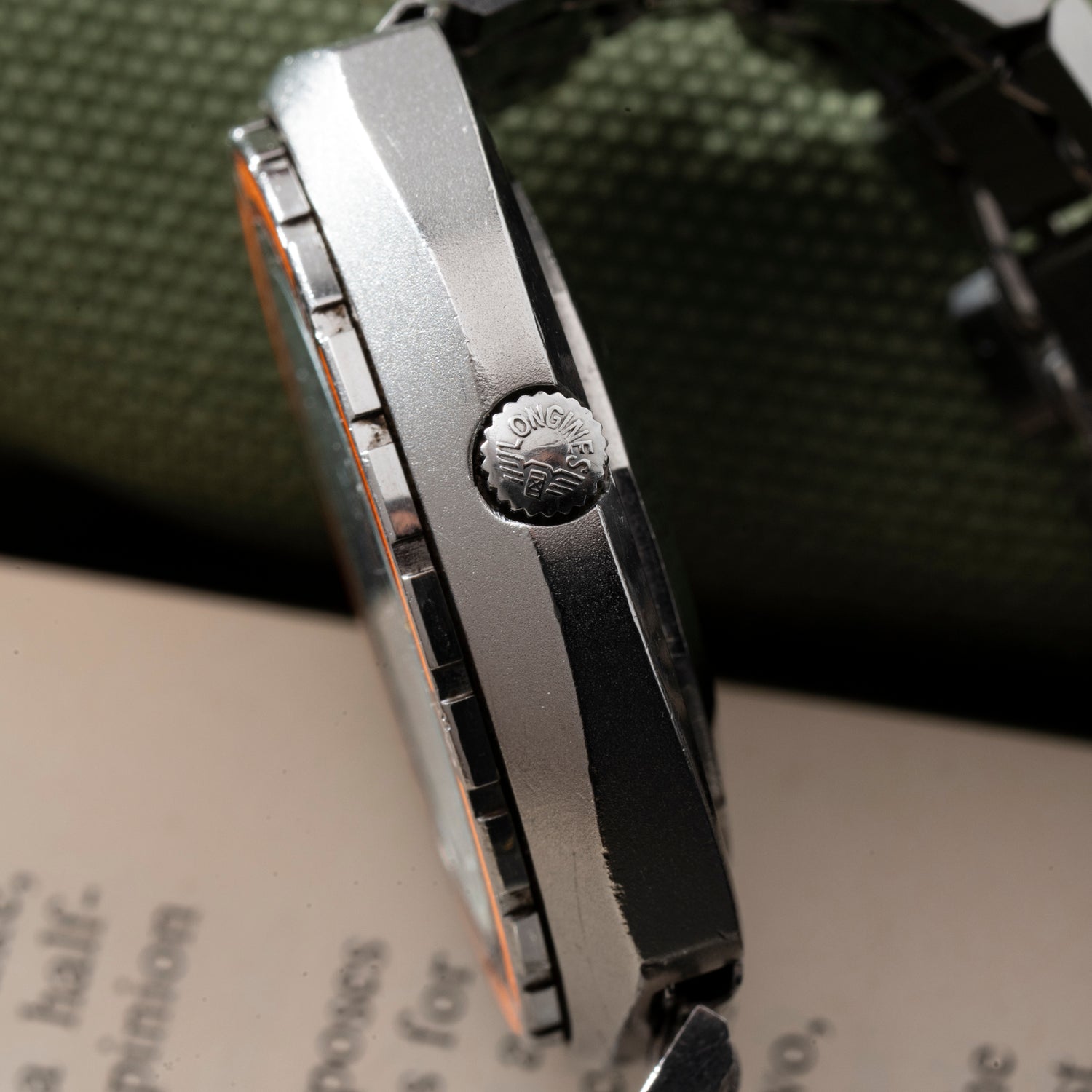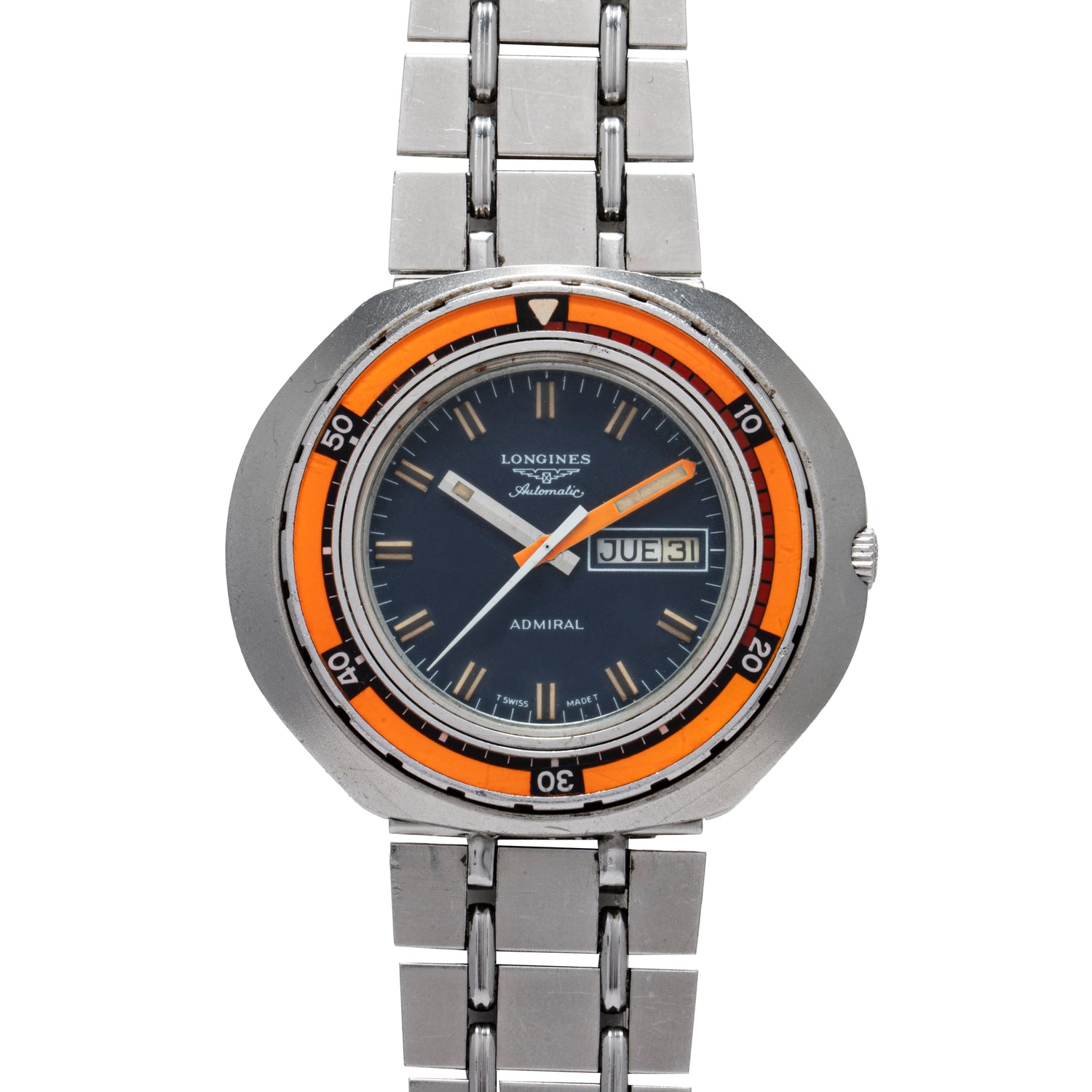This particular Longines Admiral Reference 8557 from the 1970s is emblematic of the brand's incredibly creative 20th-century output. Housed in a 44mm tonneau-shaped case with hooded lugs, a captive crown, and an acrylic crystal, it features one of the most eye-catching dive bezels on the vintage market: Bright orange in color with black 10-minute indices and a luminous triangular pip at 12 o'clock, it's designed with serious divers in mind.