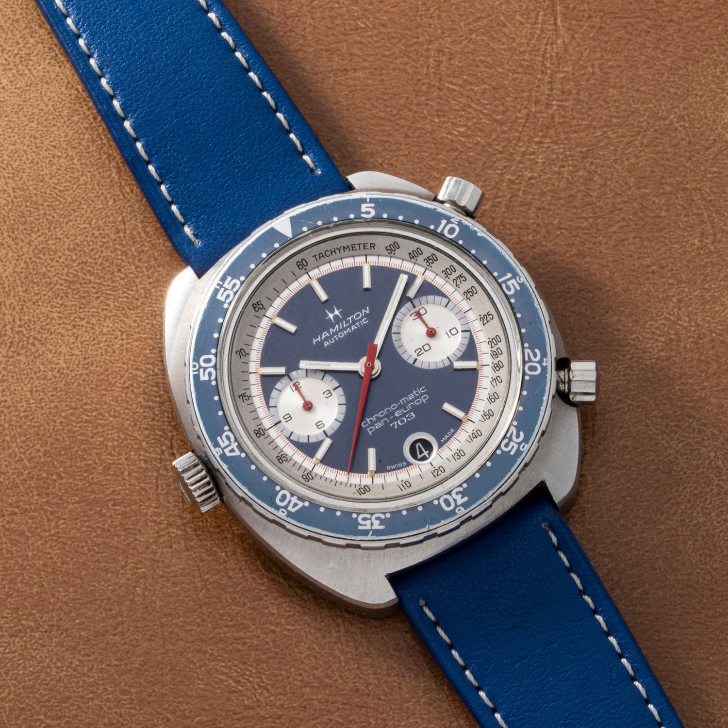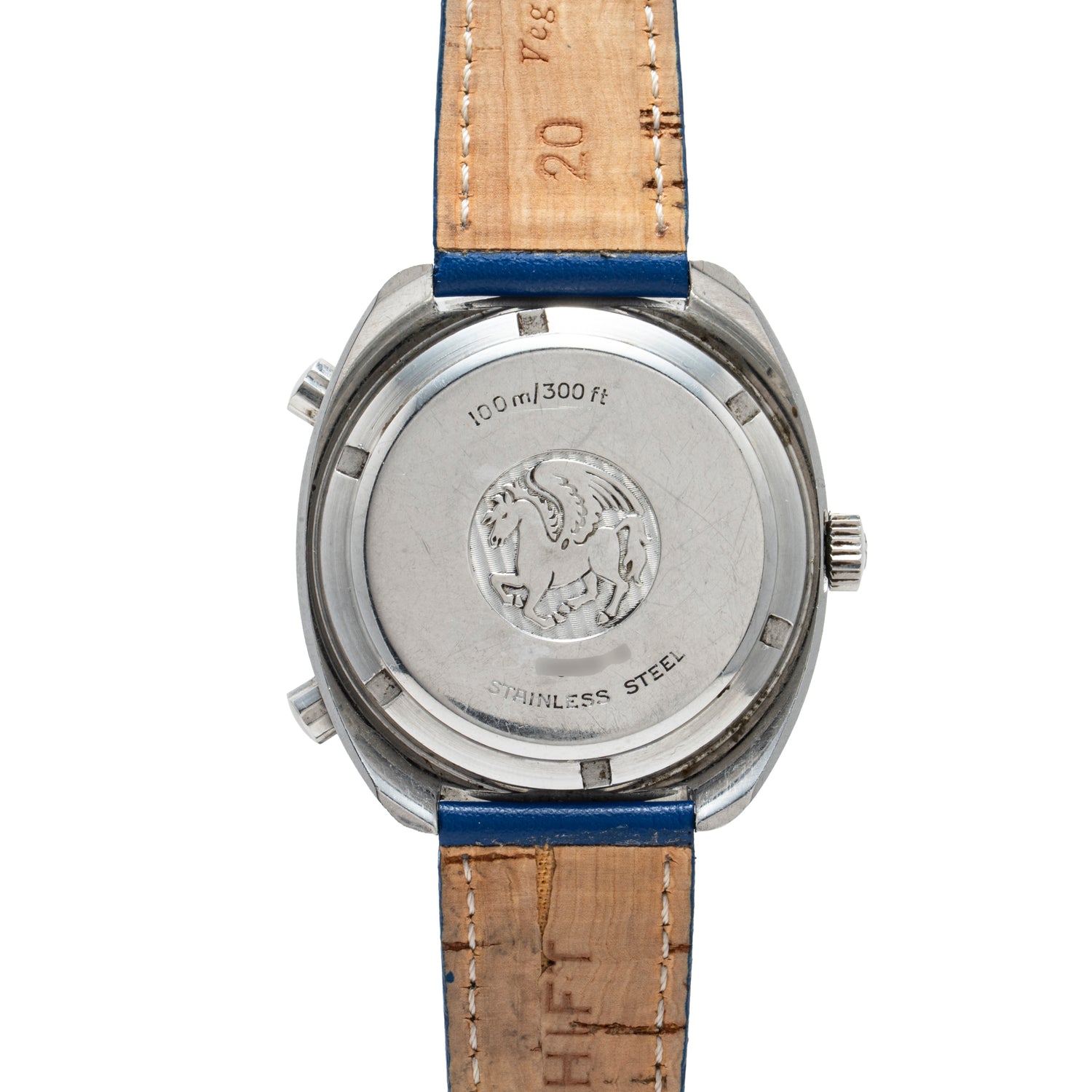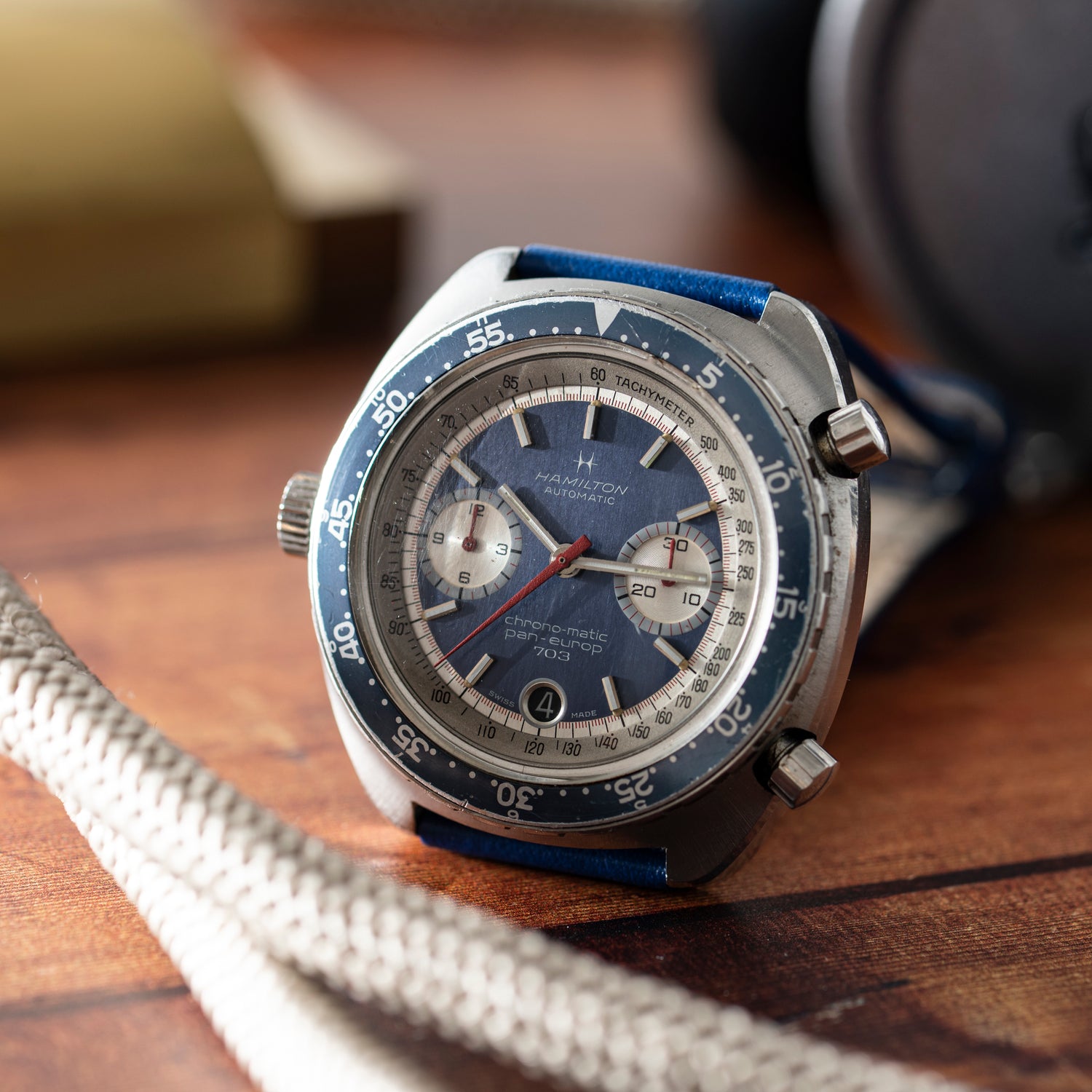 Like its Heuer cousins, the Pan-Europ Ref. 703 was built for the track. An internal tachymeter scale, a rotating countdown bezel, and bold chronograph registers make it clear this was a watch for Formula 1. The blue dial, red accents, and quirky circular date window capture that late-'60s mix of utility and flair that defines the golden age of racing chronographs.