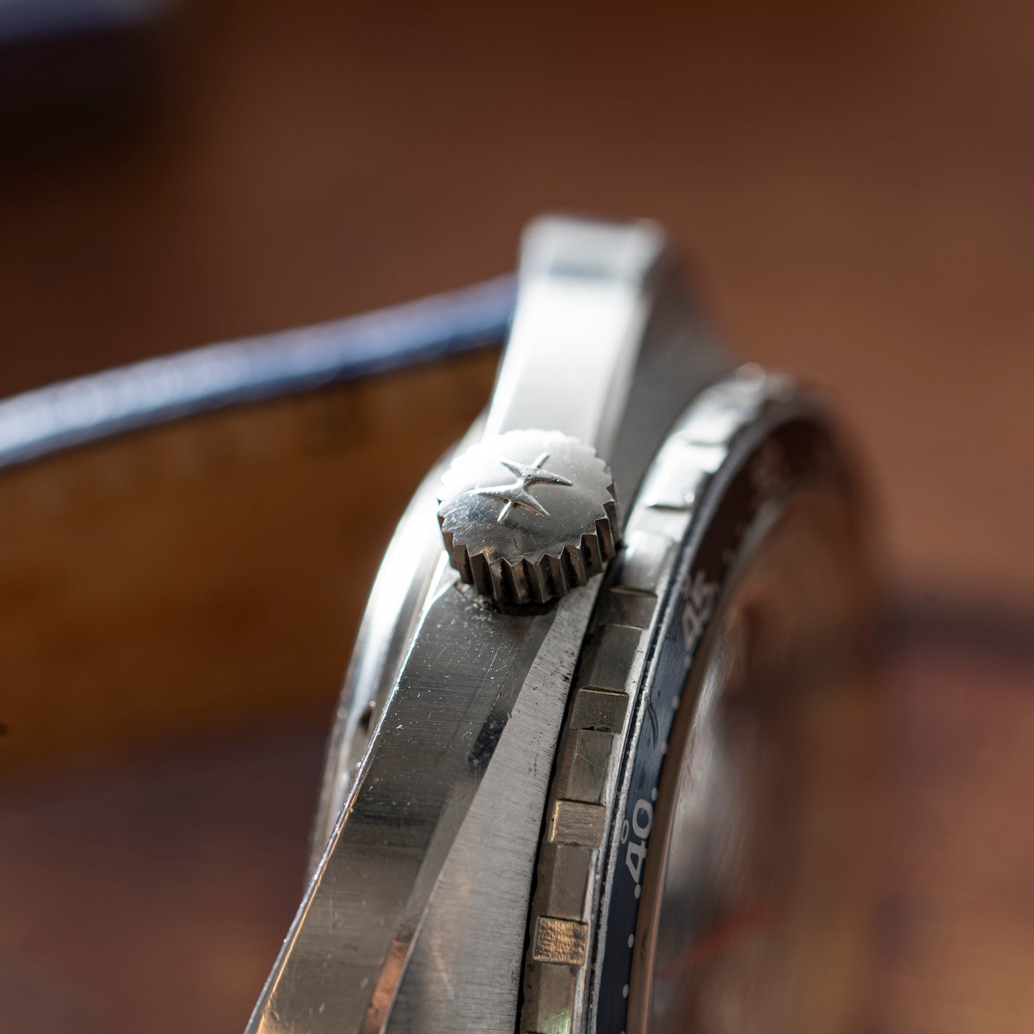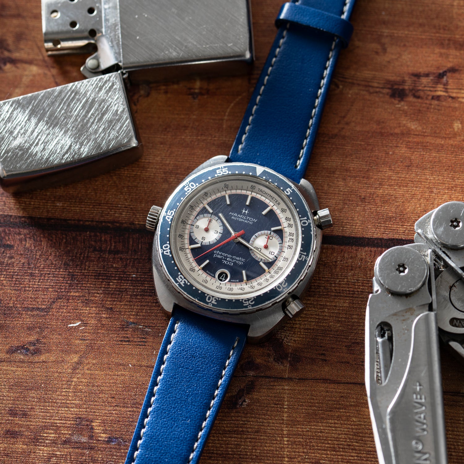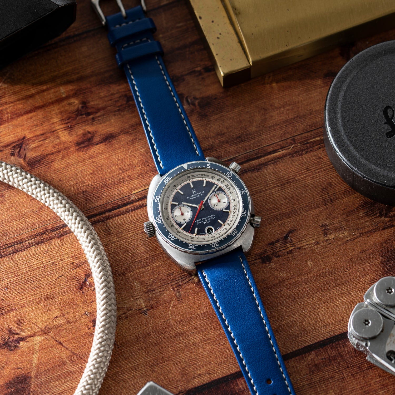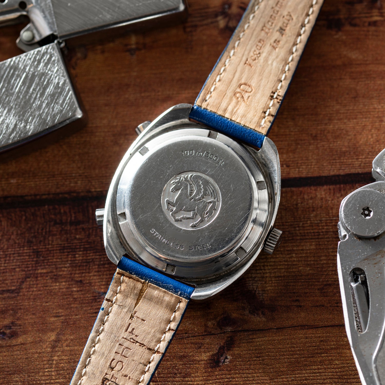 Like its Heuer cousins, the Pan-Europ Ref. 703 was built for the track. An internal tachymeter scale, a rotating countdown bezel, and bold chronograph registers make it clear this was a watch for Formula 1. The blue dial, red accents, and quirky circular date window capture that late-'60s mix of utility and flair that defines the golden age of racing chronographs.