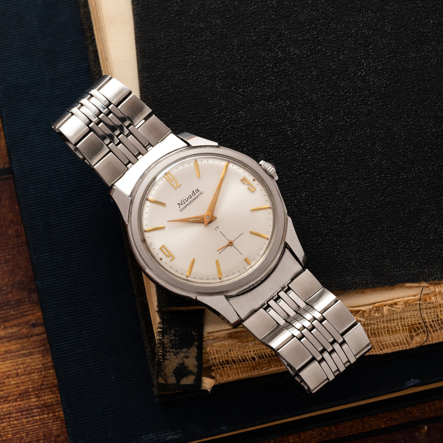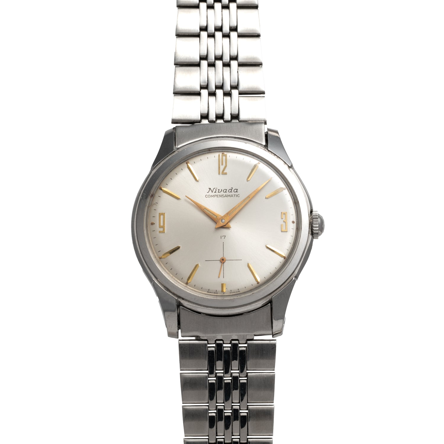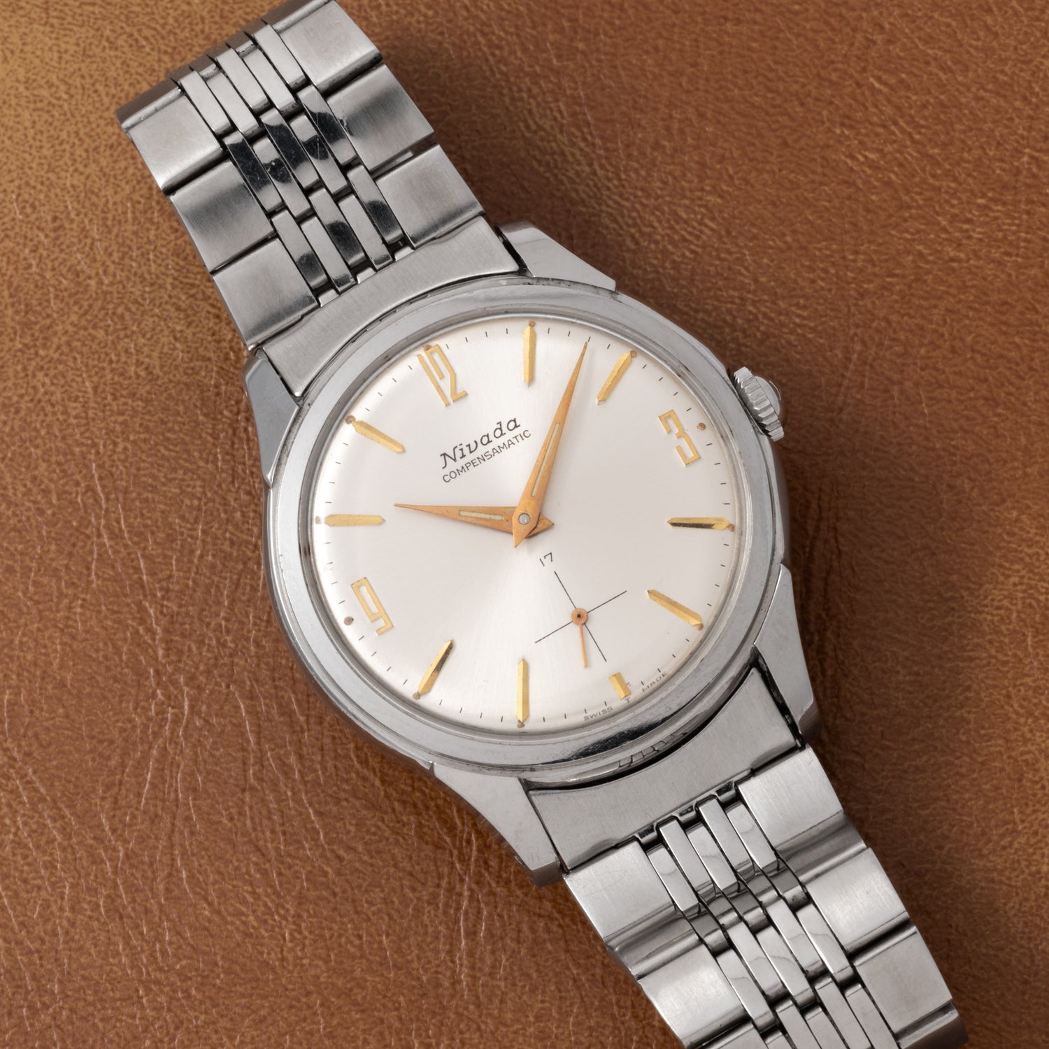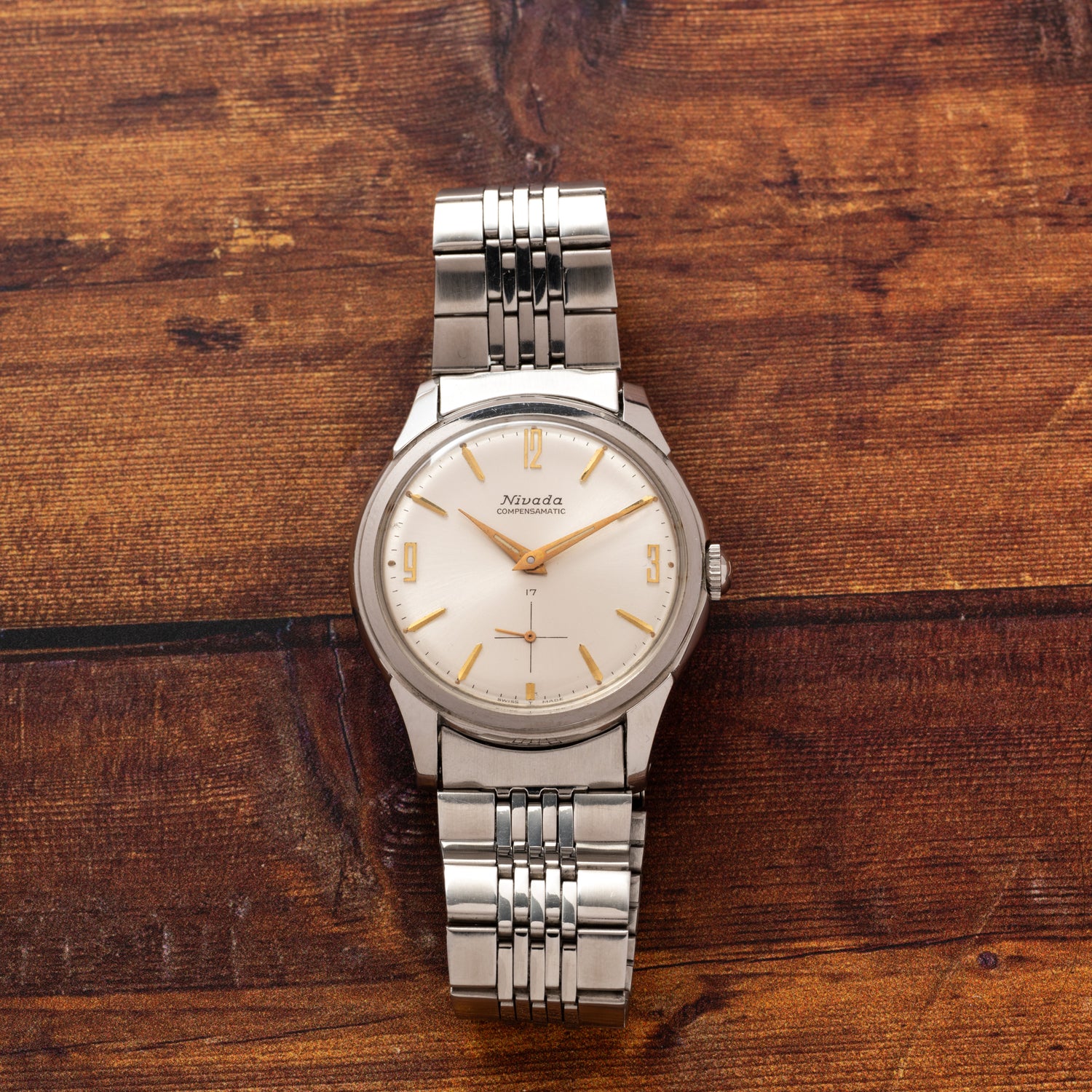 This particular example embodies that heritage in steel minimalism — a clean dial marked by gold-tone indices, a subtle “17” denoting its jewel count, and spare numerals at 3, 9, and 12, balanced by small seconds at six. The original bracelet, signed with Nivada’s “N,” completes the look.