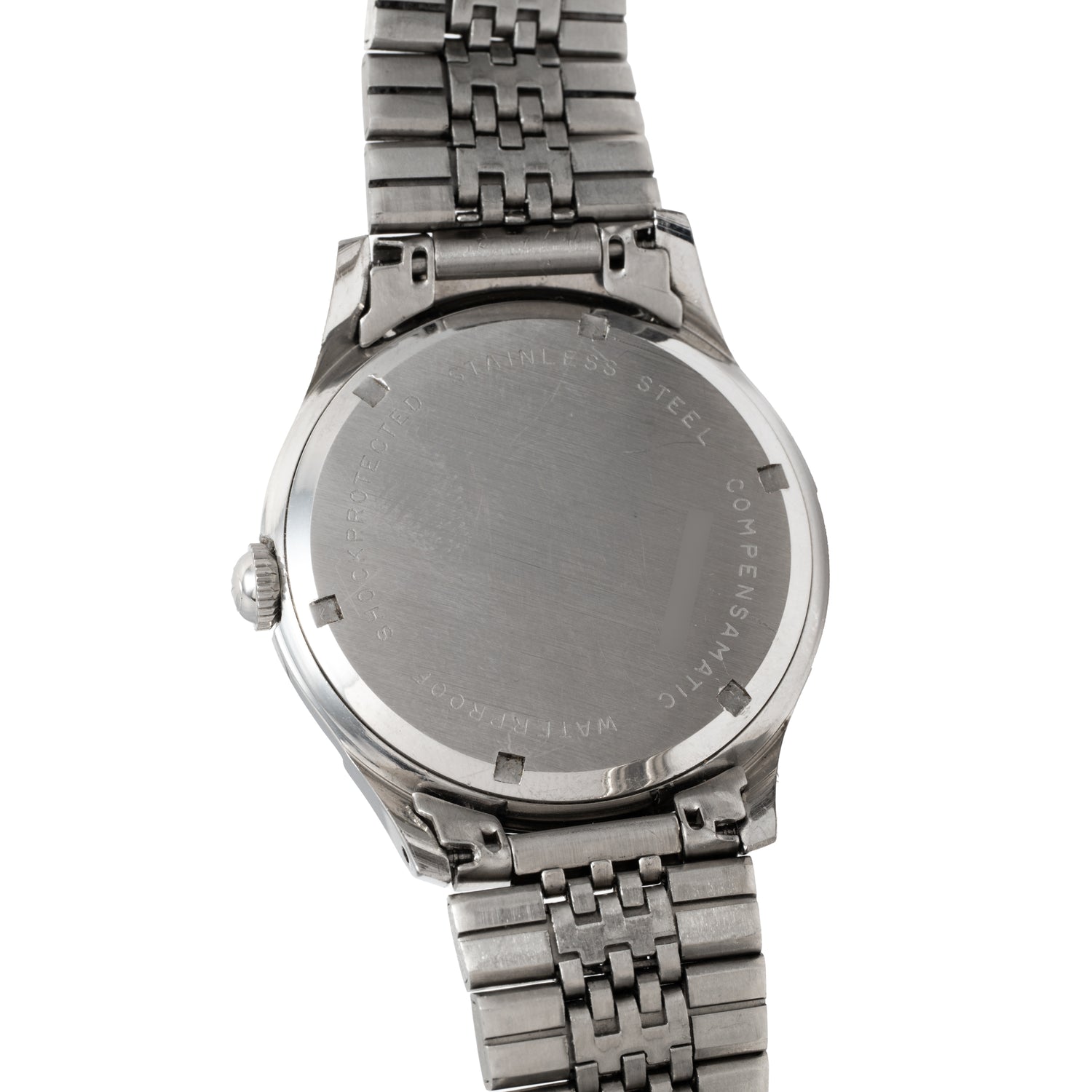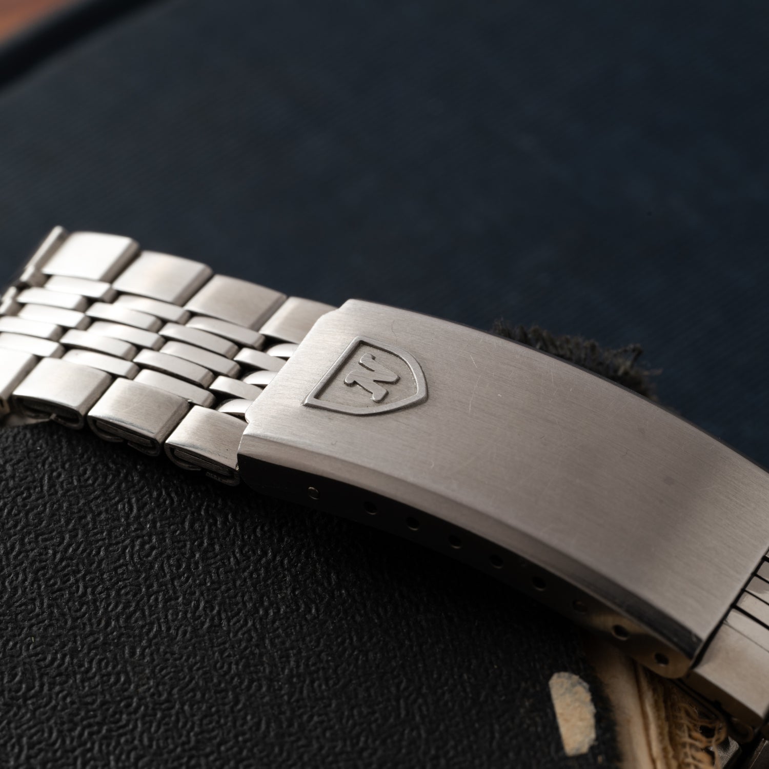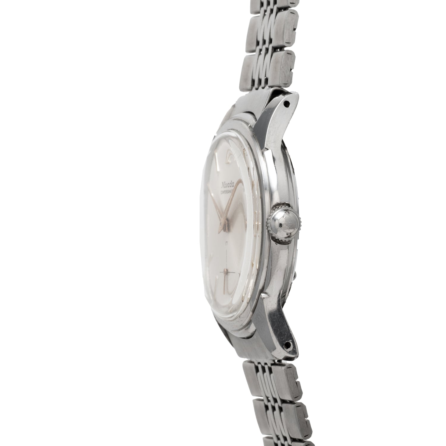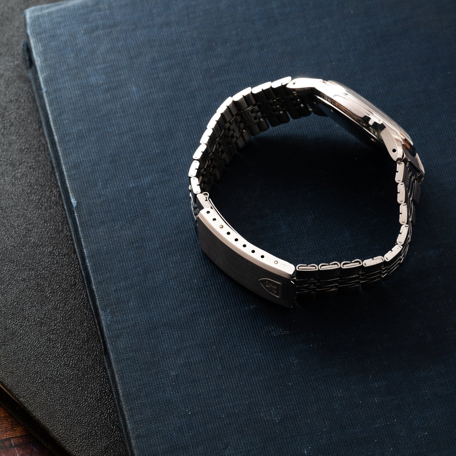 This particular example embodies that heritage in steel minimalism — a clean dial marked by gold-tone indices, a subtle “17” denoting its jewel count, and spare numerals at 3, 9, and 12, balanced by small seconds at six. The original bracelet, signed with Nivada’s “N,” completes the look.