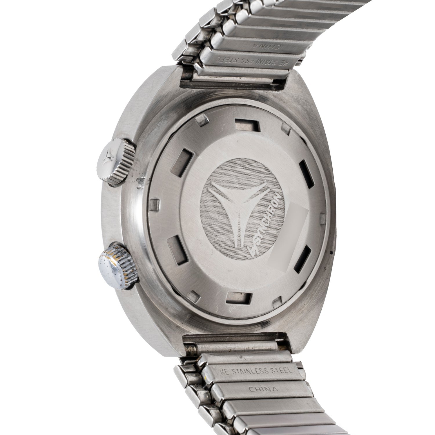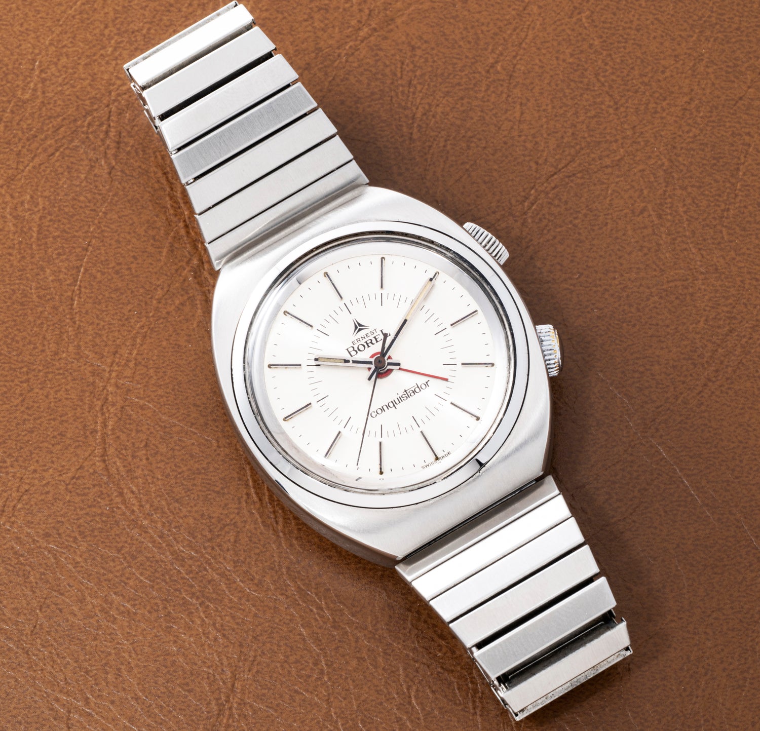 This particular alarm watch, produced by Ernest Borel following the firm's acquisition by the Synchron Group — then-owners of Doxa and Cyma — in 1975, is an under-the-radar alternative to more popular models such as the Jaeger-Lecoultre Memovox and the aforementioned Vulcain Cricket. Housed in a brushed 37mm stainless steel tonneau case with a polished bezel, an acrylic crystal, dual signed alarm crowns, and a neat flat-link bracelet, it features a handsome silvered dial with applied 'baton' indices, an inner minute track, and a luminous 'sword' handset with a red alarm hand.