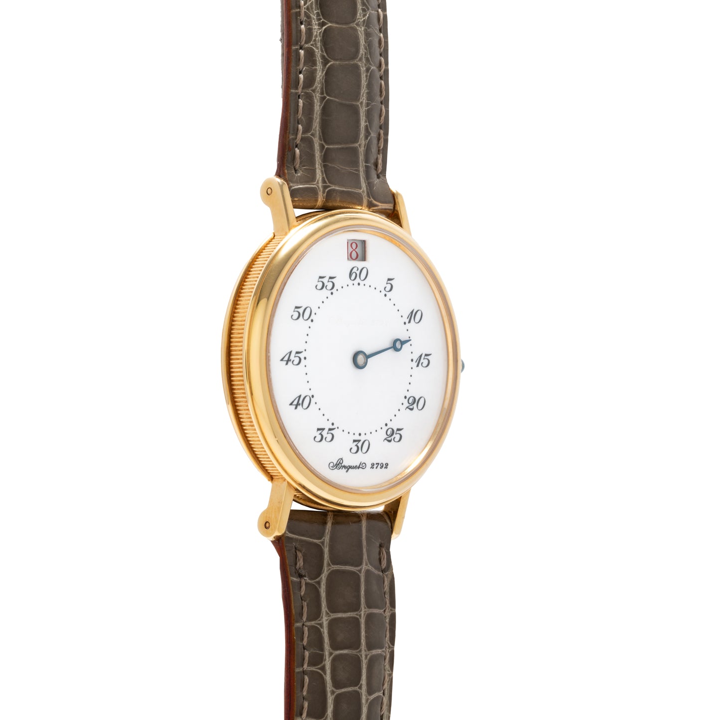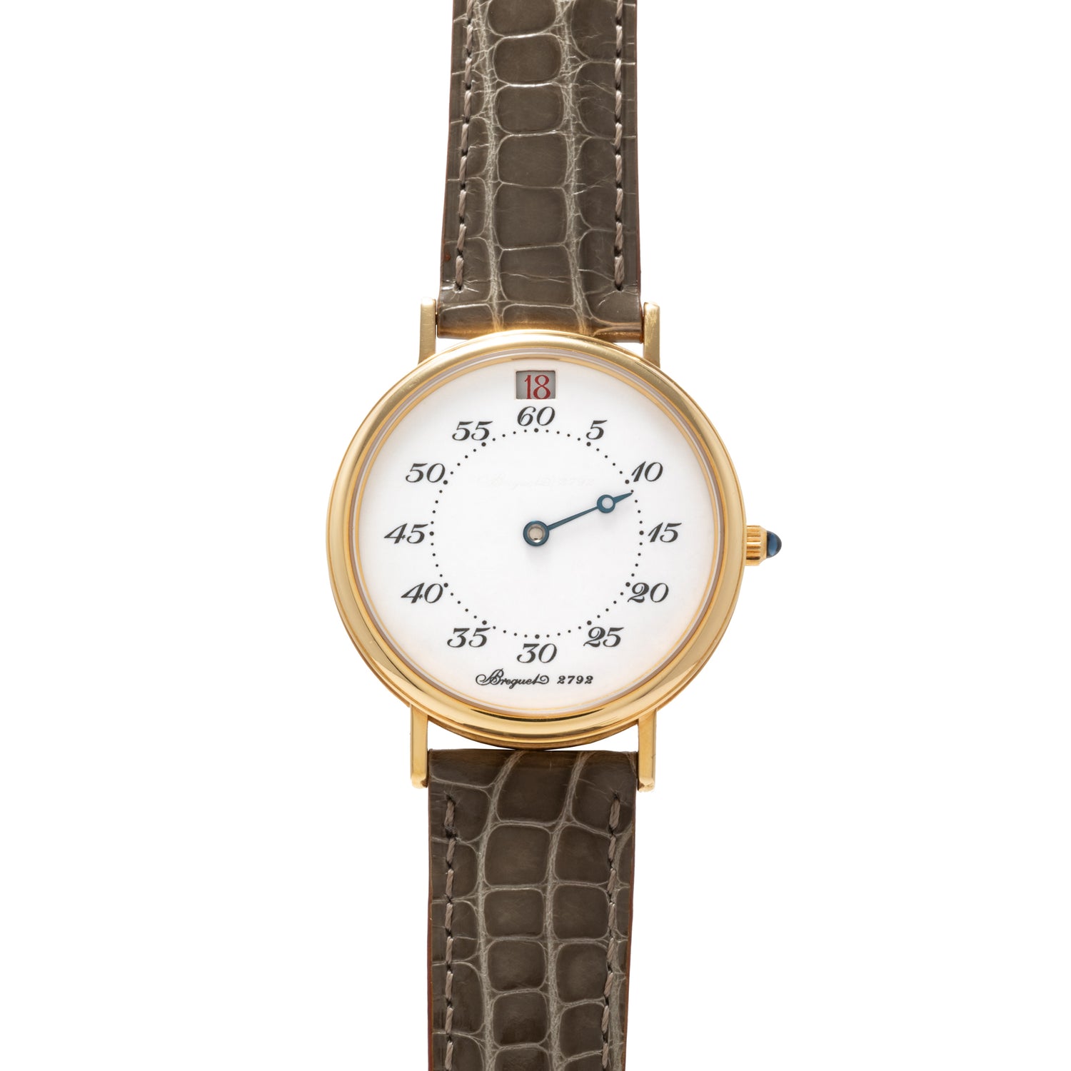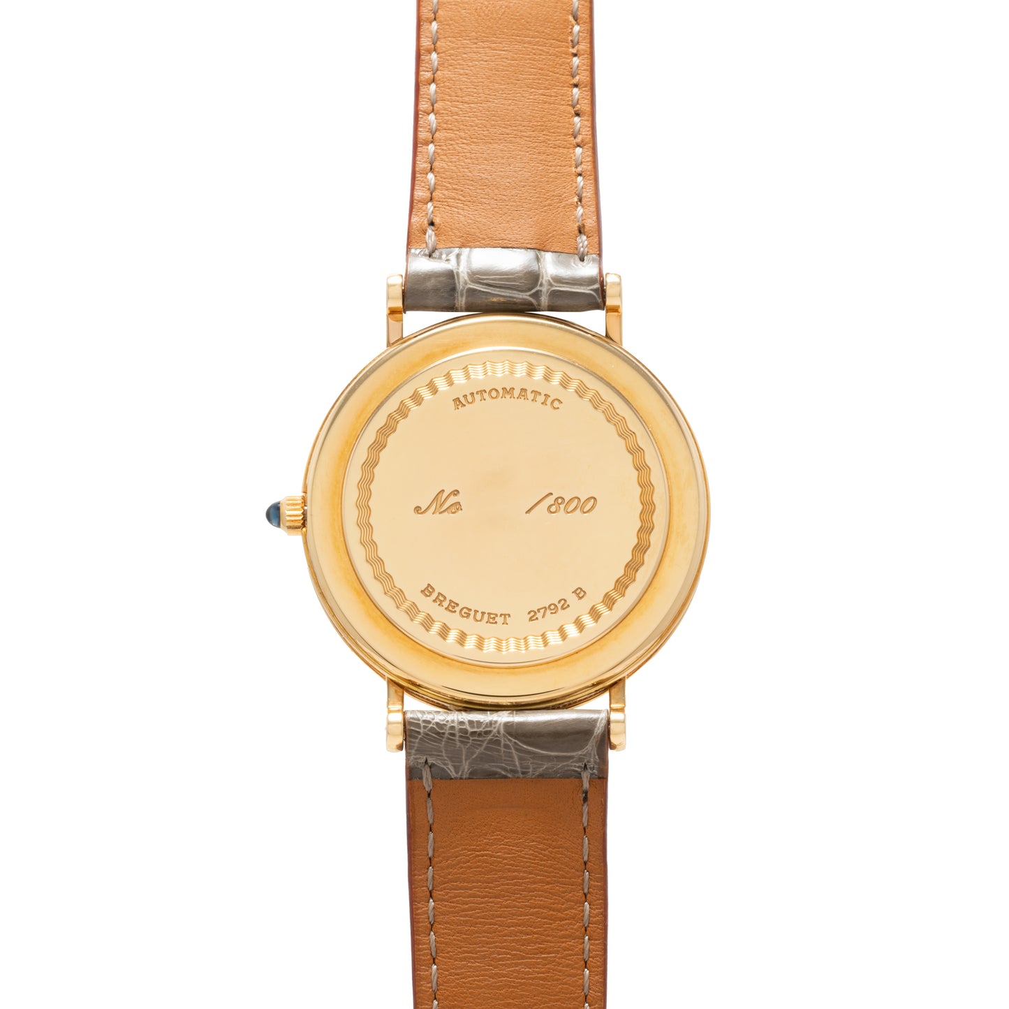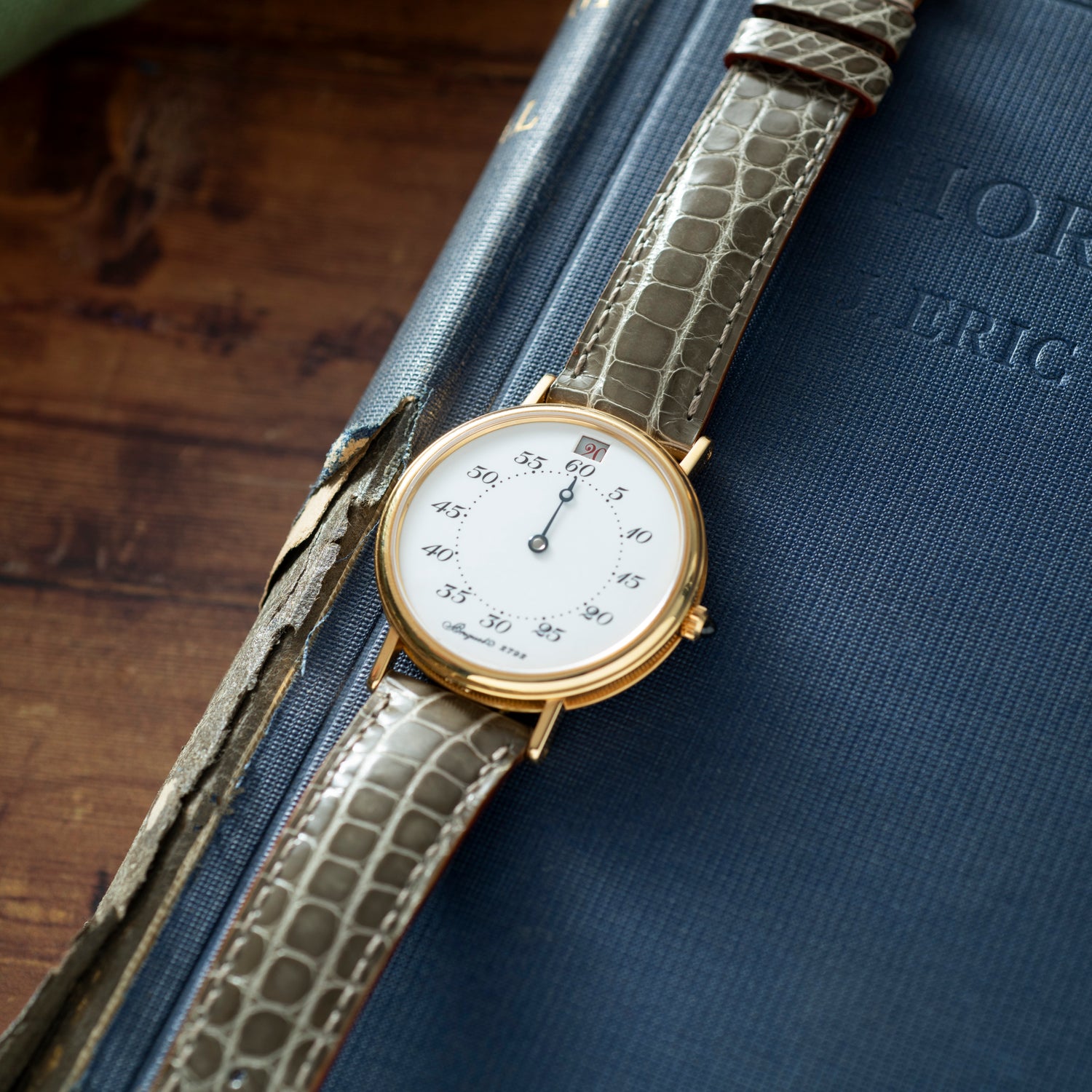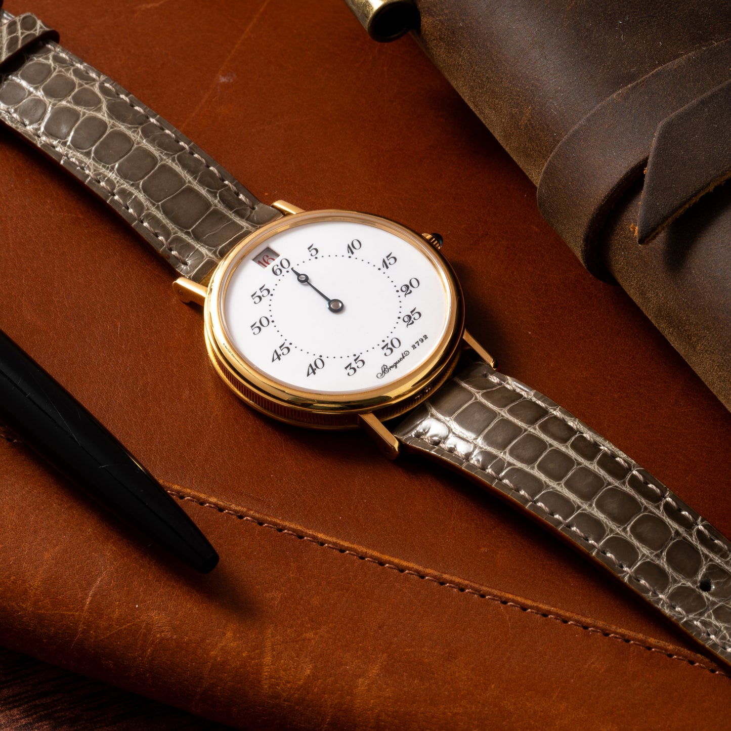 Powered by an automatic Breguet Calibre, this piece is outfitted with an aftermarket, taupe alligator leather strap with its original 18K yellow gold, Breguet pin buckle.