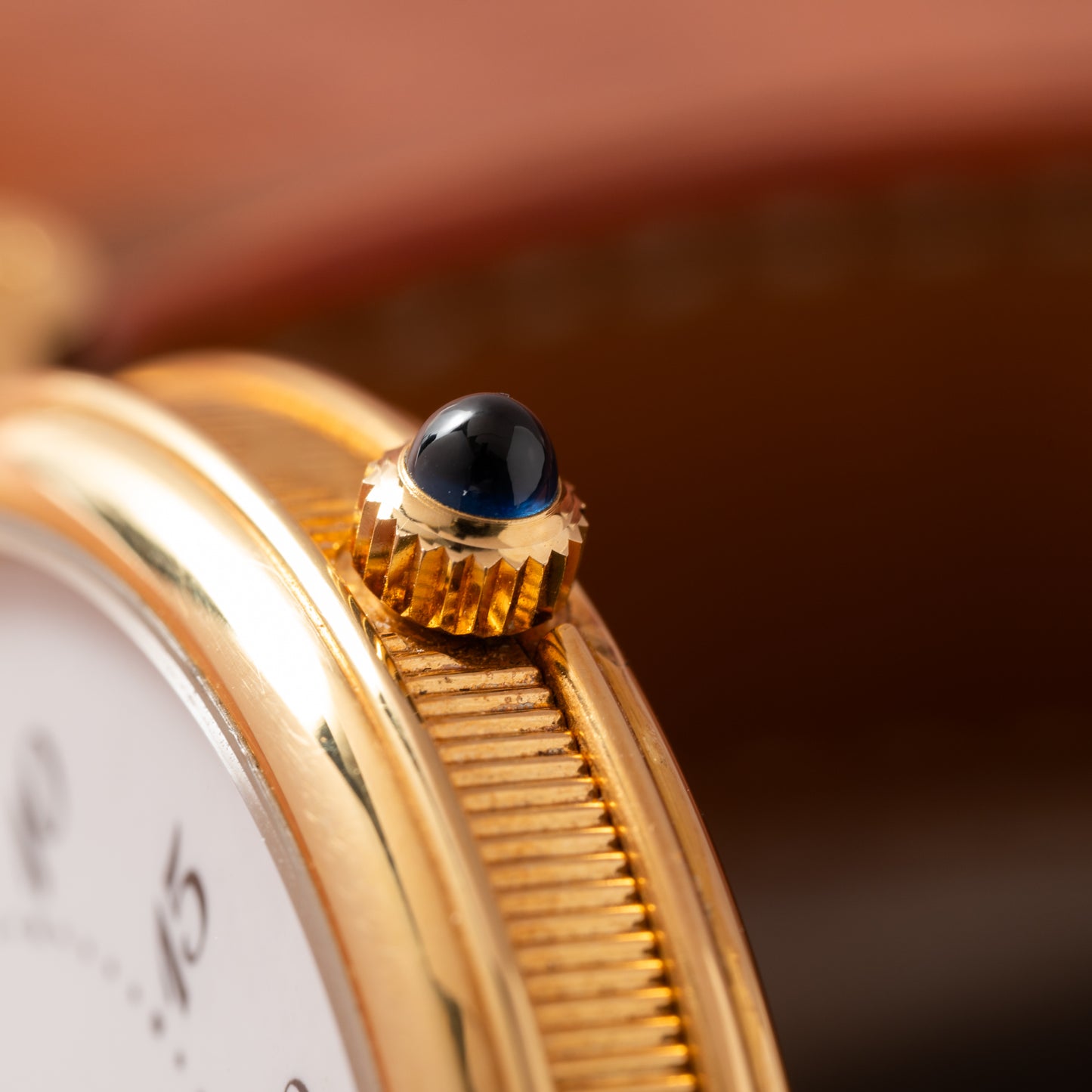 Dating to the late 1990s and limited to just 800 pieces, this Breguet Jump Hour 'Heures Sautantes' features a 37mm 18K yellow gold case with straight lugs, cabochon-style sapphire crown and the distinguishable coin-edge finishing along its case flanks. While we're used to seeing guilloché finishing or an open-work style, this piece can be considered a bit restrained for the storied manufacture. Adorned with Breguet numerals over a white enamel dial, this piece features a singular Breguet hand paired with a 'jump hour' aperture at 12 o'clock.