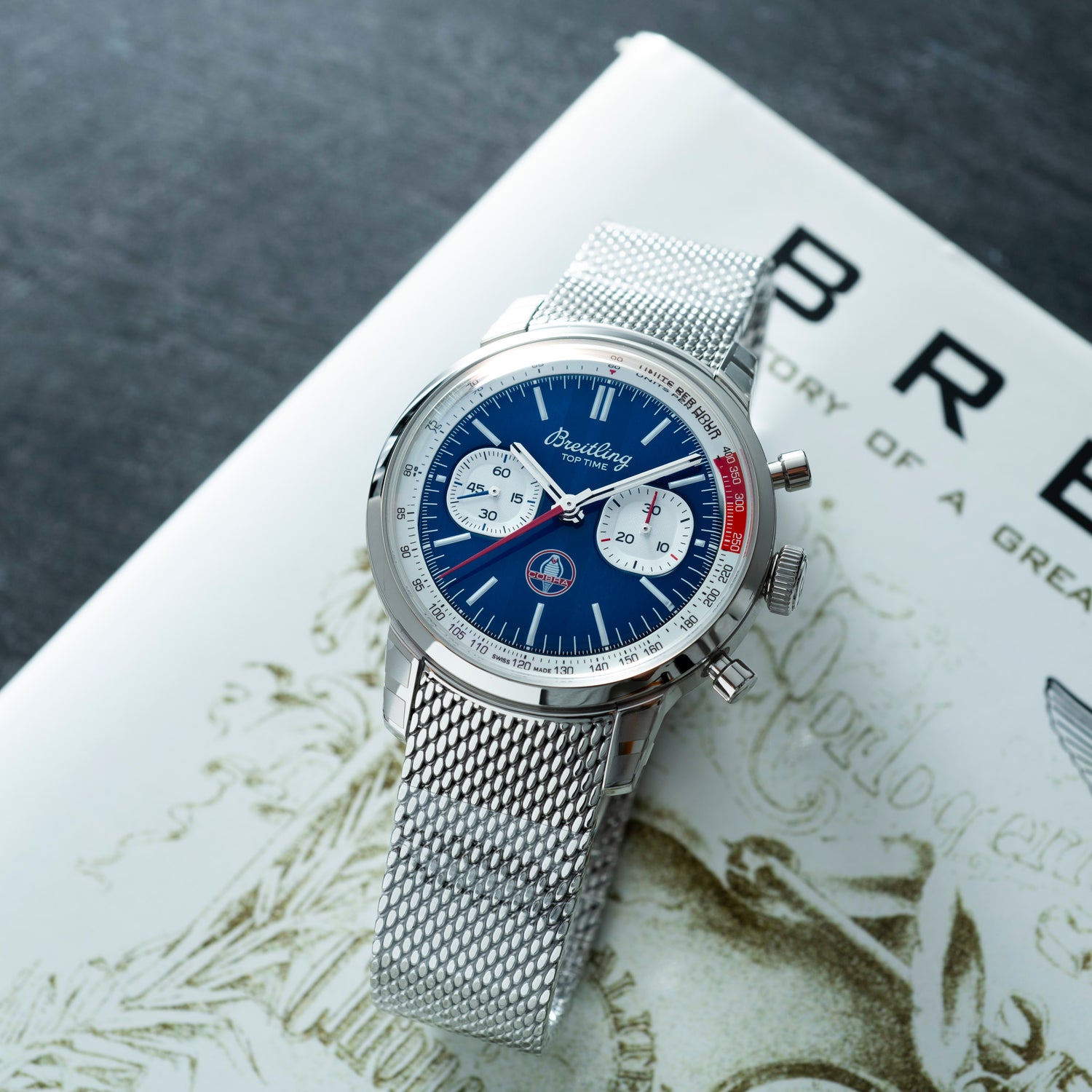 –When Breitling launched the Top Time in the early 1960s, it was meant to be a simpler, more affordable alternative to the brand's higher-end pilot's watch offerings. Aimed at consumers 25 and other, it featured clean lines, an oversized 38mm case in steel or gold, and dials in a kaleidoscopic range of colors, including funky “radio” patterns ideal for the fashion-forward young man (or woman).