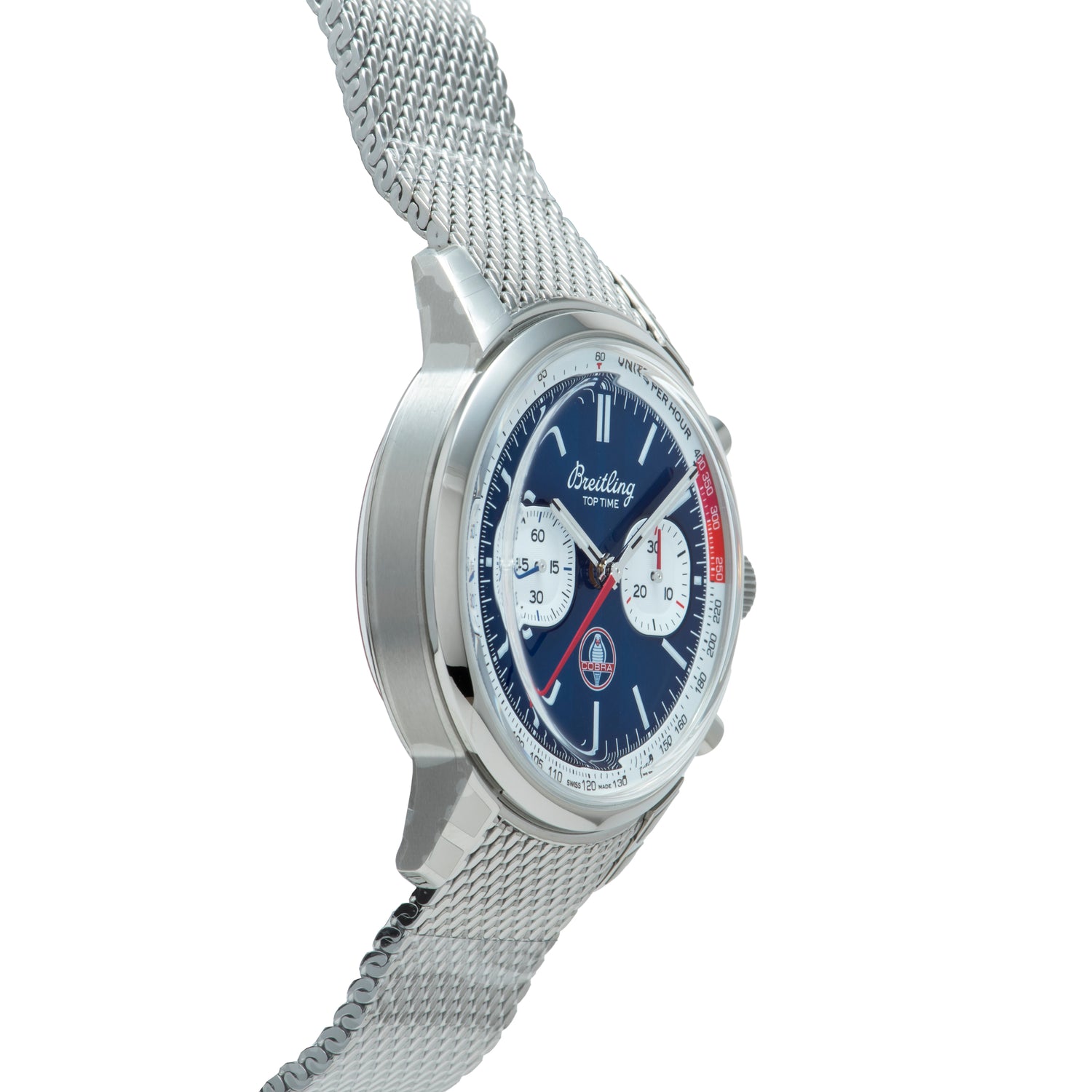 This particular Top Time, a Reference AB01763A1C1A1 celebrates the famous Shelby Cobra. Housed in a 41mm stainless steel case with a sapphire crystal, dual pump pushers, and a signed crown, it features a handsome blue sunray dial with the Cobra logo situated at six; an outer multi-color tachymeter scale; a dual-register chronograph with white "squircle" registers; and luminous 'dash' indices. With its bright red accents against a blue and white background, it's a beautiful study in chronograph design, and a cool tribute to one of America's most famous muscle cars.