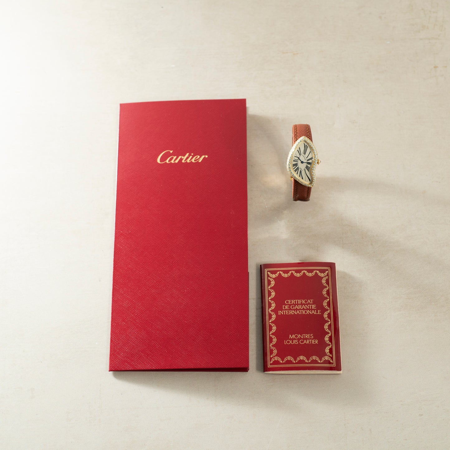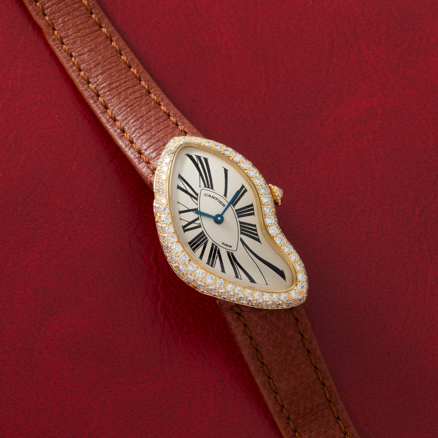 This particular example is one of the rarest iterations of the Crash. Likely a special order from the Paris boutique in the 1990s, this watch features a pave case and diamond crown. As a result of the non-uniform geometry of the case, there are always diamonds catching the light from one of the many angles of the case. This makes this particular variant one of the most vibrant diamond-set watches on the market. The crown is also set with a diamond cabochon rather than the conventional blue sapphire. This piece is set on a brown strap and completed with a correct deployant clasp and comes with a Cartier box and matching certificate dating this piece to 1997.