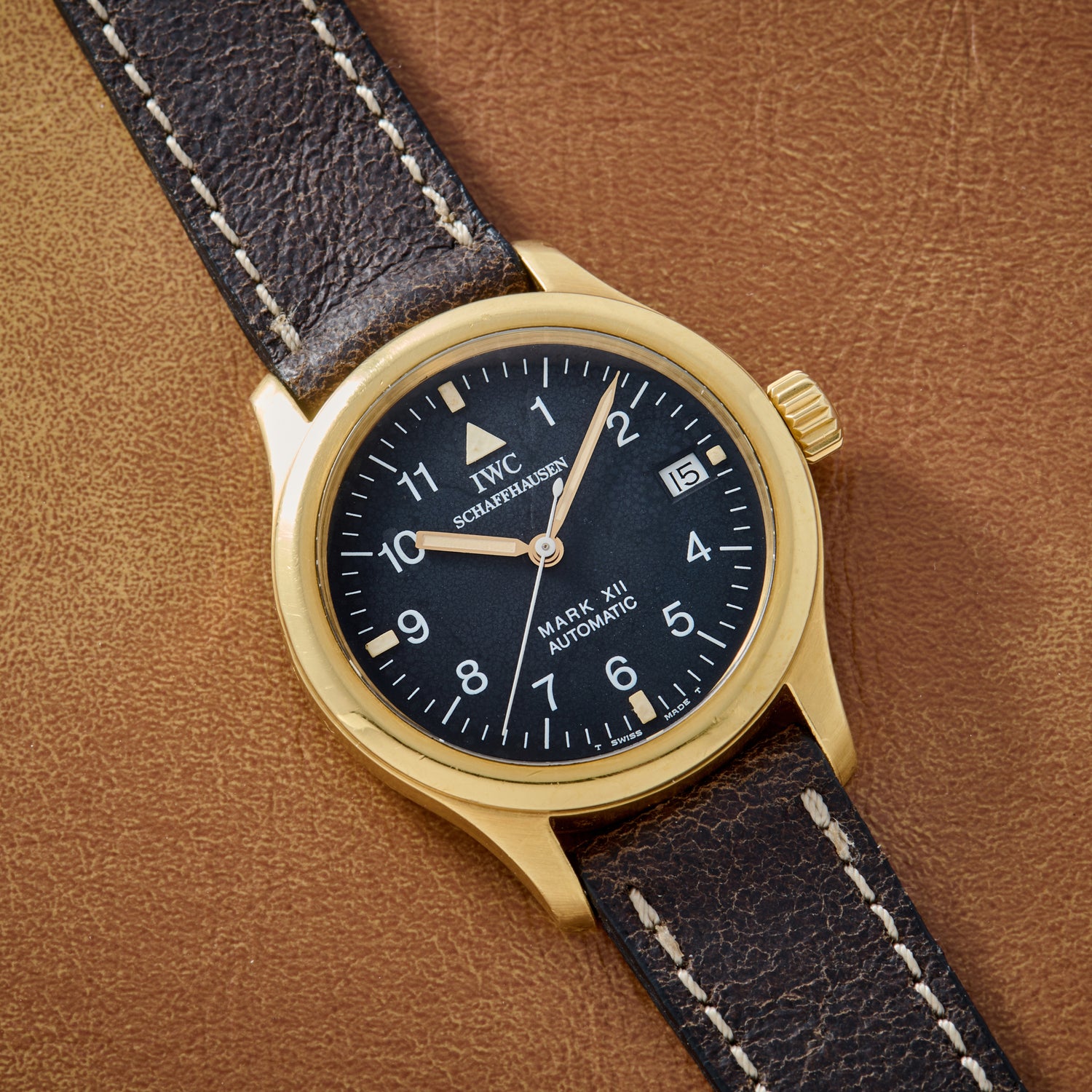 The Mark XII, more refined than its predecessors, launched the Mark line into the realm of civilian wear. And yet it retains the austerity of the military watches it succeeds, with a stainless steel case in un-fussy matte finishing. Except, that is, for the rare 18K yellow gold version, produced in roughly 3,000 pieces. Measuring 37mm in diameter and featuring a screw-down crown, a sapphire crystal, a screw-down caseback, and a smooth bezel, it boasts a handsome black dial with an outer white minute track, 'Arabic' and luminous rectangular and triangular tritium indices, a date widow at 3 o'clock, and IWC's signature luminous 'Mark' handset with a 'sword' minute hand a stubby hour hand.
