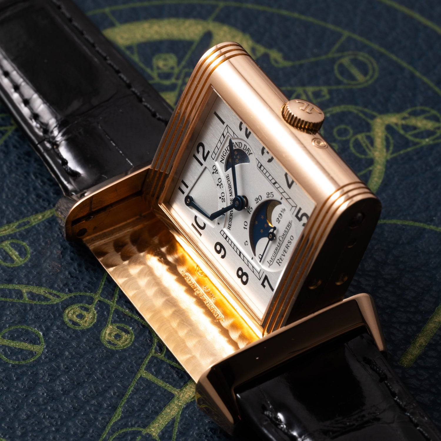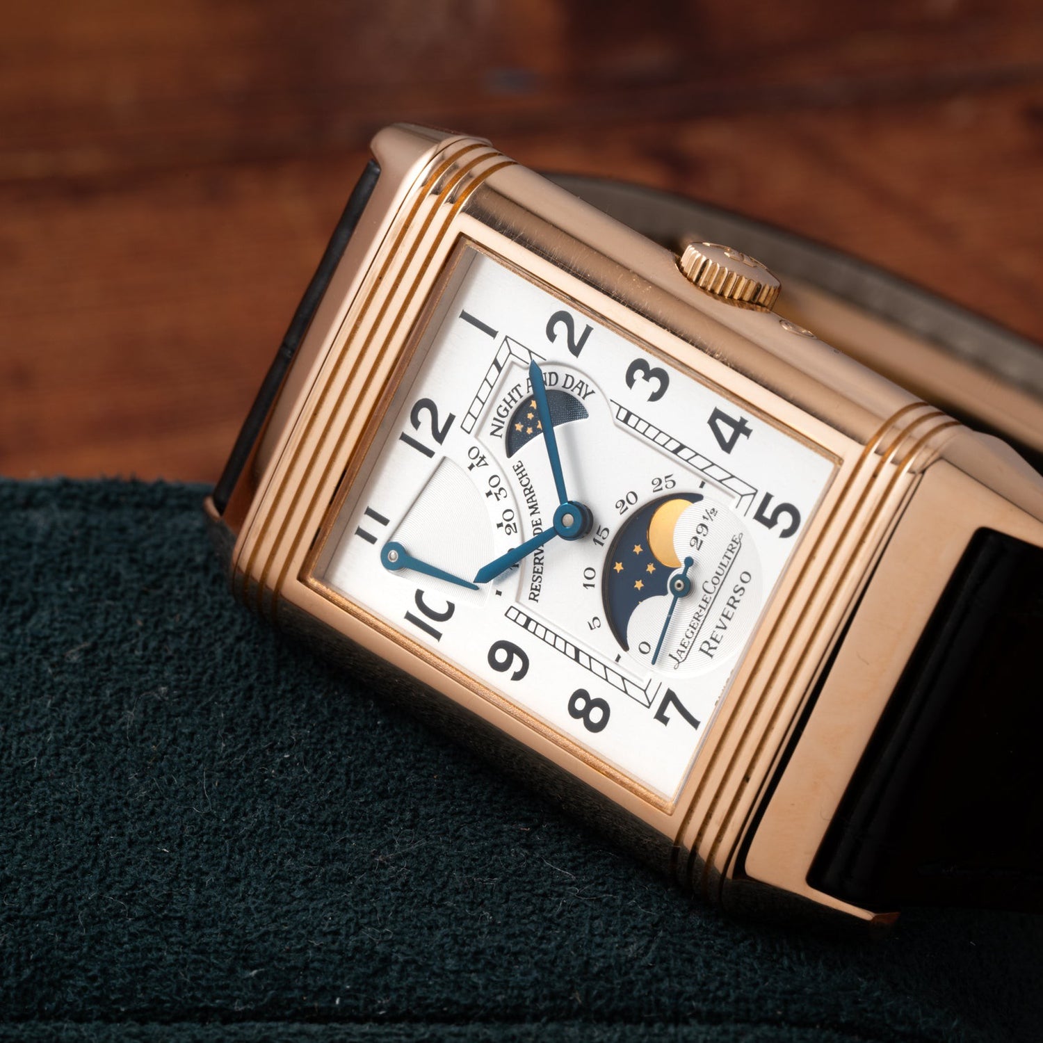The particular Reverso we have here, a Reference 42 270.263, is a Sun & Moon model. Housed in a 43mm x 26mm 18K rose gold case with sapphire crystals, and a signed rose gold crown, it features a charming silver dial with Arabic indices, a power reserve indicator at 11 o'clock, day/night indicator at 1 o'clock, a moonphase display at 6 o'clock and a matching, blued-steel sword handset.