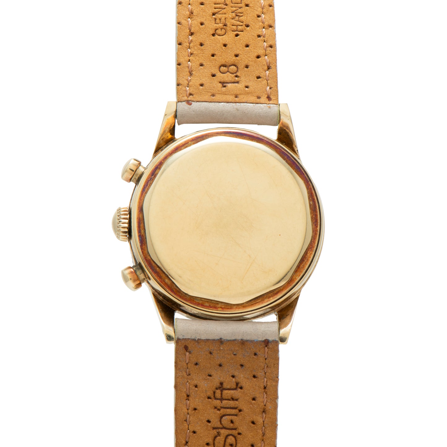 Dating to circa the circa 1960s, this M95 Sub-Sea Chronograph is an absolute gem of a midcentury piece to rival the best. Housed in a 35mm 14K yellow gold case with an onion crown, dual pump pushers, an acrylic crystal, and a screw-down caseback, it features a lovely brushed silver dial with an outer tachymeter scale, an inner 'snail' telemeter scale, applied indices, recessed chronograph totalizers, and a combination luminescent 'baton' and signature M95 'kriss' handset, the latter of which features within the chronograph registers.
