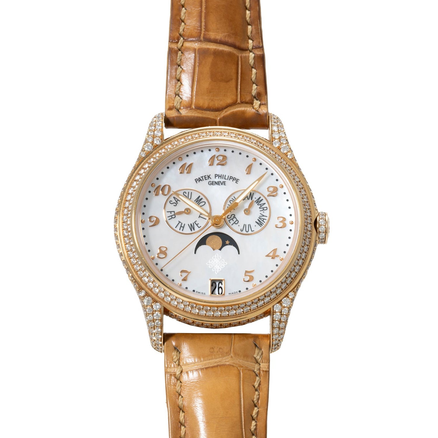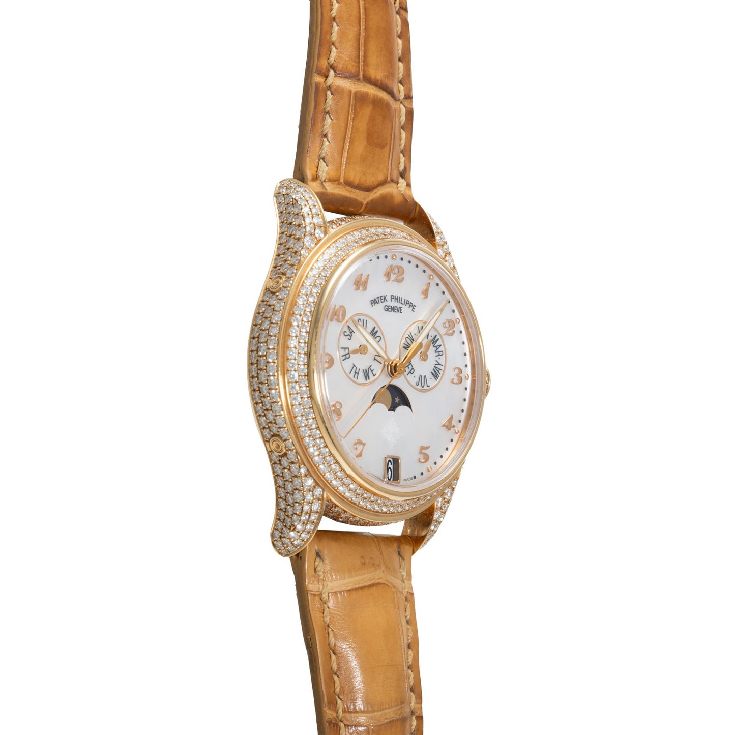 This piece transports us forward to the present day and is a beautiful modern interpretation of the Patek Philippe Annual Calendar complication. A Reference 4937R designed for their ladies' collection, this elegant timepiece features a 37mm 18k rose gold case with contoured lugs, a factory diamond-set bezel, case, and lugs, and a signed crown with a factory diamond setting on the periphery.