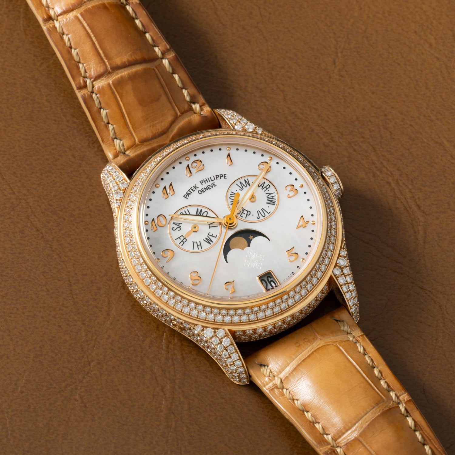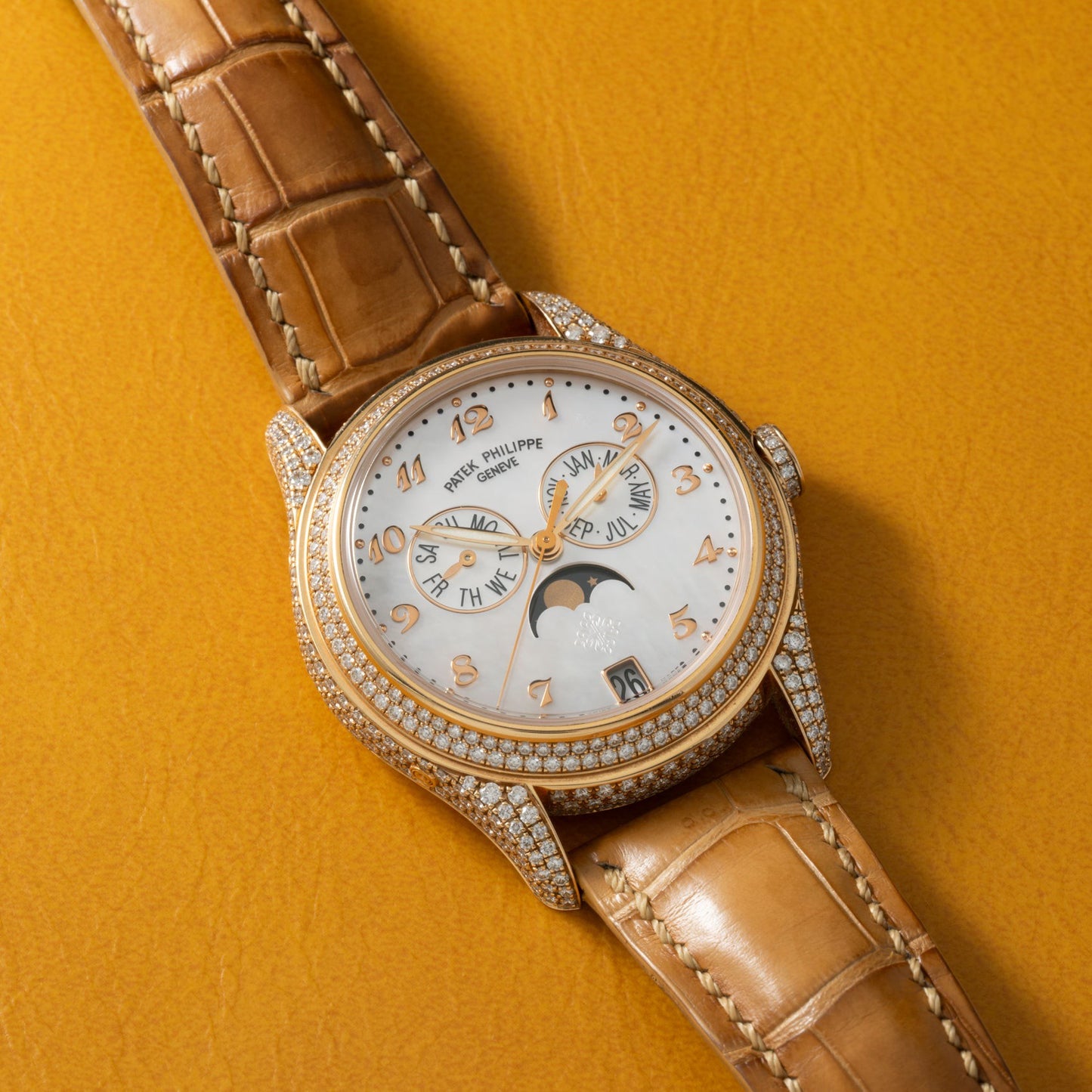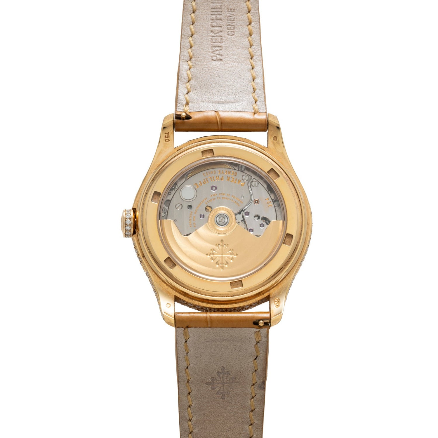 The reverse of the case features a a sapphire exhibition back providing a window through which you can admire the beautiful automatic-winding Patek movement and its yellow gold winding rotor adorned with the hallmark Patek Philippe seal. It comes fitted to a beautiful alligator strap with a matching 18k rose gold diamond-set pin buckle, and includes its box, books, and Certificate of Origin dated 2012.