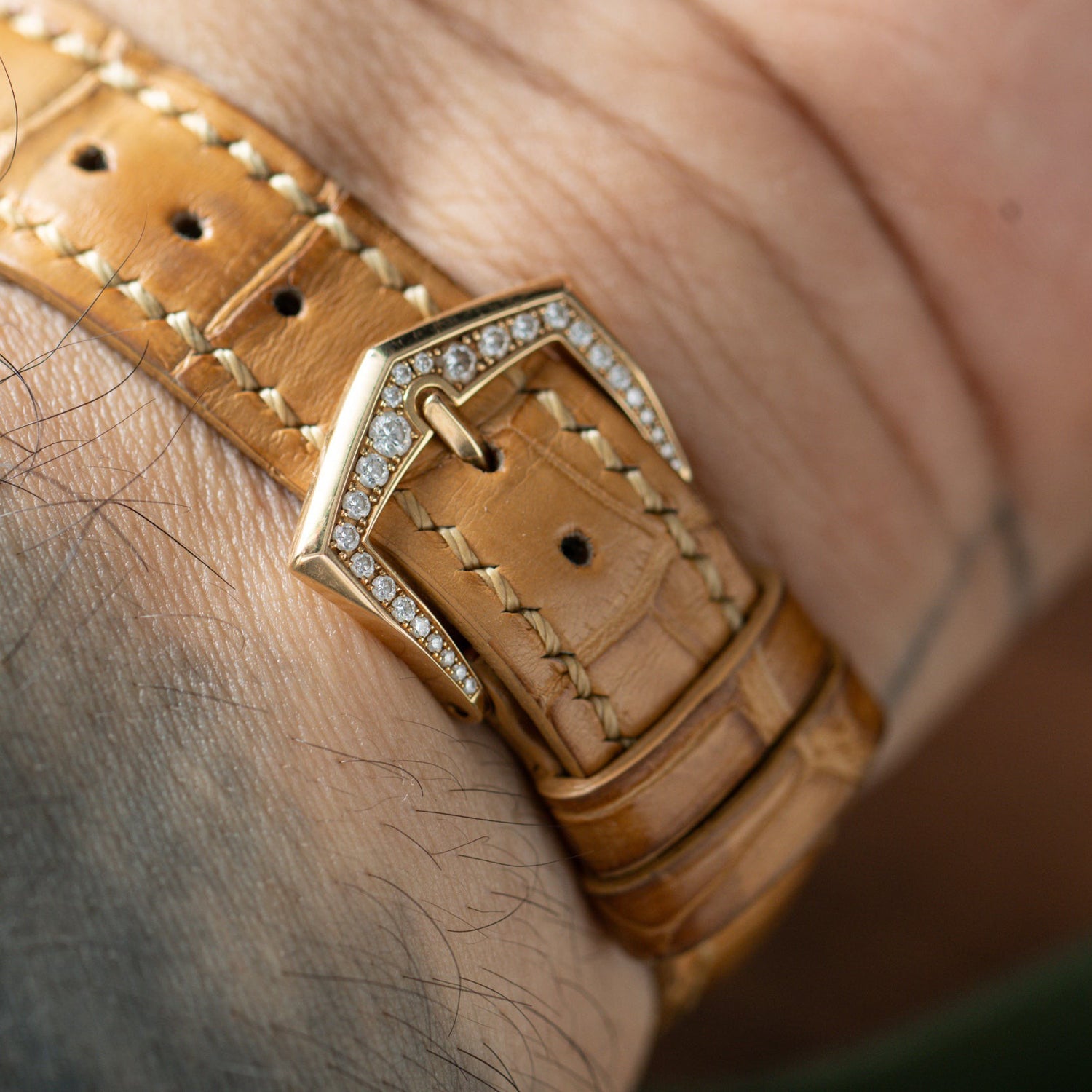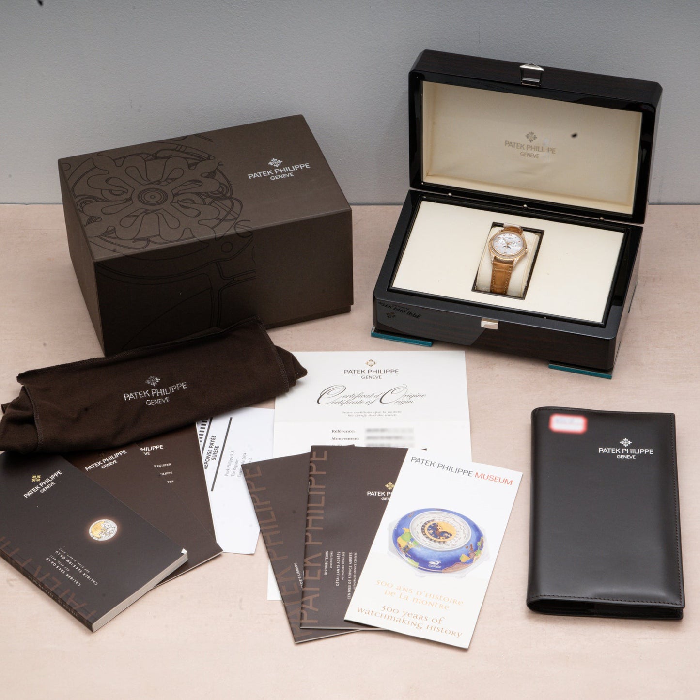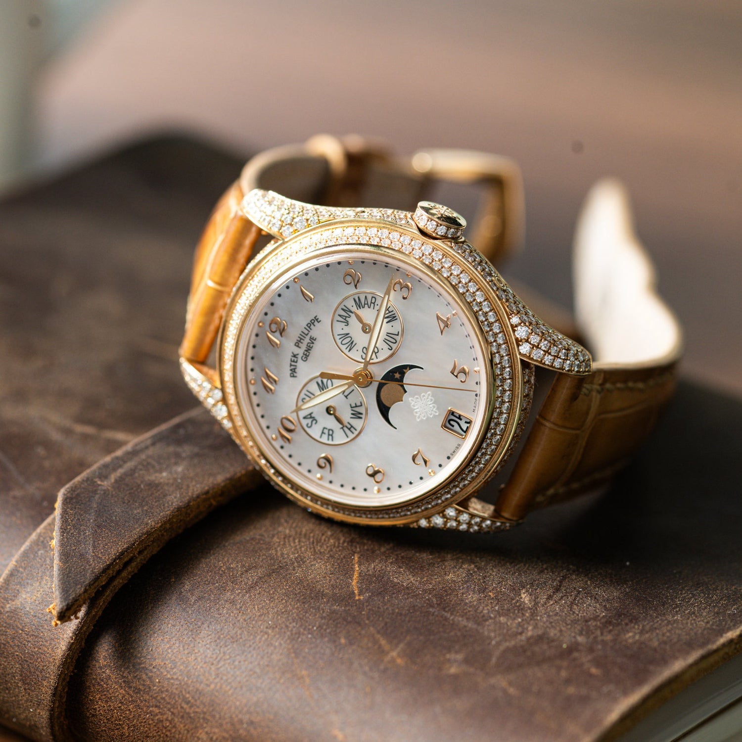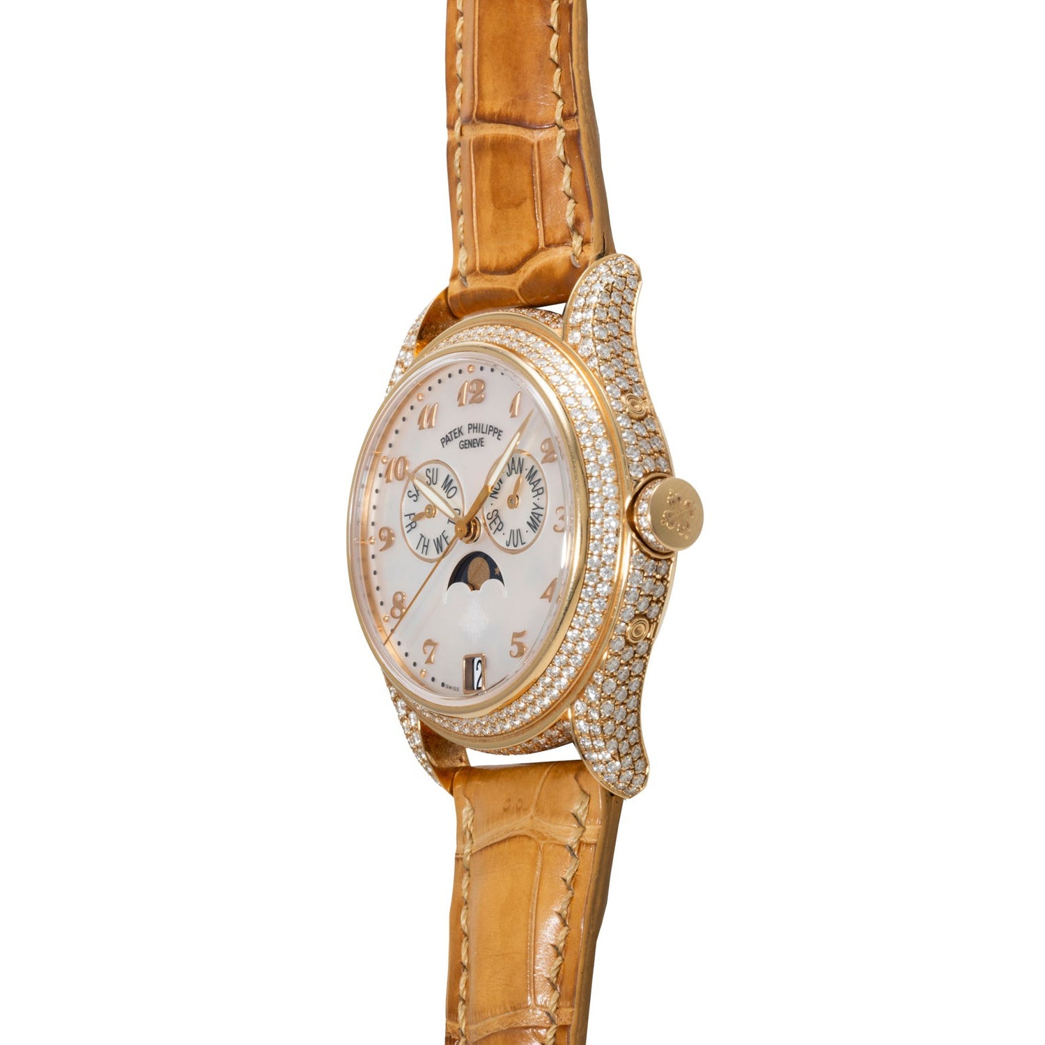 The reverse of the case features a a sapphire exhibition back providing a window through which you can admire the beautiful automatic-winding Patek movement and its yellow gold winding rotor adorned with the hallmark Patek Philippe seal. It comes fitted to a beautiful alligator strap with a matching 18k rose gold diamond-set pin buckle, and includes its box, books, and Certificate of Origin dated 2012.