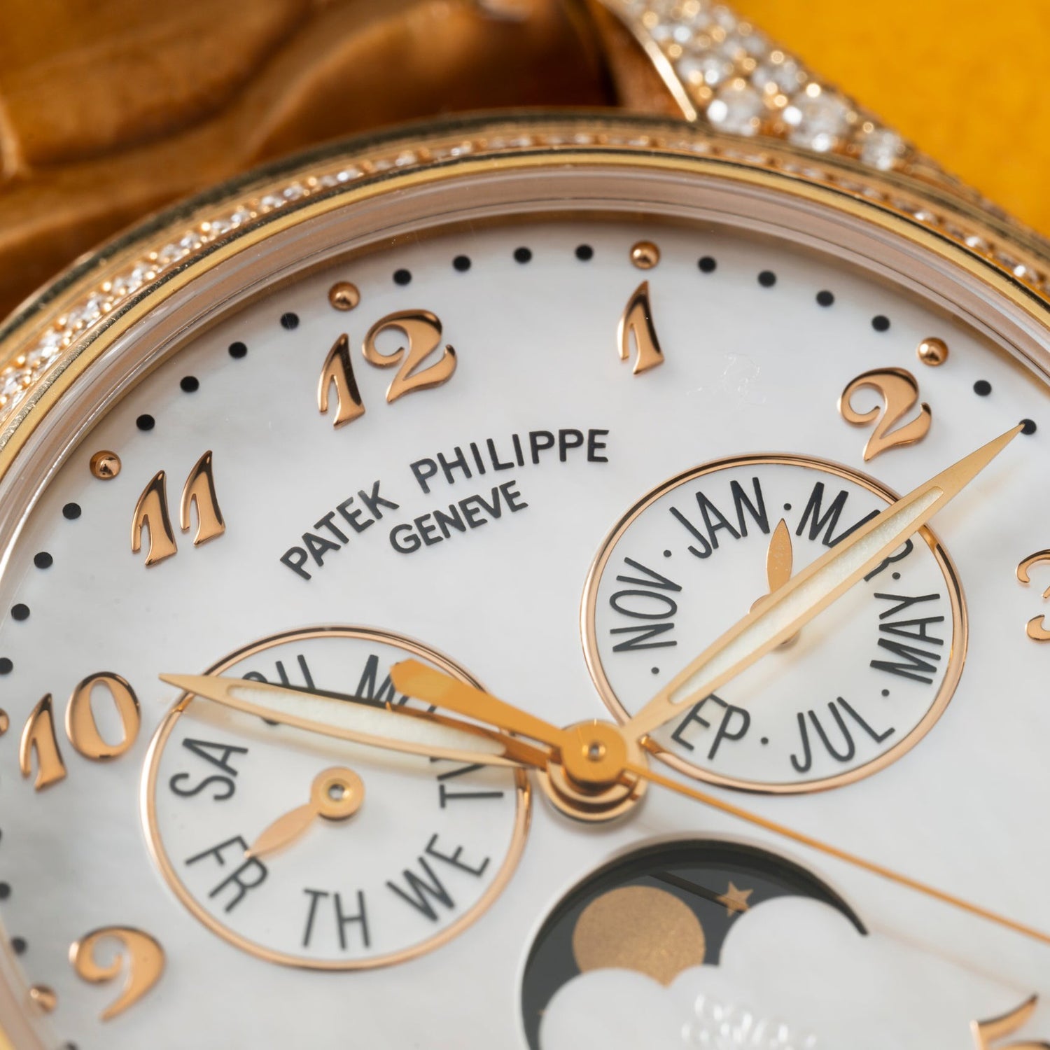 Its stunning mother of pearl dial features applied ‘Roman’ and dot indices, a polished feuille handset, and displays twin subsidiary registers denoting the day and month, as well as moonphase indicator directly above the date window at 6 o’clock.