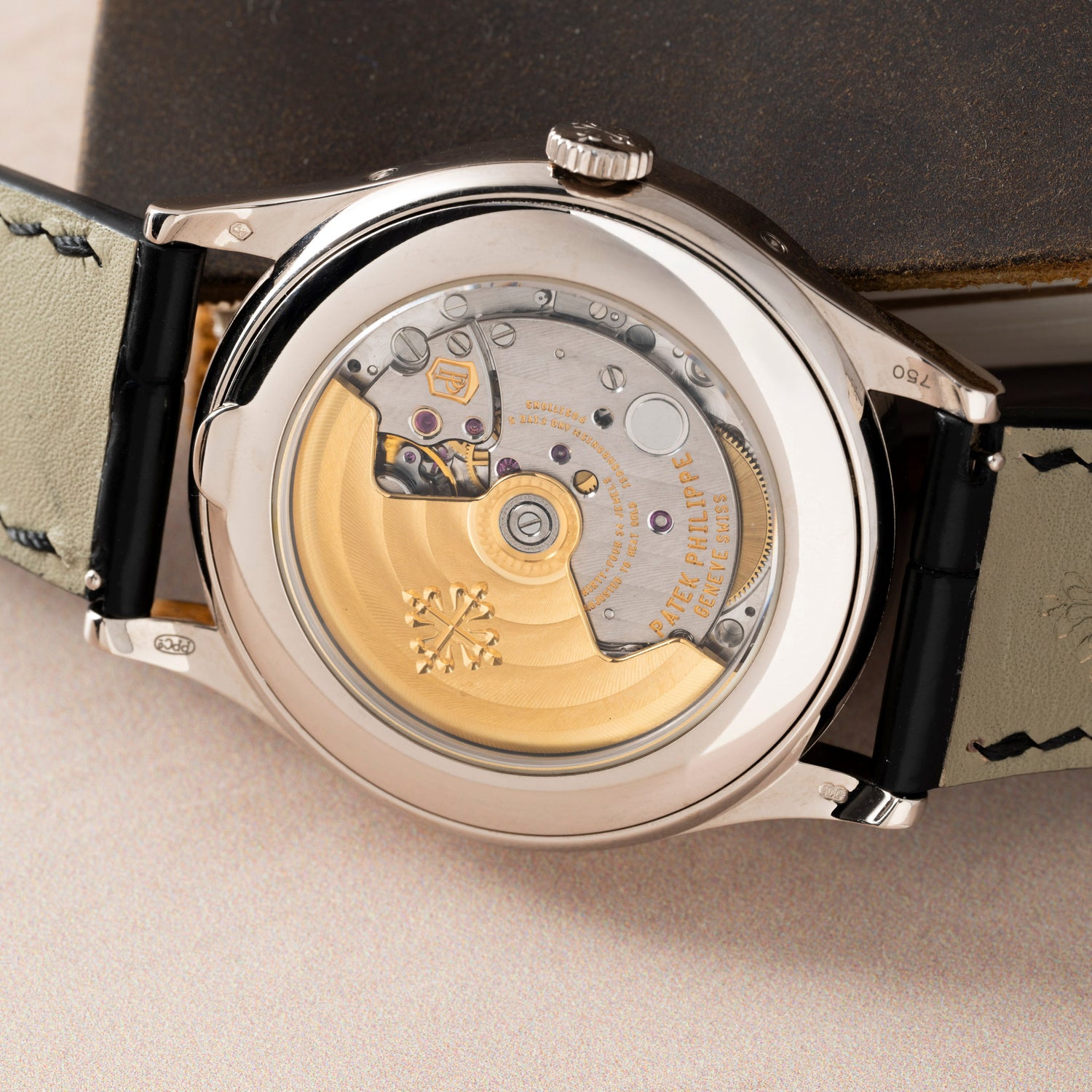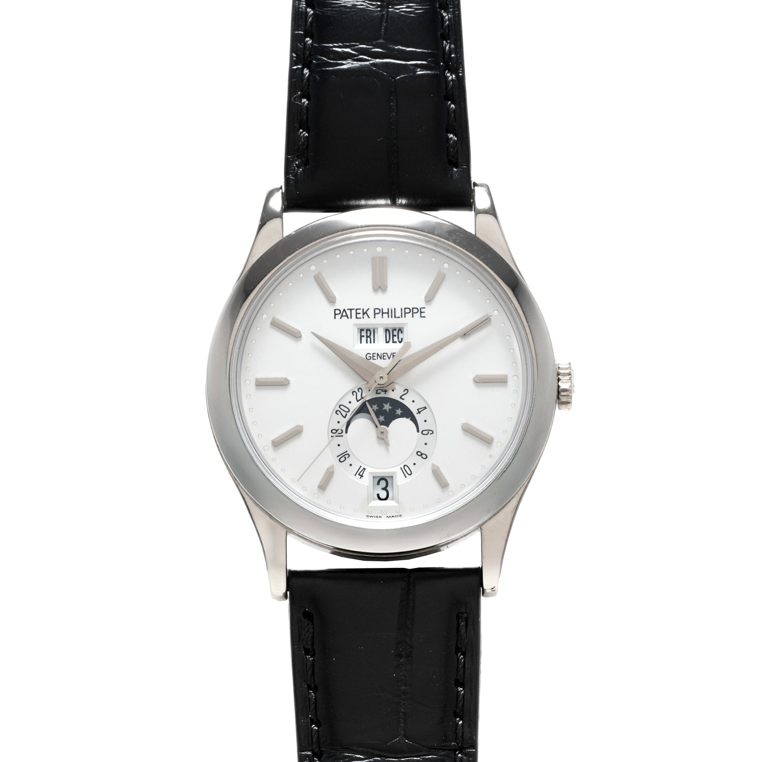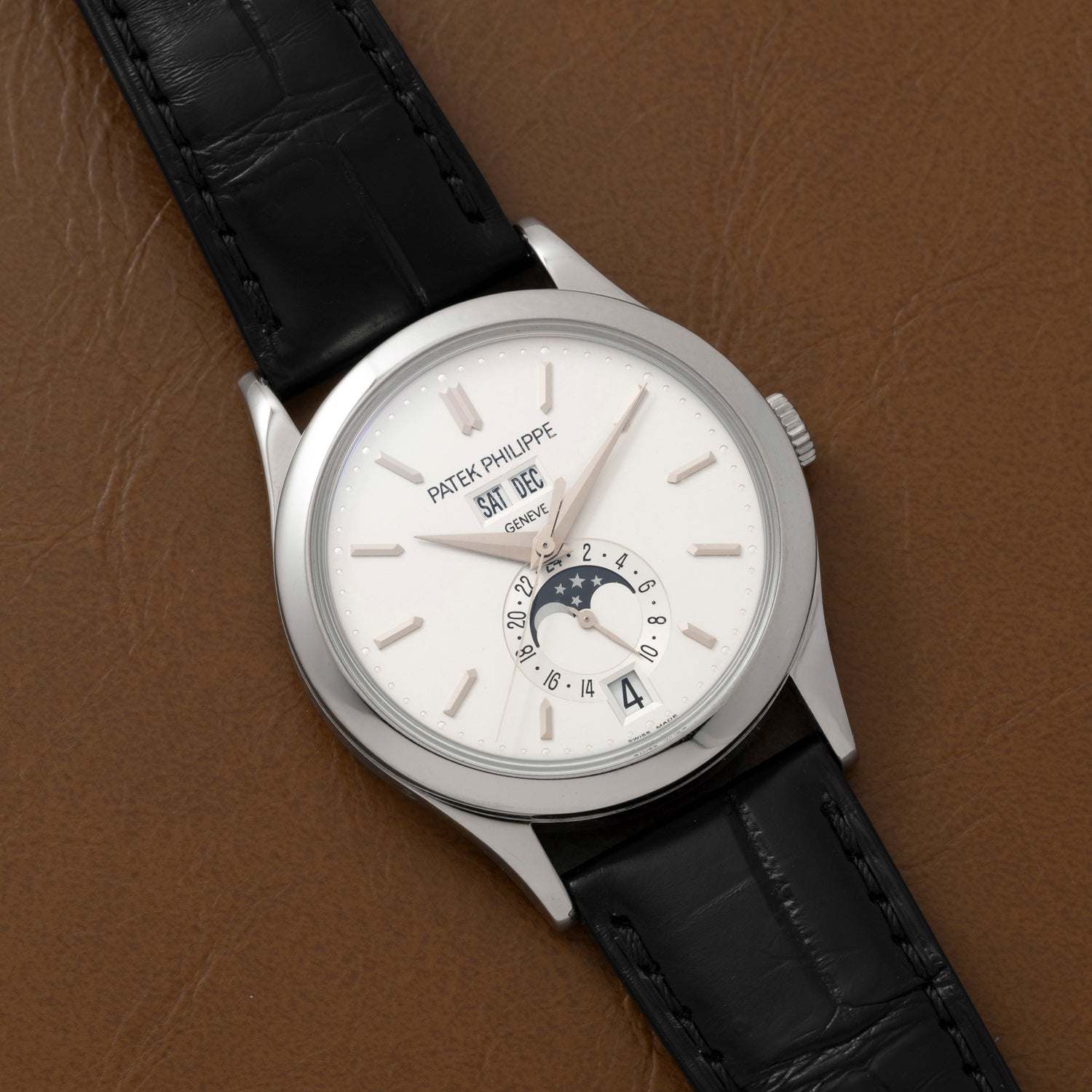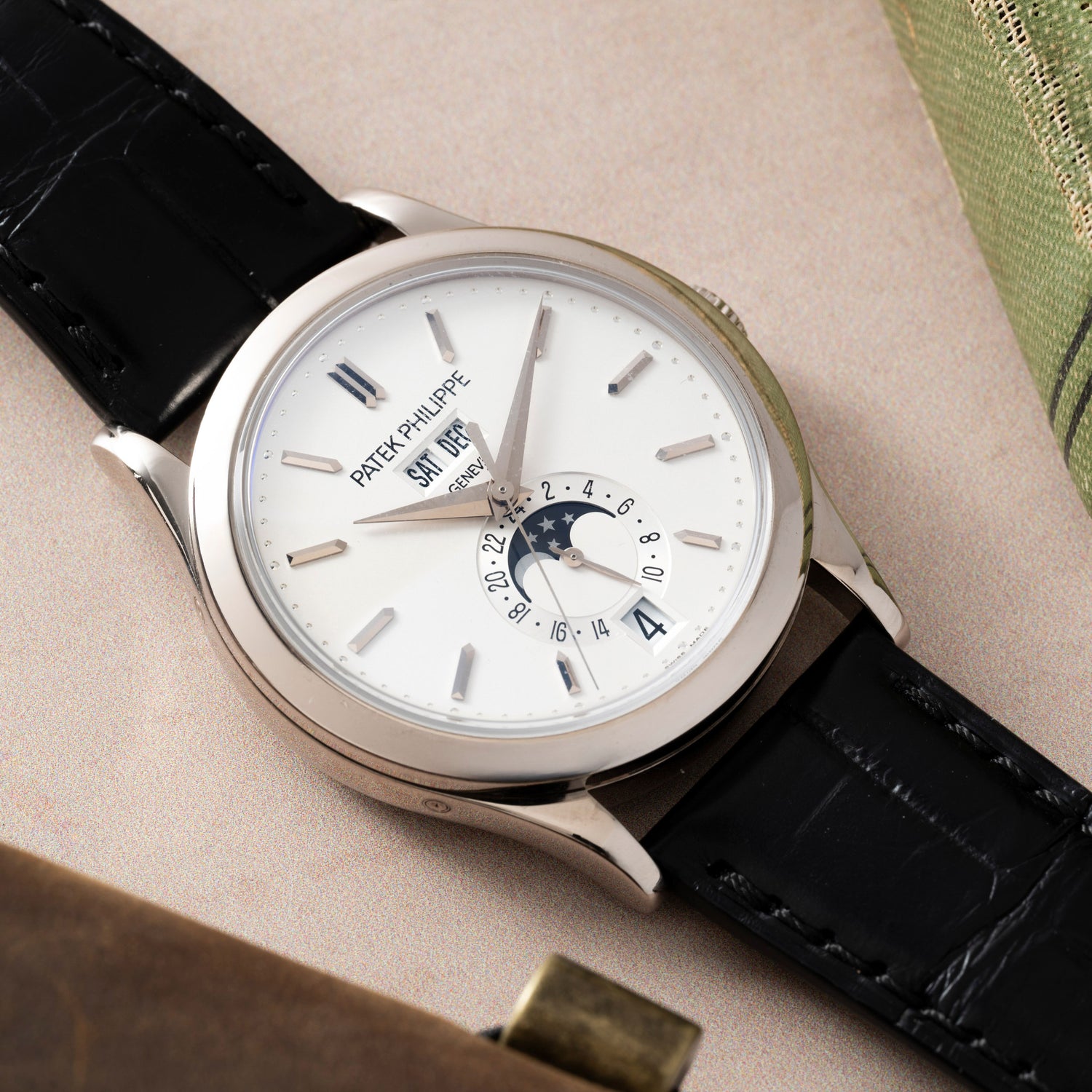 This particular example, a Reference 5396G, is housed in a beautifully proportioned 38.5mm white gold case with a sapphire crystal, a signed crown, and a polished bezel. It features a crisp satin silver dial with applied white gold indices, a matching 'dauphine' handset, date, day of the week, month, and moonphase apertures, and a 24hr indicator at the 6:00 position.