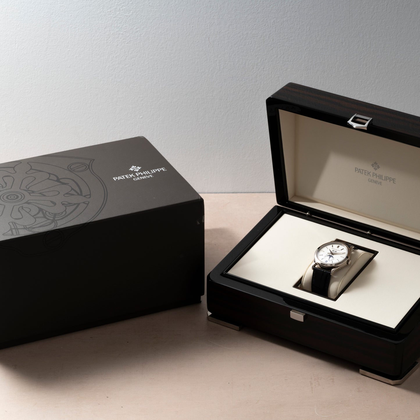 Powered by Patek Philippe's Caliber 324 S QA LU 24H automatic winding movement, it comes paired to a signed black alligator leather strap with a signed, 18k white gold deployant clasp. It also includes its inner and outer boxes.