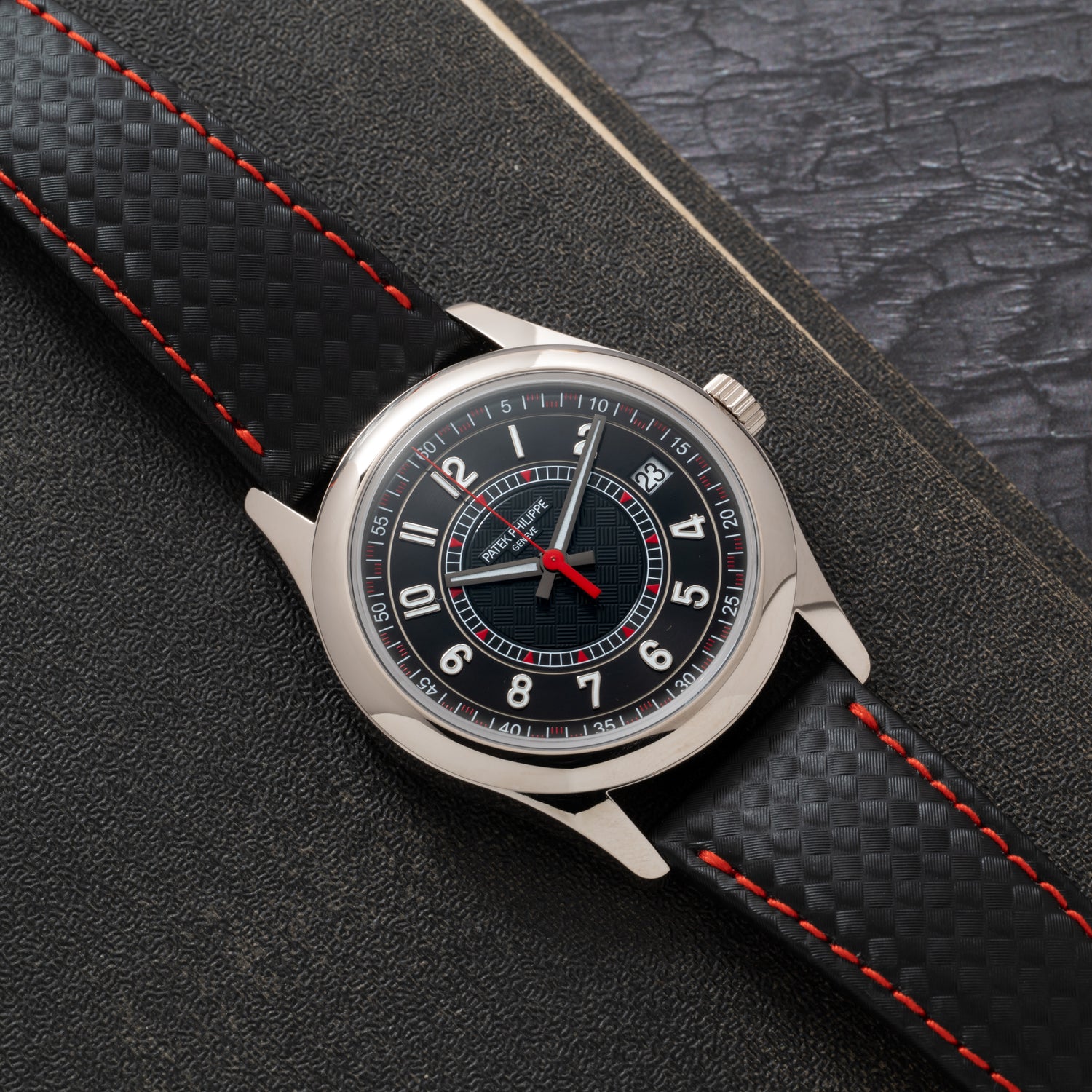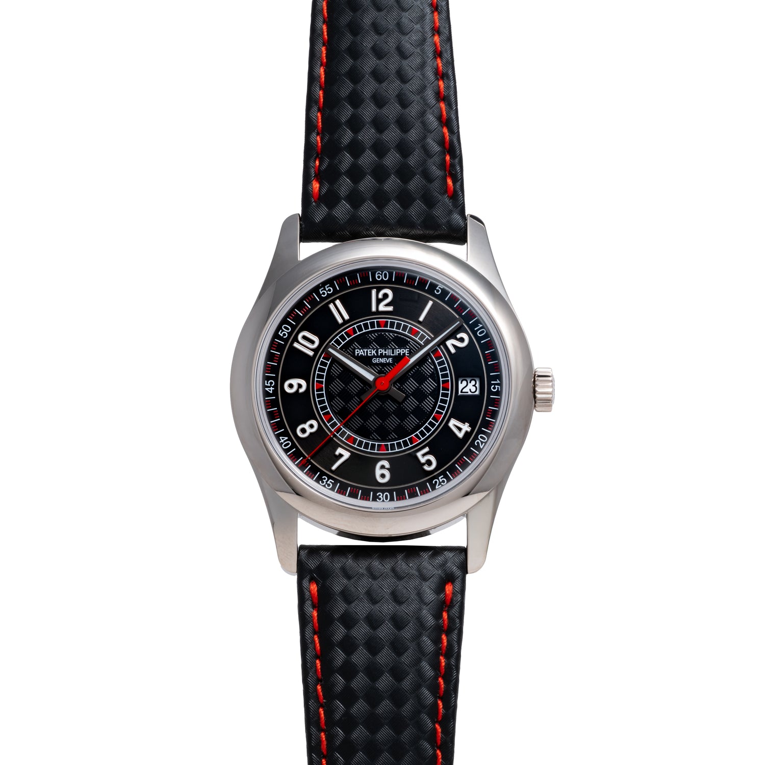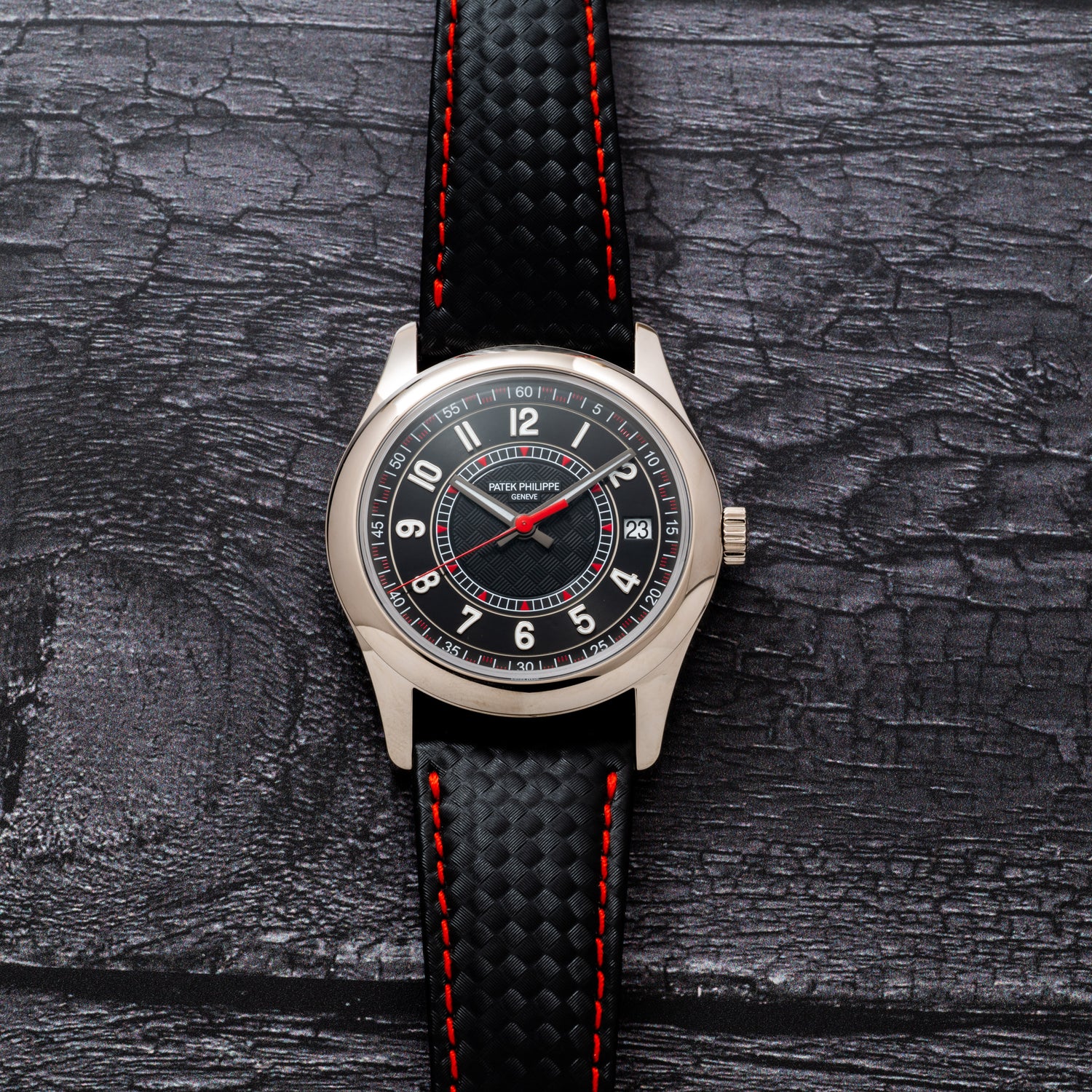 Housed in a 40mm 18K white gold case, this piece features a polished bezel and case complemented by a sapphire crystal and a signed crown. The black luminous dial features a matching white gold handset and radially configured, luminous, white gold Arabic indices. Straying away from the traditional dressier aesthetics of the Calatrava model, the Patek Philippe design team elected to add sportier design notes with its center dial adorned with a 'carbon' finish and a red accented, checker-style, minute track.