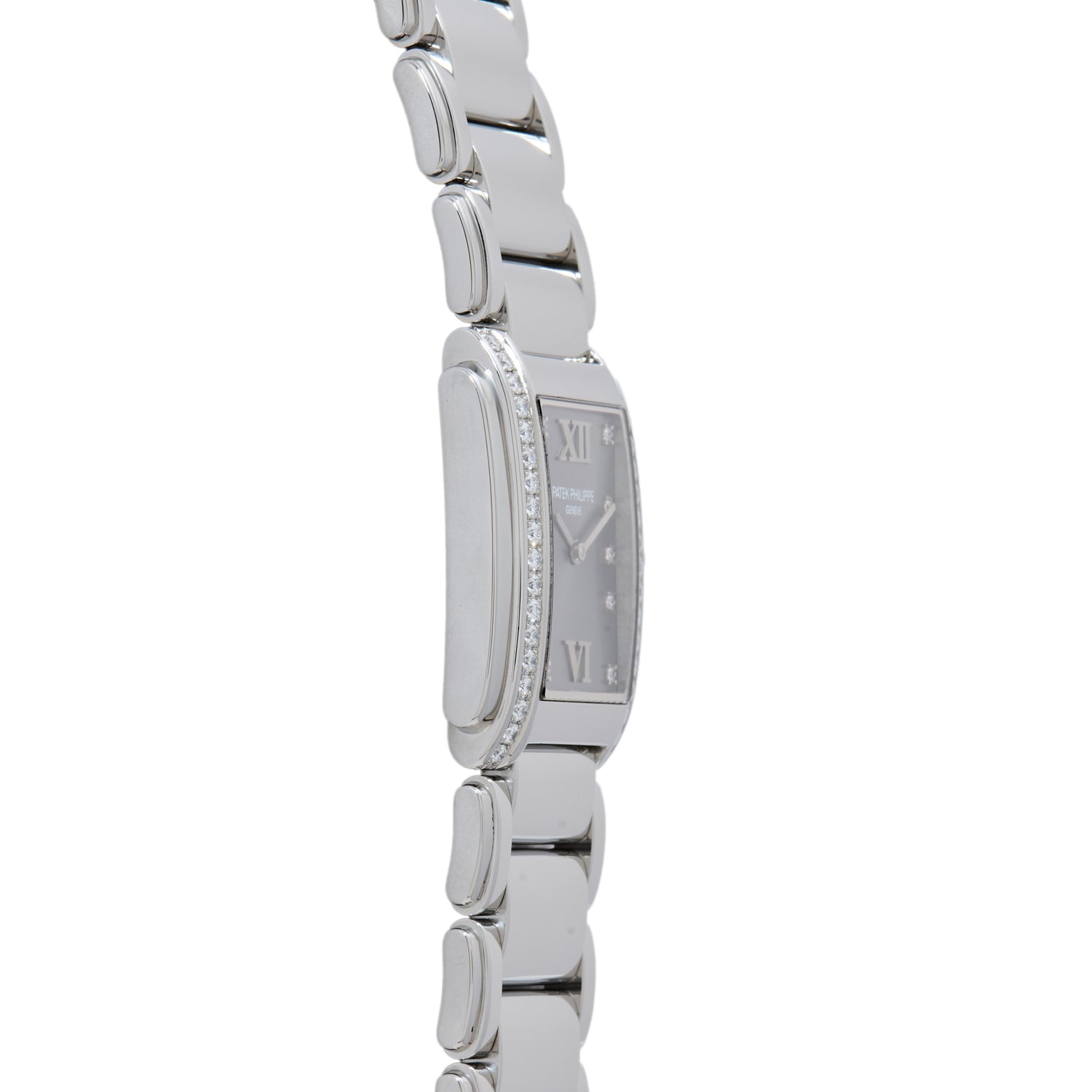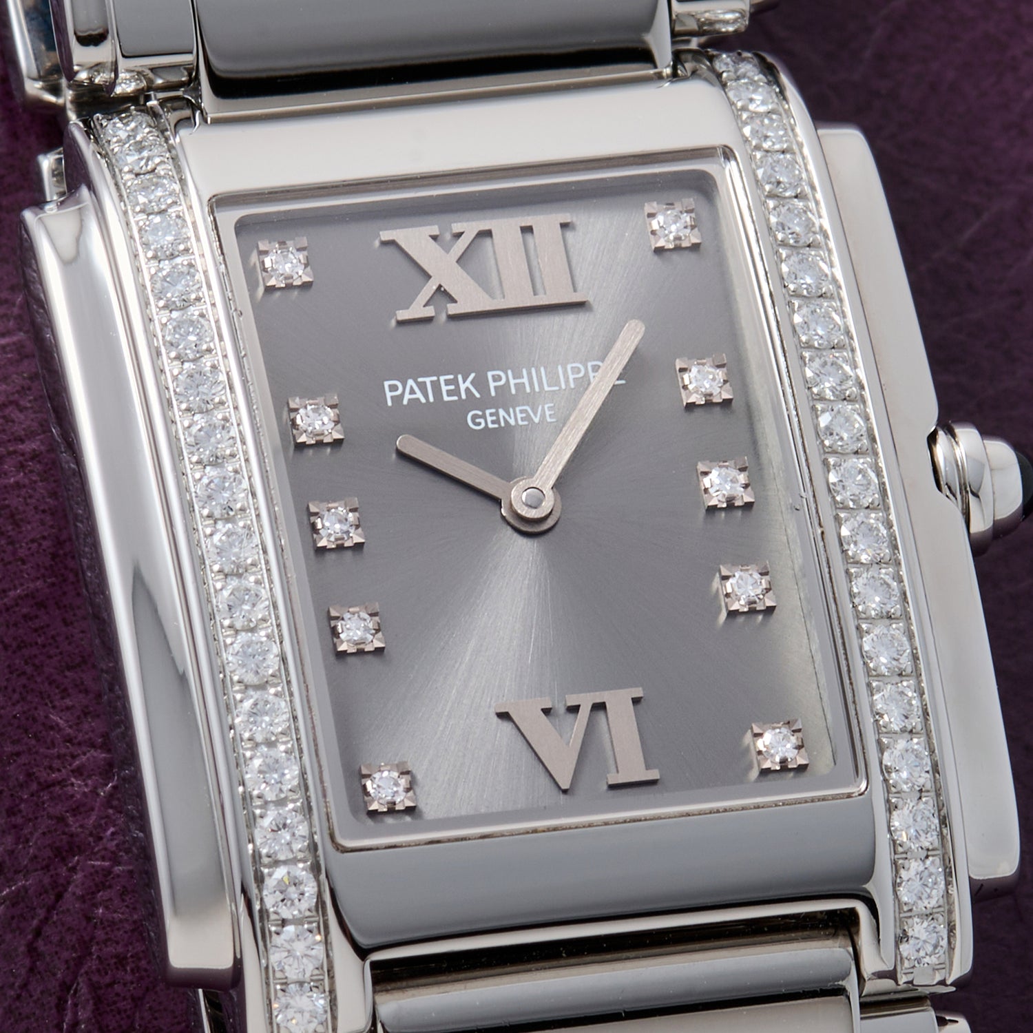 This particular Twenty-4, a Reference 4910/10A-010 from circa 2010s, features a 25mm, rectangular stainless steel case with, a Calatrava-signed crown, a polished and 0.47-carat diamond-decorated bezel, a sunburst grey dial with a matching handset, and a multi-link stainless steel bracelet with a signed, hidden deployant clasp.