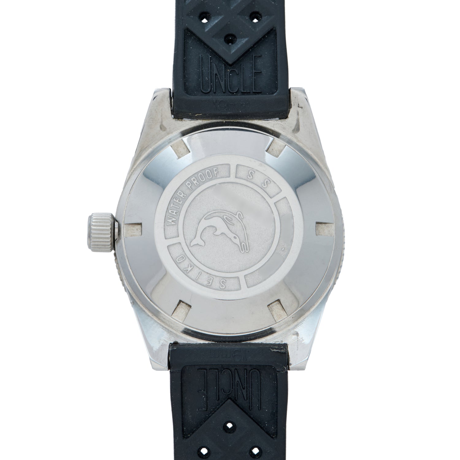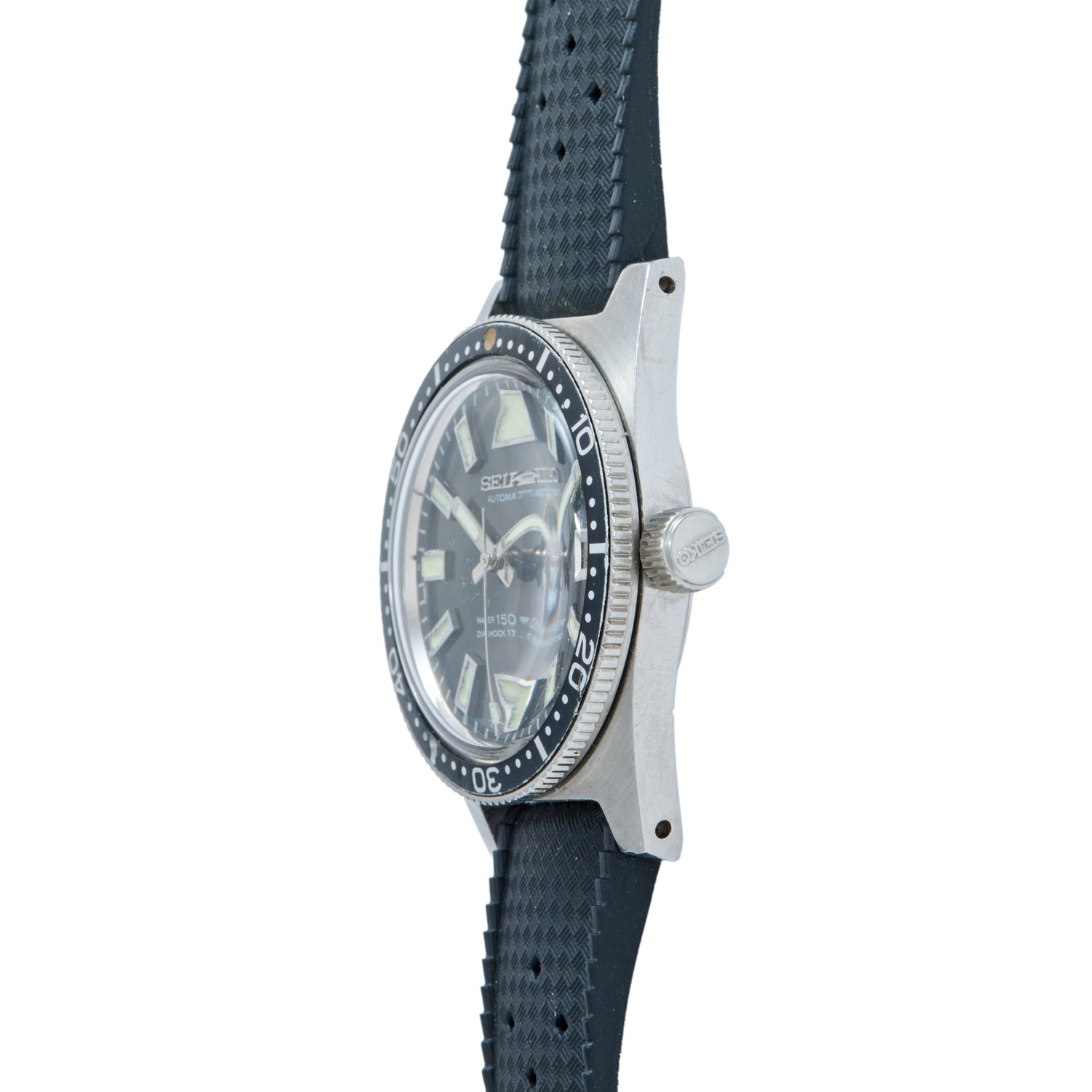 Accompanied by fully-graduated friction timing bezel, a domed crystal and a Seiko signed 'big crown', this piece features a fetching sunburst grey dial that has developed a charming patina that’s over 60 years in the making. All the Seiko dial hallmarks are present — bold luminous baton indices and a matching handset, as well as a framed date indicator at 3 o’clock.