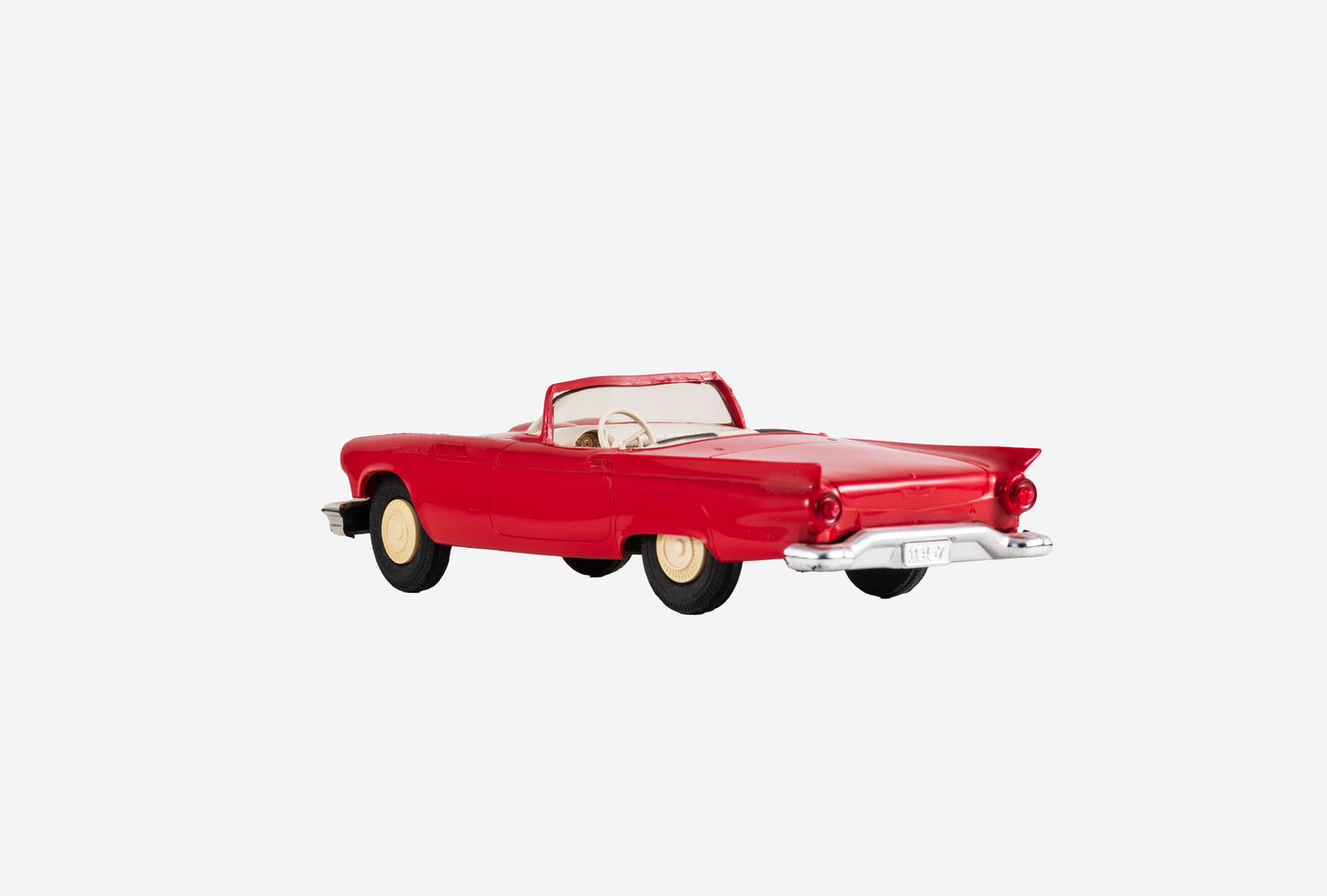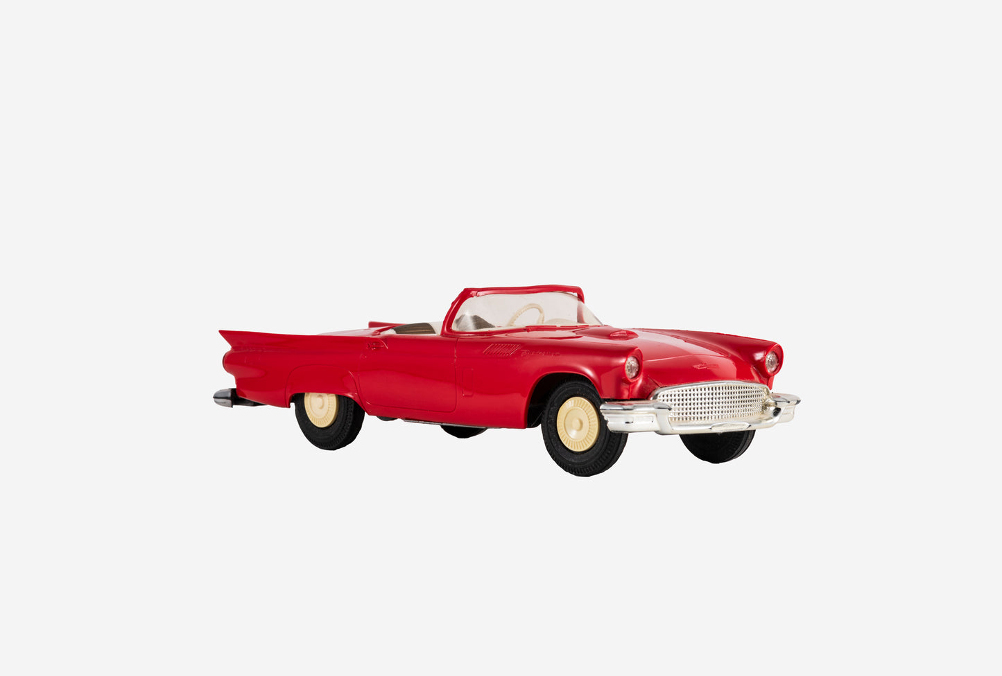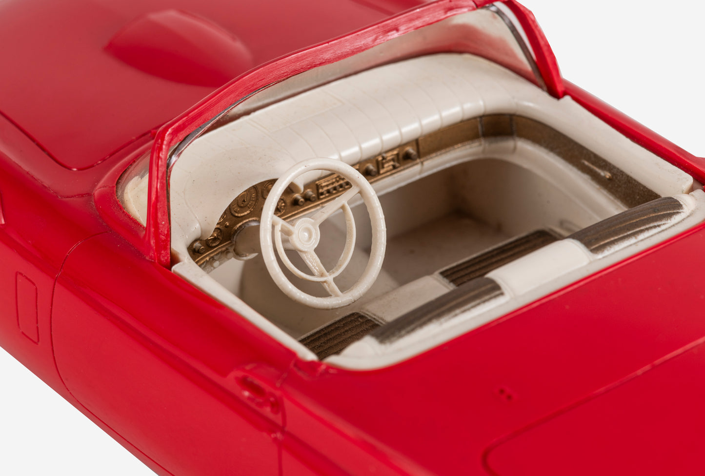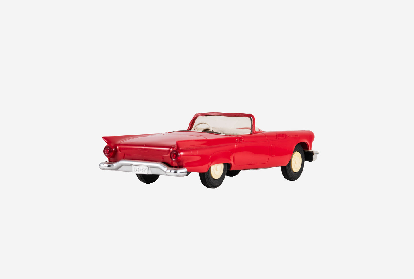 This particular dealer promo model car features a mechanical friction drive and is made in likeness of the 1957 Ford Thunderbird. It features a brilliant red exterior with the classic first series Thunderbird design cues, including a chrome grille and bumper guards, rear-wheel fender skirts, cream colored wheels and a signed “1957” license plate. The interior features two-tone accents complementing its charming silhouette.