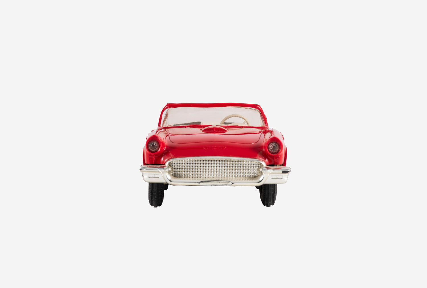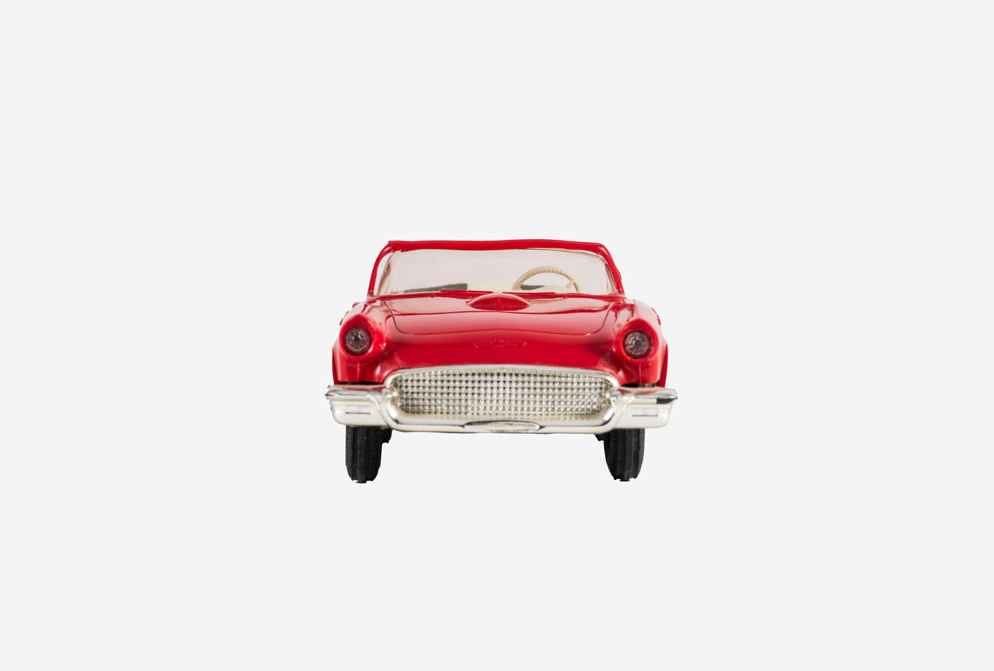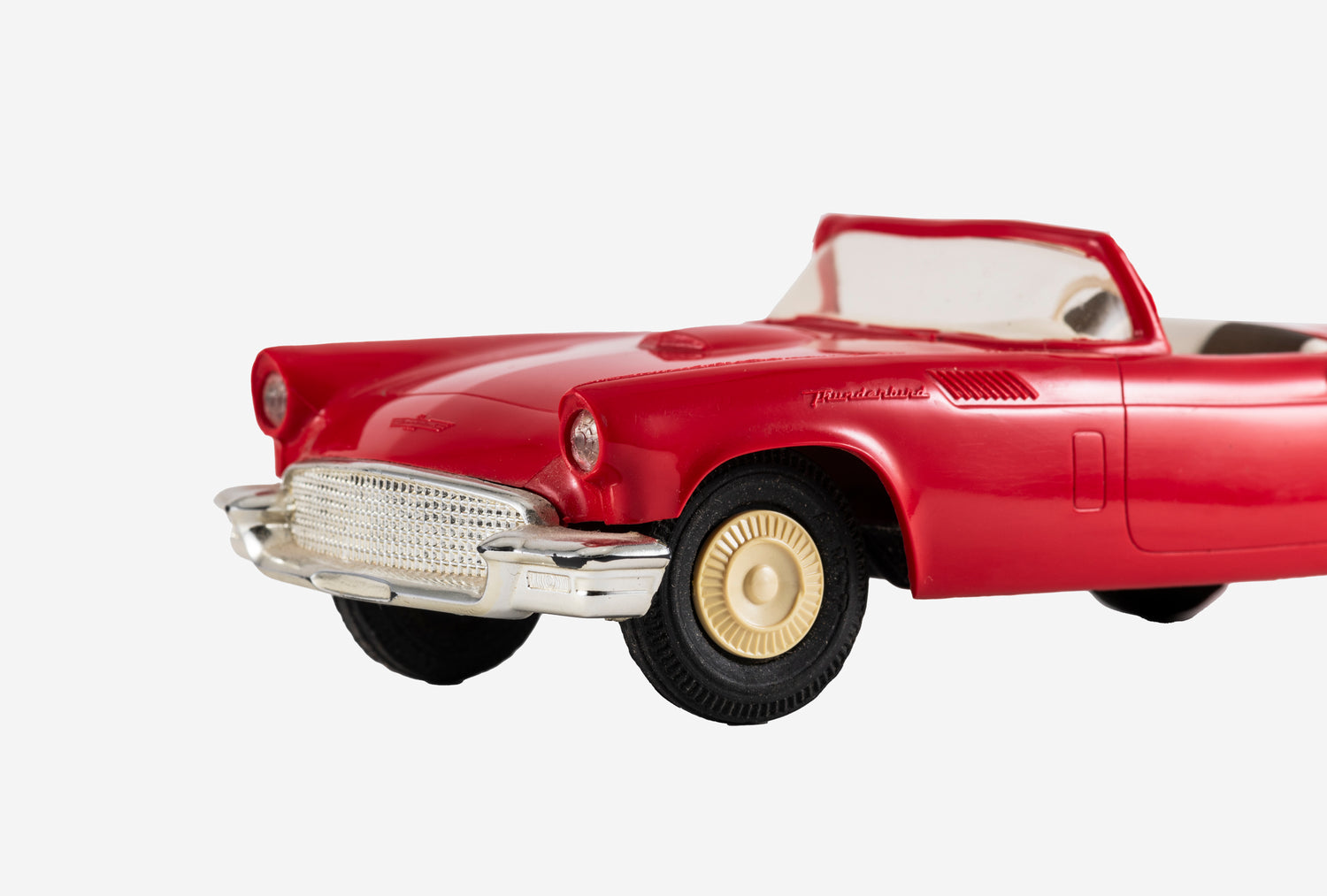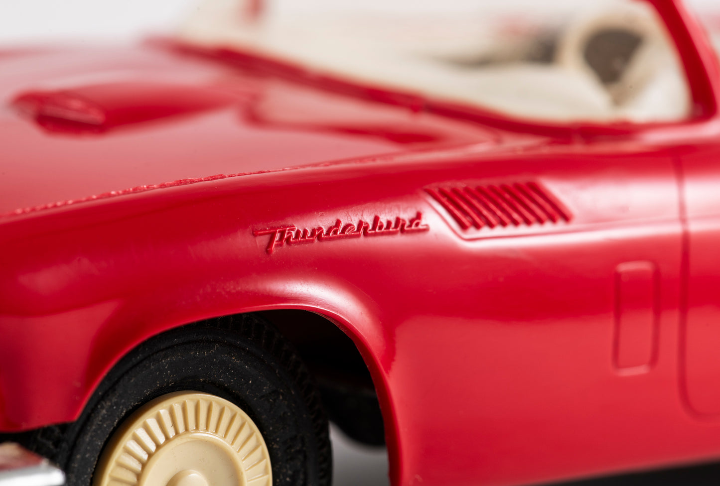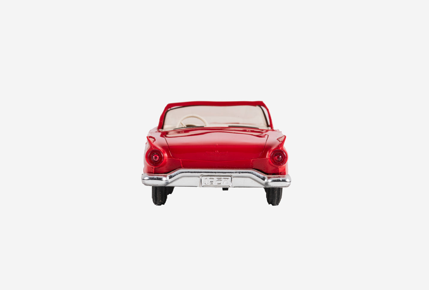 This particular dealer promo model car features a mechanical friction drive and is made in likeness of the 1957 Ford Thunderbird. It features a brilliant red exterior with the classic first series Thunderbird design cues, including a chrome grille and bumper guards, rear-wheel fender skirts, cream colored wheels and a signed “1957” license plate. The interior features two-tone accents complementing its charming silhouette.