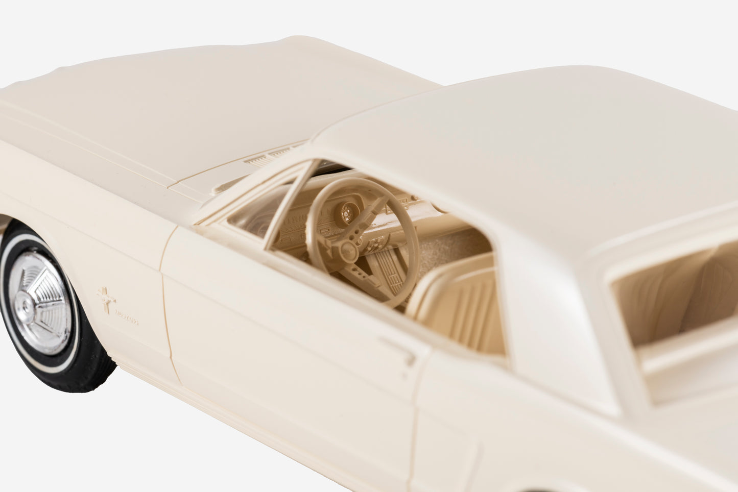 This particular dealer promo model is made in likeness to the 1965 Ford Mustang. It features a Wimbledon White exterior with the classic first-generation Mustang design cues including chrome accents on the grille, bumpers, and sequential taillights. The interior features loads of fine detailing.