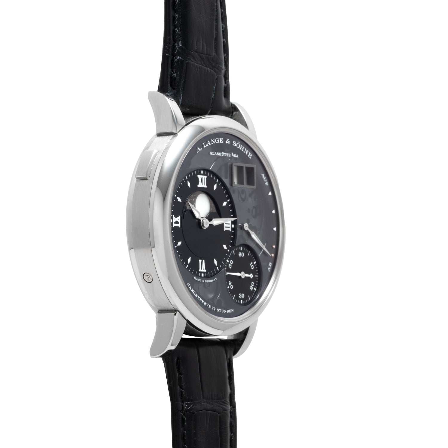 This particular watch, a Grand Lange 1, is a slightly upsized version of the classic. Dating to the 2010s, it features a 41mm platinum case, a sapphire crystal, a signed crown, a polished bezel, a smoked sapphire dial with matching 'alpha' handsets, moon phase indicator, and a sapphire exhibition case back. It’s fitted to a black alligator leather strap with a signed platinum pin buckle.