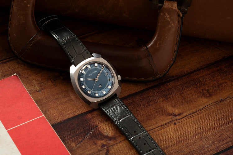 The matte blue-grey dial features applied 'wedge' hour indices, a matching handset, a date indicator at 3 o'clock, the Accutron 'tuning fork' logo above the 6 o'clock marker and a 'scientific' minute track for good measure.