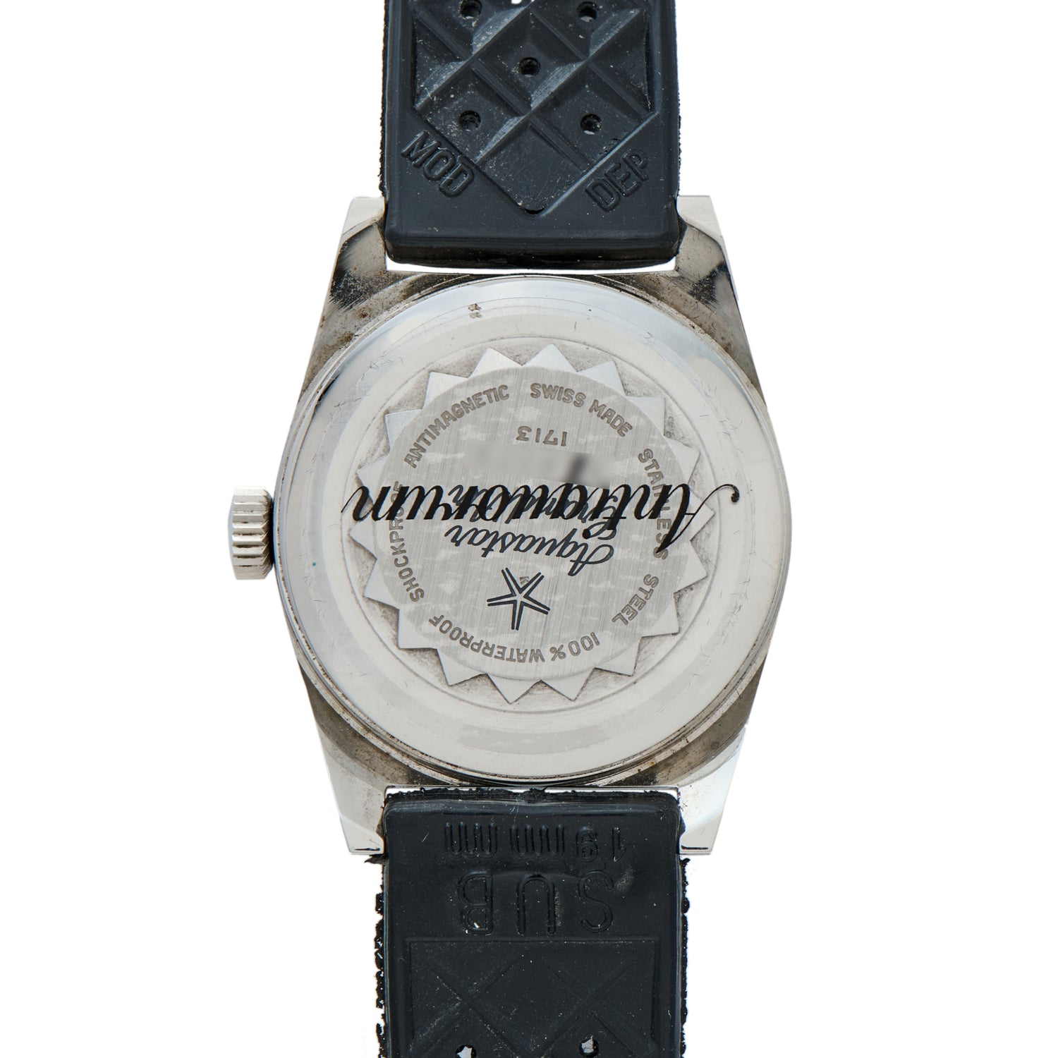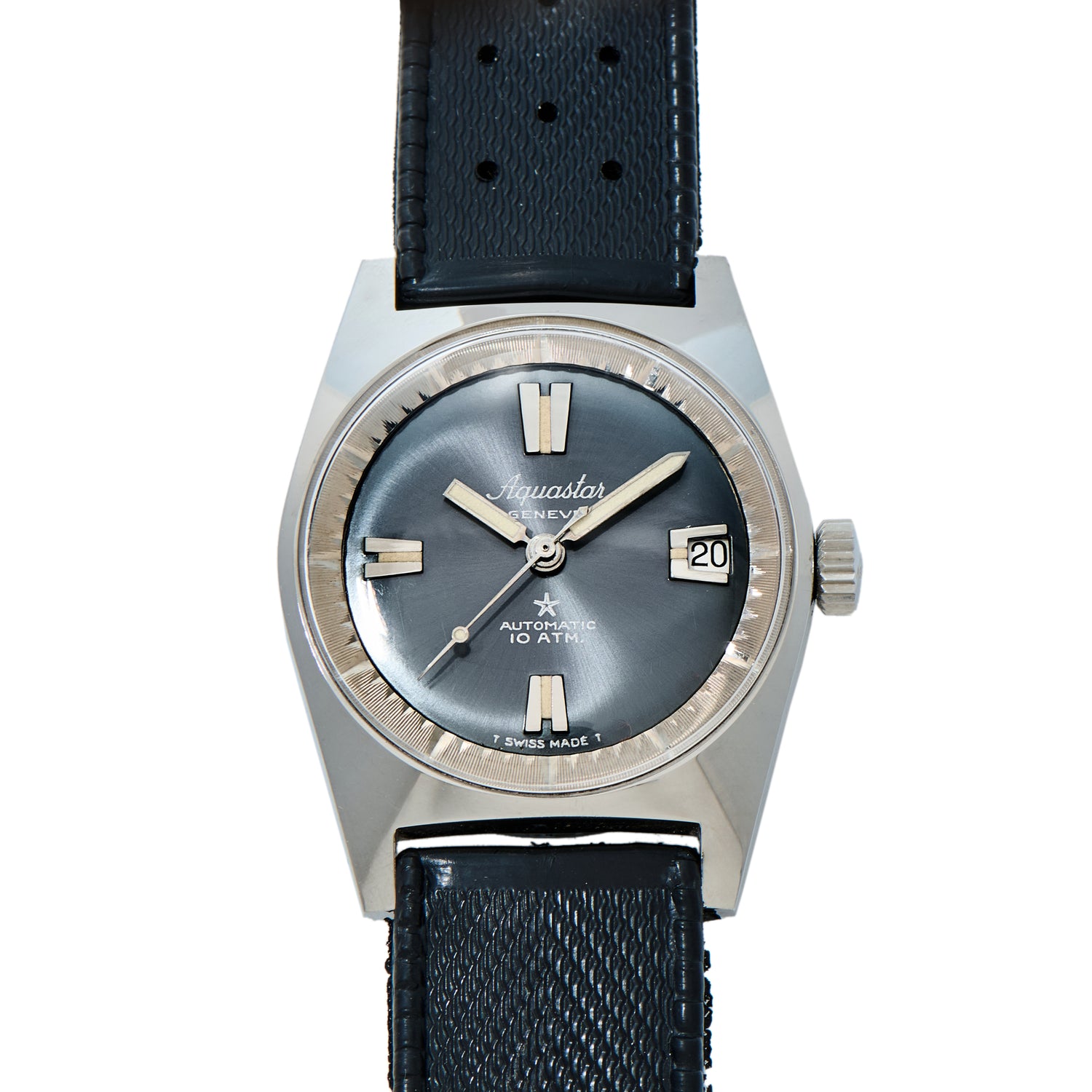 Featuring a standard 34mm waterproof stainless case that saw use in countless contract diving watches of the era, this lovely Aquastar Reference 1713 is fitted with a two piece sunburst Tritium dial, oversized applied indices at 6:00, 9:00, and 12:00, with an asymmetrical date window at 3 o'clock, a matching handset, a signed crown, and a beautiful domed acrylic crystal.